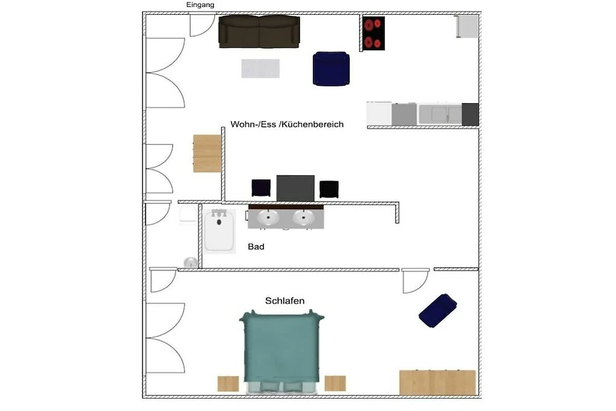 Parterre: (keuken(, , , eettafel, kookplaat, waterkoker, broodrooster, koffiezetapparaat, oven, afwasmachine, koelkast, vriezer, Keukenmachine), woon/eetkamer(, TV, eettafel), slaapkamer(, , 2-pers. bed, TV, radio), badkamer(, , toilet, sauna, ligbad, douche, wastafel, wasmachine, haardroger))
