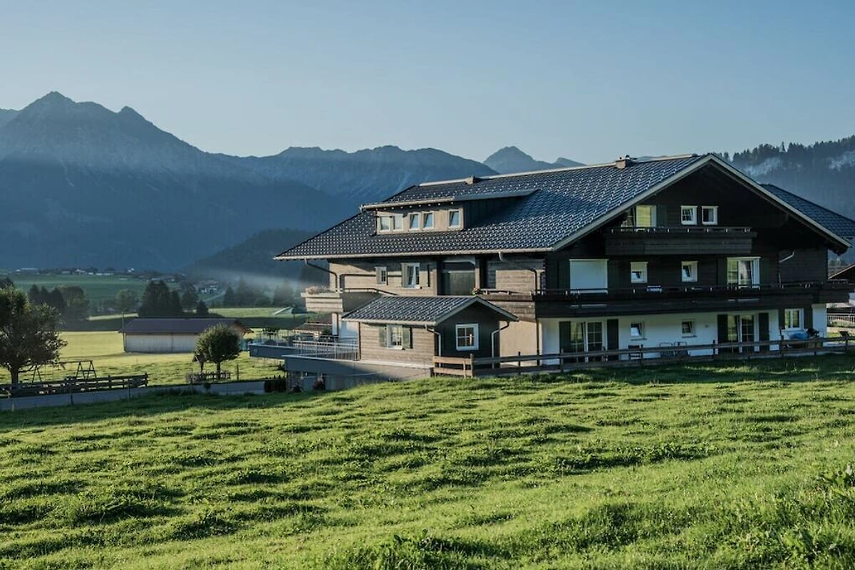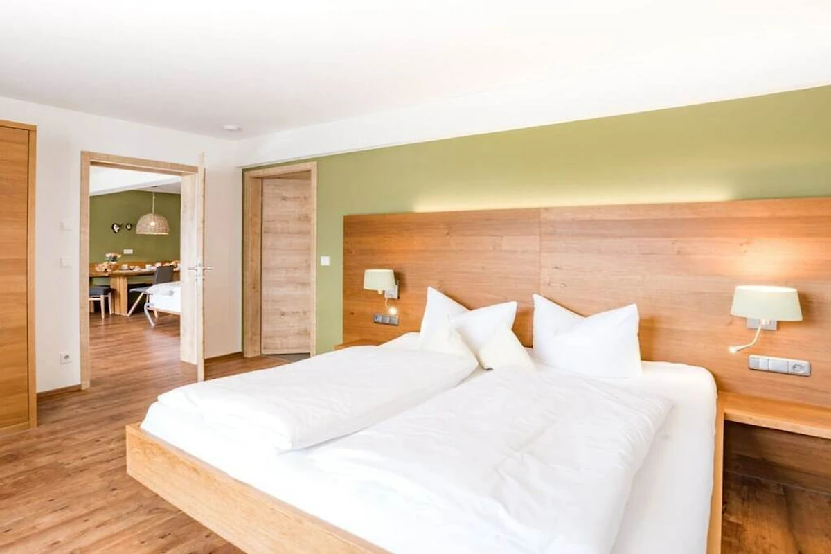 Vakantieappartement Wiesenblick (94 m²), ingericht in moderne landhuisstijl, bevindt zich op de begane grond met een terras op het zuidoosten en een vrij uitzicht op de bergen van de Oberallgäu. Het beschikt over een woonkamer met designvloer, een zithoek, een flatscreen-tv, een gezellige eethoek en een volledig uitgeruste keuken met alle moderne gemakken. Er zijn twee slaapkamers met een tweepersoonsbed en een eigen badkamer met douche/toilet. Het appartement is geschikt voor maximaal 6 personen.