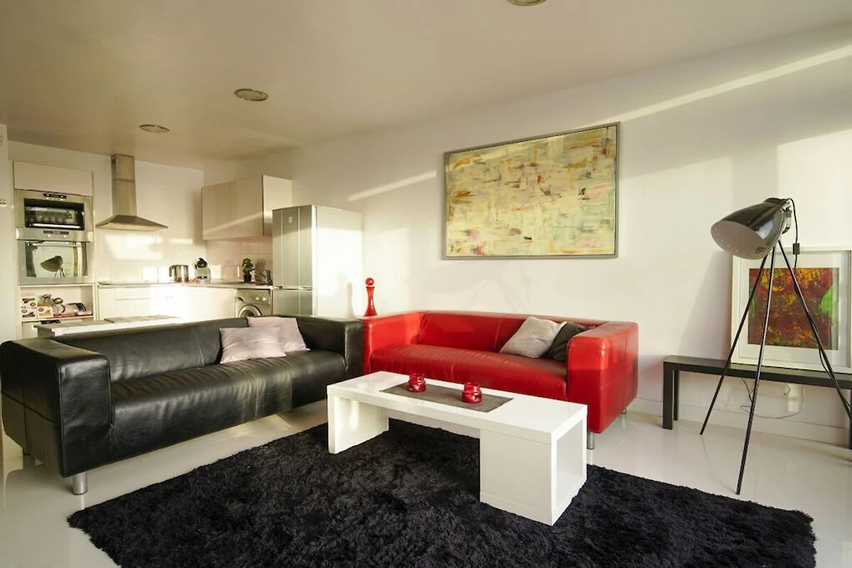 Het slaapgedeelte, elegant afgescheiden door een boxspringbed, voelt als een aparte ruimte. Het appartement is bereikbaar via een eigen trap en bevindt zich op de bovenste verdieping. De locatie is rustig en er is voldoende parkeergelegenheid.