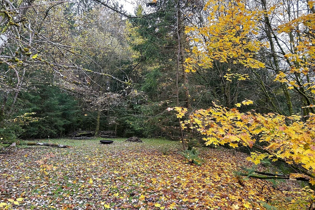 De woning is omringd door een uitgestrekte tuin die direct toegang biedt tot het omliggende bos, perfect voor lange wandelingen in de natuur. Voor gezellige avonden is er een vuurplaats waar je samen kunt genieten van een kampvuur en een overdekte grill hut om te barbecueën.