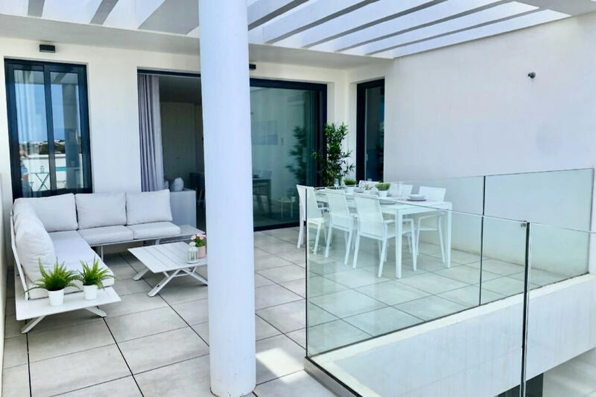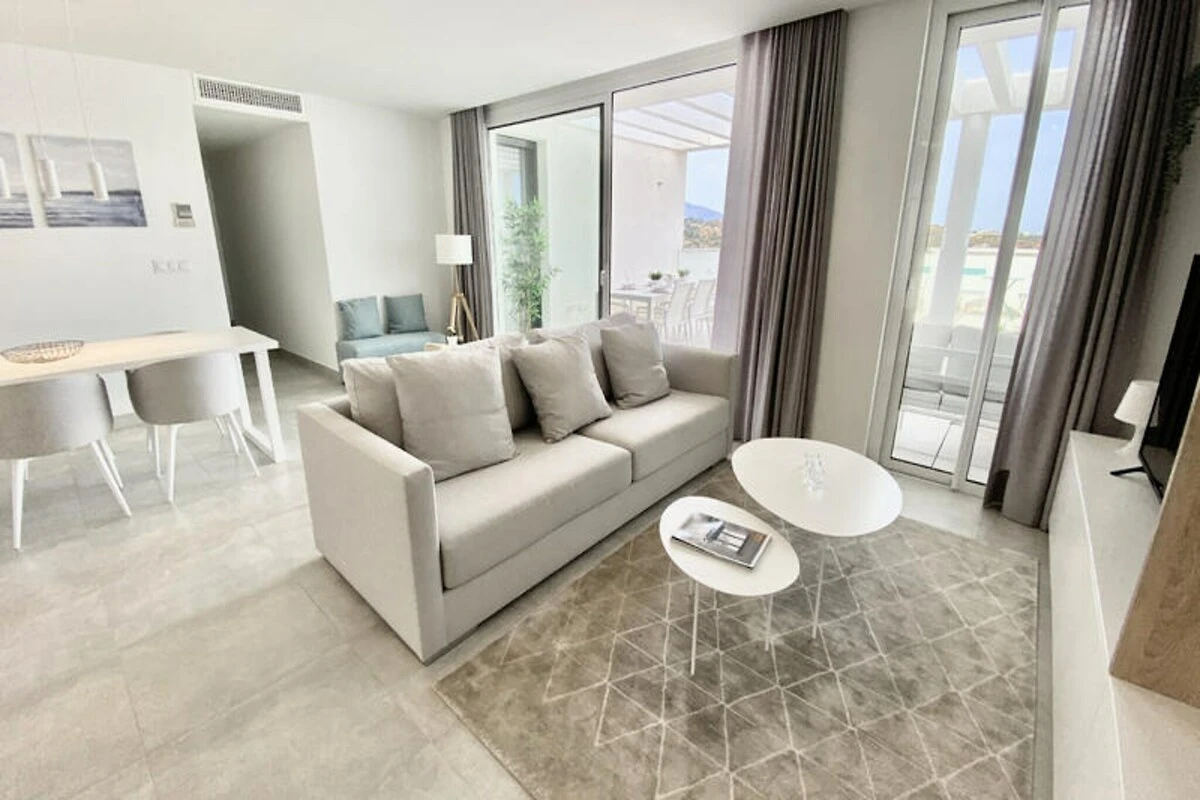 Binnenin beschikt het appartement over een verfijnd design met drie ruime slaapkamers en twee badkamers, waaronder een luxe master suite met kleedkamer en en-suite badkamer. De open woonkamer loopt naadloos over in het hoofdterras, waar een comfortabele lounge en eetkamer wachten, perfect om buiten te eten of te ontspannen met een glas wijn. Een tweede zonnig terras met ligstoelen nodigt je uit om in volledige privacy te genieten van de Andalusische zon.