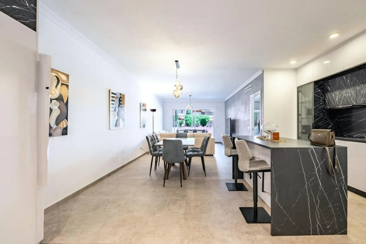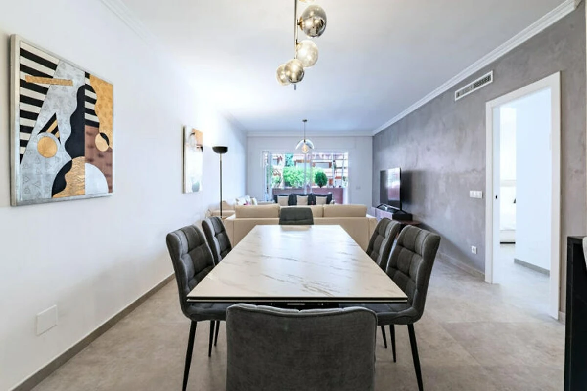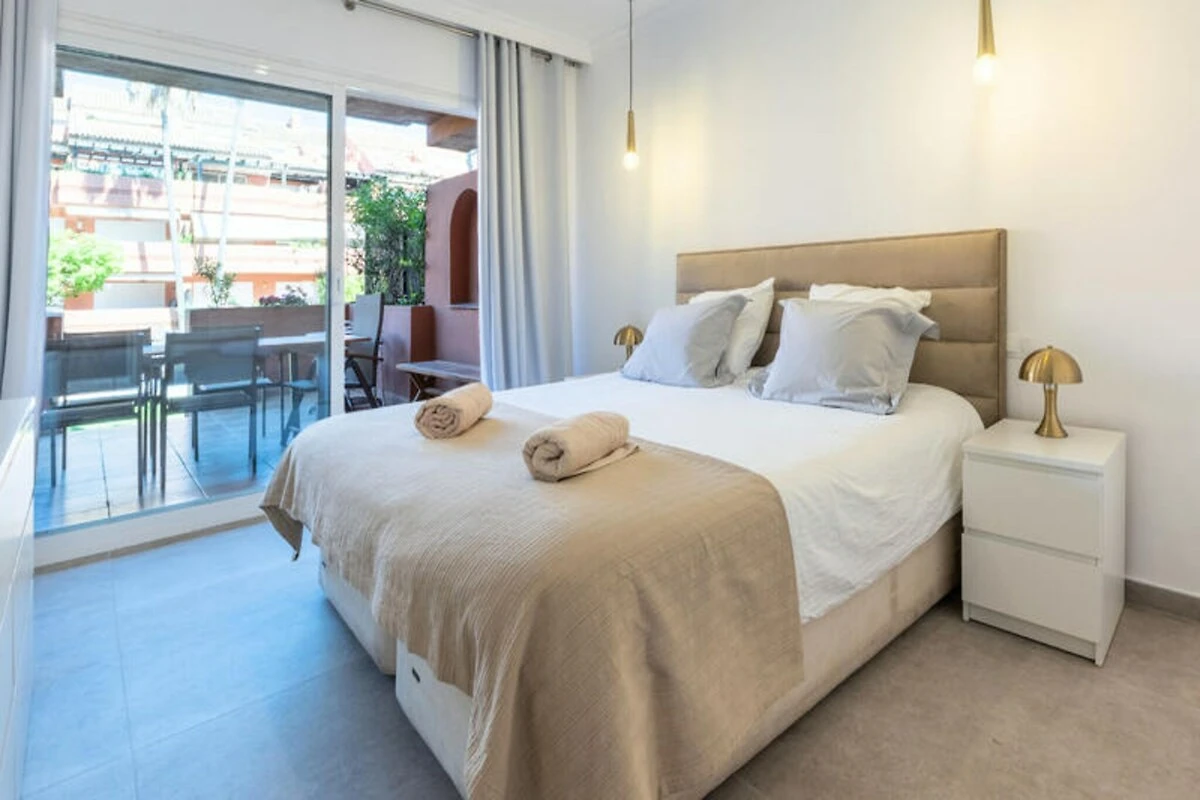 Stap in een wereld van elegantie en ontspanning in dit moderne, onlangs gerenoveerde appartement in de prestigieuze residentie El Embrujo Playa, vlakbij Puerto Banús. Perfect geschikt voor gezinnen, stellen of kleine groepen. Deze accommodatie op de begane grond combineert een moderne stijl met een onovertroffen locatie op slechts 700 meter van het gouden zand van de Middellandse Zee. Of u nu op zoek bent naar een rustige ontsnapping of een bruisend nachtleven, deze accommodatie biedt het beste van twee werelden. Het appartement beschikt over drie ruime slaapkamers en drie badkamers, waardoor comfort en privacy voor alle gasten gegarandeerd zijn. De hoofdslaapkamer is voorzien van een smart-tv, terwijl alle slaapkamers voldoende opbergruimte bieden met ingebouwde kasten. De open keuken, compleet met een stijlvol kookeiland en moderne apparatuur, nodigt u uit om thuis heerlijke maaltijden te bereiden. De lichte en luchtige woon- en eetkamer komt uit op een gemeubileerd privéterras met directe toegang tot weelderige gemeenschappelijke tuinen en schitterende zwembaden – ideaal om buiten te ontspannen of te genieten van tijd met het gezin. Centrale airconditioning en snelle wifi zorgen voor een zorgeloos en comfortabel verblijf. El Embrujo Playa is een gated community die bekend staat om zijn serene sfeer, uitgestrekte tuinen en veilige wandelpaden, waardoor het perfect is voor gezinnen met kinderen. Buiten de residentie wacht de glamour van Puerto Banús met luxe boetieks, gastronomische restaurants en levendige strandclubs zoals Ocean Club en Sala Beach. Voor een meer relaxte ervaring kunt u naar het nabijgelegen San Pedro Alcántara wandelen of genieten van Andalusische zeevruchten bij lokale chiringuitos. Of u nu een romantisch uitje, een gezinsvakantie of een langer verblijf plant, dit appartement biedt een harmonieuze mix van comfort, stijl en een toplocatie. Creëer onvergetelijke herinneringen in Marbella, waar de mediterrane bries en Andalusische charme de basis vormen voor uw perfecte vakantie.