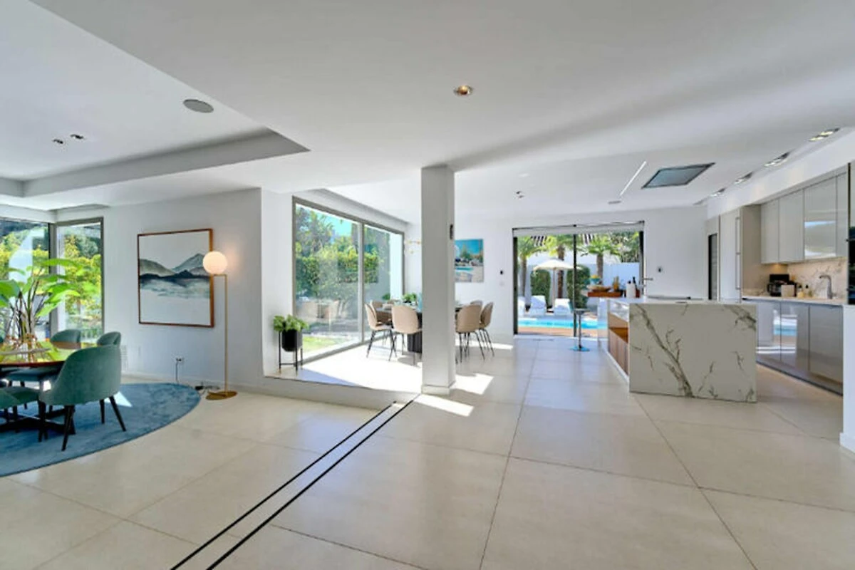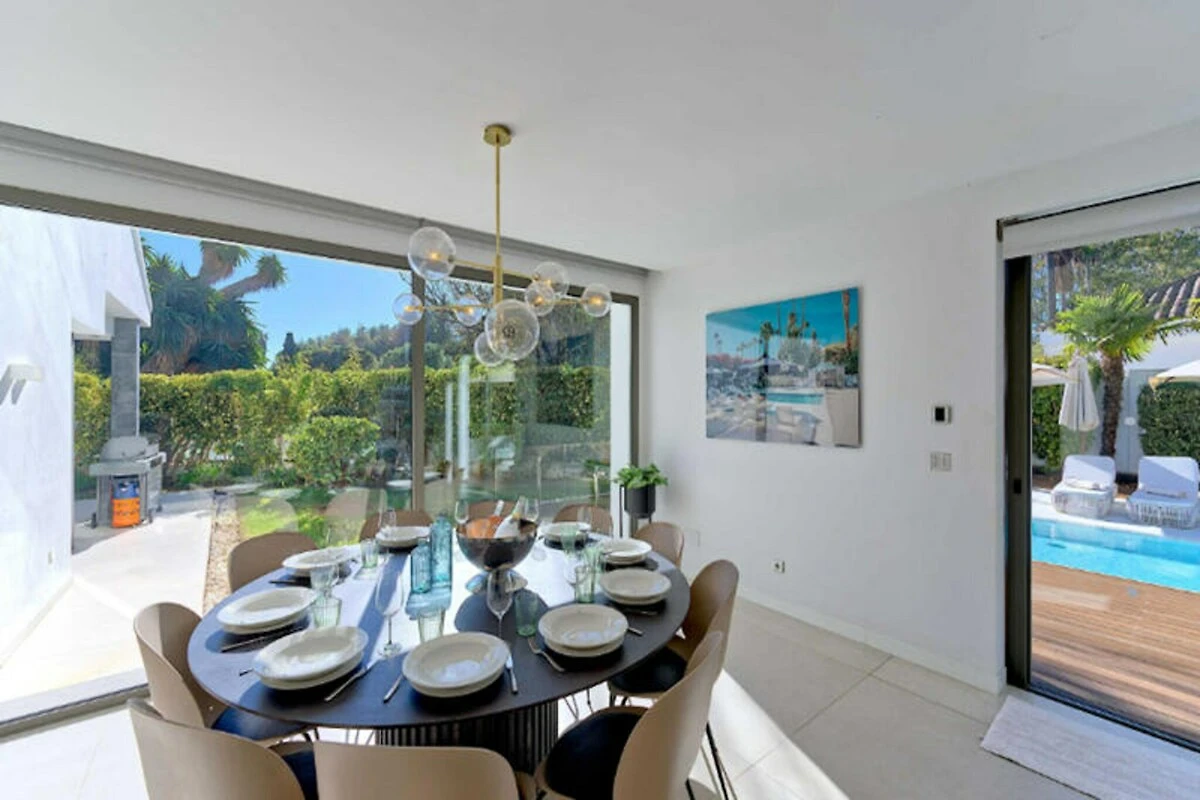 In het hart van Puerto Banús, waar luxe en de bruisende mediterrane levensstijl samenkomen, biedt deze moderne villa een ongeëvenaarde vakantie-ervaring. Stelt u zich eens voor dat u wakker wordt met het zachte geritsel van palmbomen en de zonovergoten rust van uw privétuin, compleet met een verwarmd zwembad. Op slechts een steenworp afstand van de glamoureuze jachthaven, ongerepte stranden en designerboetieks, is deze villa een toevluchtsoord voor gezinnen en stellen die op zoek zijn naar zowel ontspanning als spanning. Het semi-omheinde complex garandeert rust en veiligheid, terwijl een eigen ingang gemakkelijke toegang biedt tot het nabijgelegen strand. Stap binnen in deze onlangs verbouwde villa, ontworpen volgens de hoogste normen van moderne luxe. De ruime woon- en eetkamer, aangevuld met een designkeuken met kookeiland, creëert een uitnodigende ruimte voor familiebijeenkomsten. Ramen van vloer tot plafond zorgen voor een naadloze overgang van binnen naar buiten en vullen het huis met natuurlijk licht. De begane grond beschikt over een gezellige woonkamer, een gastentoilet en een badkamer met een inloopdouche. Boven beschikt de hoofdslaapkamer over een en-suite badkamer, een binnenjacuzzi en een privéterras dat leidt naar een Finse sauna, een oase van ontspanning. \n\nVerken buiten de villa de betoverende witte dorpjes van Andalusië, zoals Istán, Casares, Mijas en Ronda, elk boordevol charme en geschiedenis. Voor wie op zoek is naar avontuur, zijn luxe services zoals jachtverhuur, privéchauffeurs en helikoptertours op aanvraag beschikbaar. \n\nOf u nu ontspant bij het zwembad, langs de jachthaven wandelt of de schoonheid van Andalusië ontdekt, deze villa belooft een onvergetelijke mix van comfort, elegantie en gemak. Perfect voor gezinnen en stellen, dit is uw toegangspoort tot de ultieme mediterrane ontsnapping.