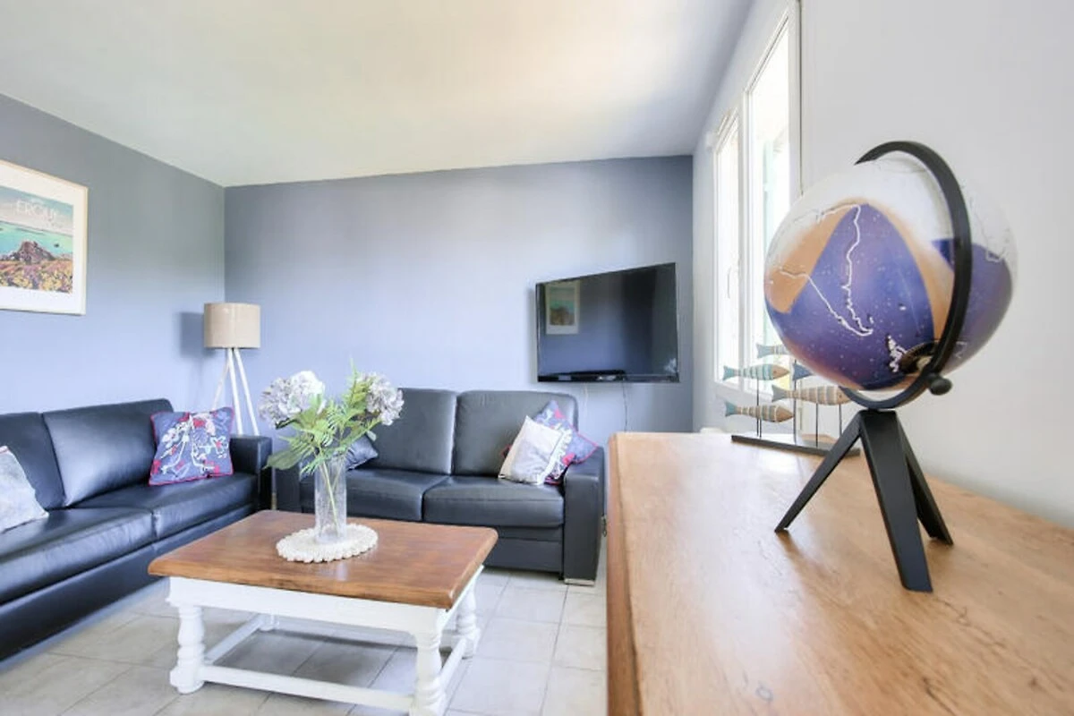 In het charmante kustplaatsje Erquy, waar het smaragdgroene water en het gouden zand samenkomen, biedt dit prachtig gerenoveerde huis voor 10 gasten een oase van rust voor zowel gezinnen als vrienden. Stel je voor dat je wakker wordt met de zachte geluiden van de natuur, geniet van een ontbijt in de ruime buitenruimte of ontspant met een goed boek terwijl de zeebries om je heen danst. Het huis is gelegen in een rustige omgeving, maar toch gunstig gelegen ten opzichte van het bruisende stadscentrum en de ongerepte stranden die Erquy tot een geliefde bestemming maken.