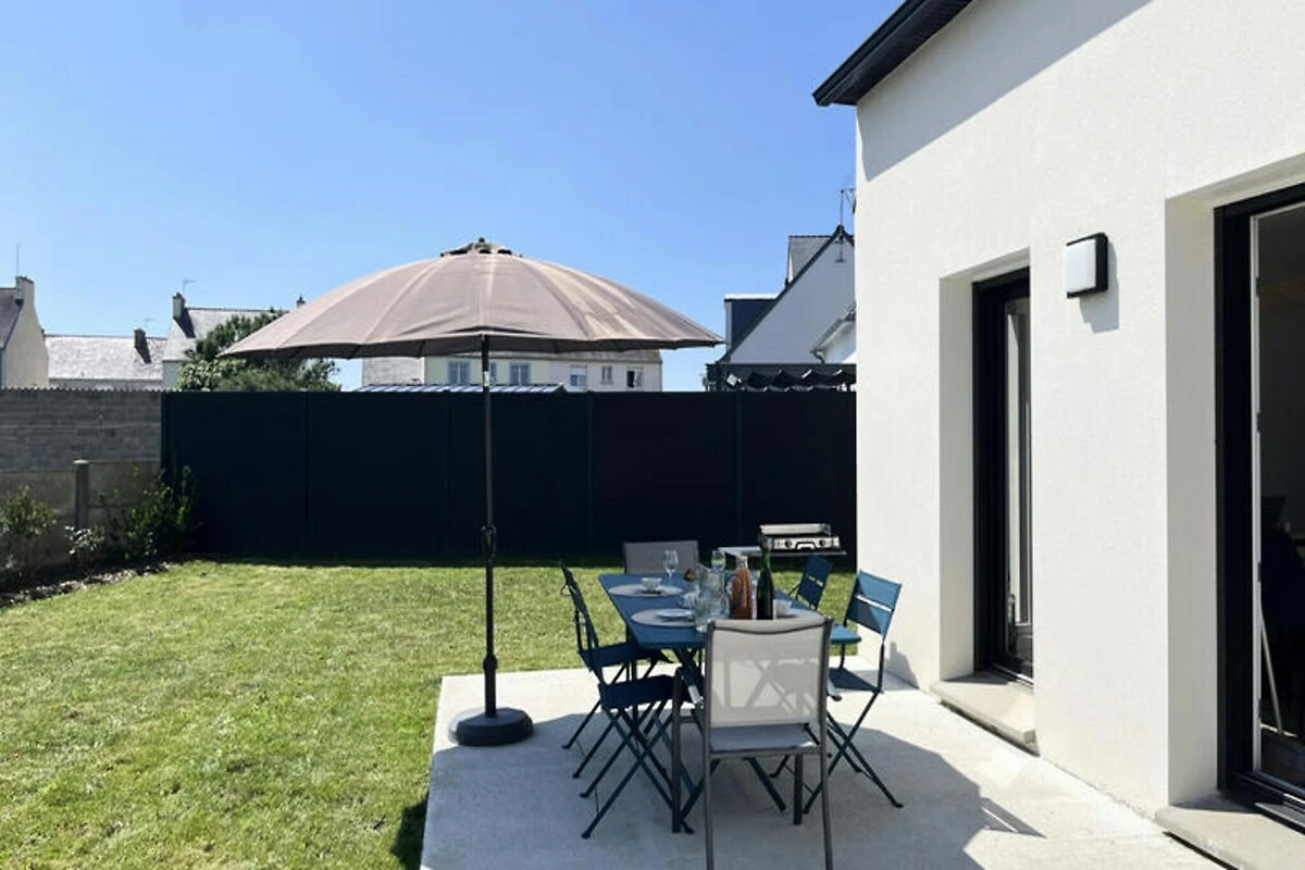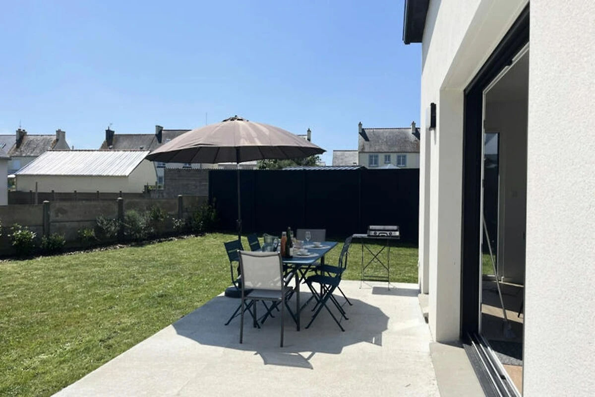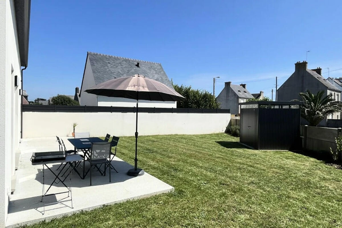 Tussen het goudgele zand van het strand van Pors Carn en de charmante vissershaven van Saint-Guénolé nodigt dit moderne Bretonse huis u uit voor een perfecte vakantie aan de kust. Hier ontmoeten het ritme van de getijden de bruisende energie van het lokale leven, met kleurrijke vissersboten, bruisende markten en de geur van de Atlantische bries die een onvergetelijke sfeer creëren. Of u nu een surfliefhebber bent, een zonaanbidder of gewoon op zoek bent naar een serene retraite, deze locatie biedt het allemaal. Stap binnen in dit prachtig ingerichte huis, waar eigentijds design en comfort samenkomen. De open woonkamer vormt het hart van het huis en biedt een gastvrije ruimte voor familiebijeenkomsten of rustige avonden. De volledig uitgeruste keuken, compleet met inductiekookplaat, oven, magnetron en vaatwasser, maakt het bereiden van maaltijden een plezier. Geniet van maaltijden aan de eettafel of ontspan in de gezellige woonkamer met zijn felblauwe bank en kleurrijke accenten. Met vier slaapkamers, waaronder een rustige slaapkamer met queensize bed op de begane grond en drie kamers op de bovenverdieping met een tweepersoonsbed en eenpersoonsbedden, biedt het huis comfortabel plaats aan maximaal acht gasten. \n\nBuiten is de nieuw aangelegde tuin een oase voor zonnige ontbijtjes, speelse middagen of rustige momenten op een ligstoel. Extra voorzieningen zijn onder andere twee badkamers, een wasmachine, droger, balkon en buitenparkeerplaatsen, voor een zorgeloos verblijf. \n\nGelegen op slechts 950 meter van het strand van Pors Carn en dicht bij lokale restaurants en winkels, is dit huis perfect gelegen om het beste van Zuid-Bretagne te verkennen. Ontdek de historische charme van het nabijgelegen Locronan en Quimper, of kom gewoon tot rust aan de ruige kustlijn. Met wifi en een toegewijde conciërgeservice wordt elk detail van uw verblijf verzorgd. Dit is uw kans om uzelf onder te dompelen in de schoonheid en cultuur van Bretagne en herinneringen te creëren die een leven lang meegaan.