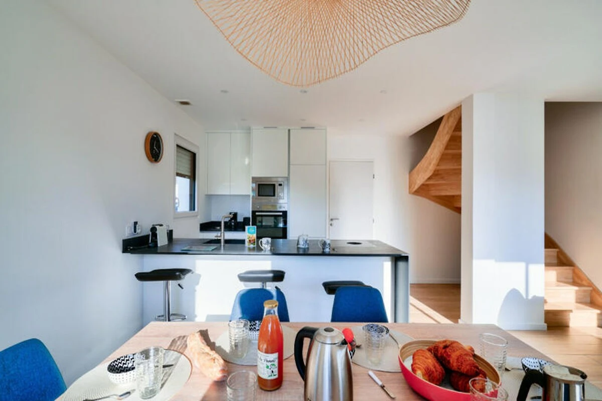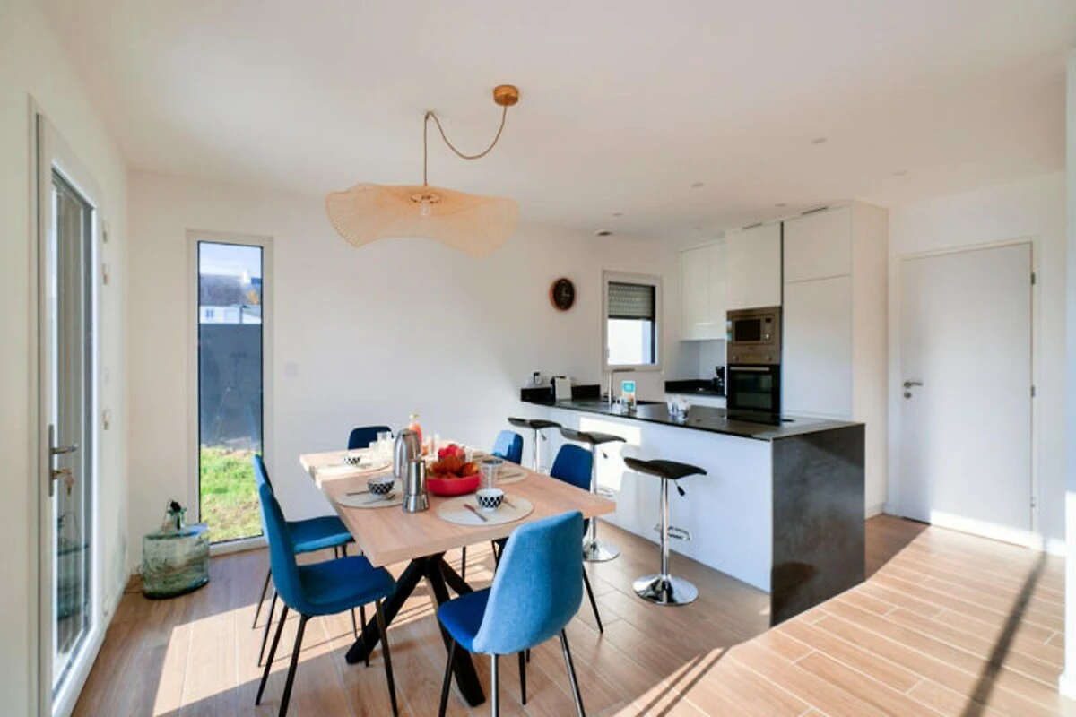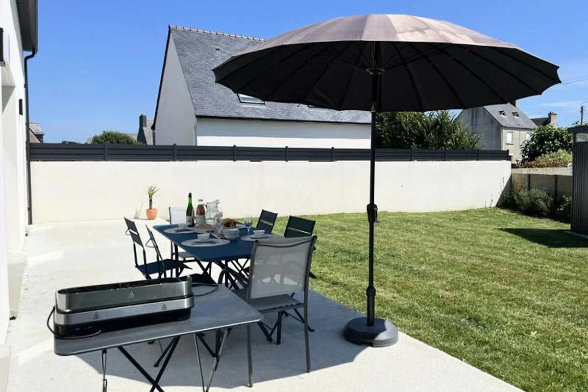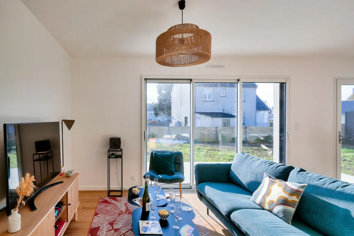 Tussen het goudgele zand van het strand van Pors Carn en de charmante vissershaven van Saint-Guénolé nodigt dit moderne Bretonse huis u uit voor een perfecte vakantie aan de kust. Hier ontmoeten het ritme van de getijden de bruisende energie van het lokale leven, met kleurrijke vissersboten, bruisende markten en de geur van de Atlantische bries die een onvergetelijke sfeer creëren. Of u nu een surfliefhebber bent, een zonaanbidder of gewoon op zoek bent naar een serene retraite, deze locatie biedt het allemaal. Stap binnen in dit prachtig ingerichte huis, waar eigentijds design en comfort samenkomen. De open woonkamer vormt het hart van het huis en biedt een gastvrije ruimte voor familiebijeenkomsten of rustige avonden. De volledig uitgeruste keuken, compleet met inductiekookplaat, oven, magnetron en vaatwasser, maakt het bereiden van maaltijden een plezier. Geniet van maaltijden aan de eettafel of ontspan in de gezellige woonkamer met zijn felblauwe bank en kleurrijke accenten. Met vier slaapkamers, waaronder een rustige slaapkamer met queensize bed op de begane grond en drie kamers op de bovenverdieping met een tweepersoonsbed en eenpersoonsbedden, biedt het huis comfortabel plaats aan maximaal acht gasten. \n\nBuiten is de nieuw aangelegde tuin een oase voor zonnige ontbijtjes, speelse middagen of rustige momenten op een ligstoel. Extra voorzieningen zijn onder andere twee badkamers, een wasmachine, droger, balkon en buitenparkeerplaatsen, voor een zorgeloos verblijf. \n\nGelegen op slechts 950 meter van het strand van Pors Carn en dicht bij lokale restaurants en winkels, is dit huis perfect gelegen om het beste van Zuid-Bretagne te verkennen. Ontdek de historische charme van het nabijgelegen Locronan en Quimper, of kom gewoon tot rust aan de ruige kustlijn. Met wifi en een toegewijde conciërgeservice wordt elk detail van uw verblijf verzorgd. Dit is uw kans om uzelf onder te dompelen in de schoonheid en cultuur van Bretagne en herinneringen te creëren die een leven lang meegaan.