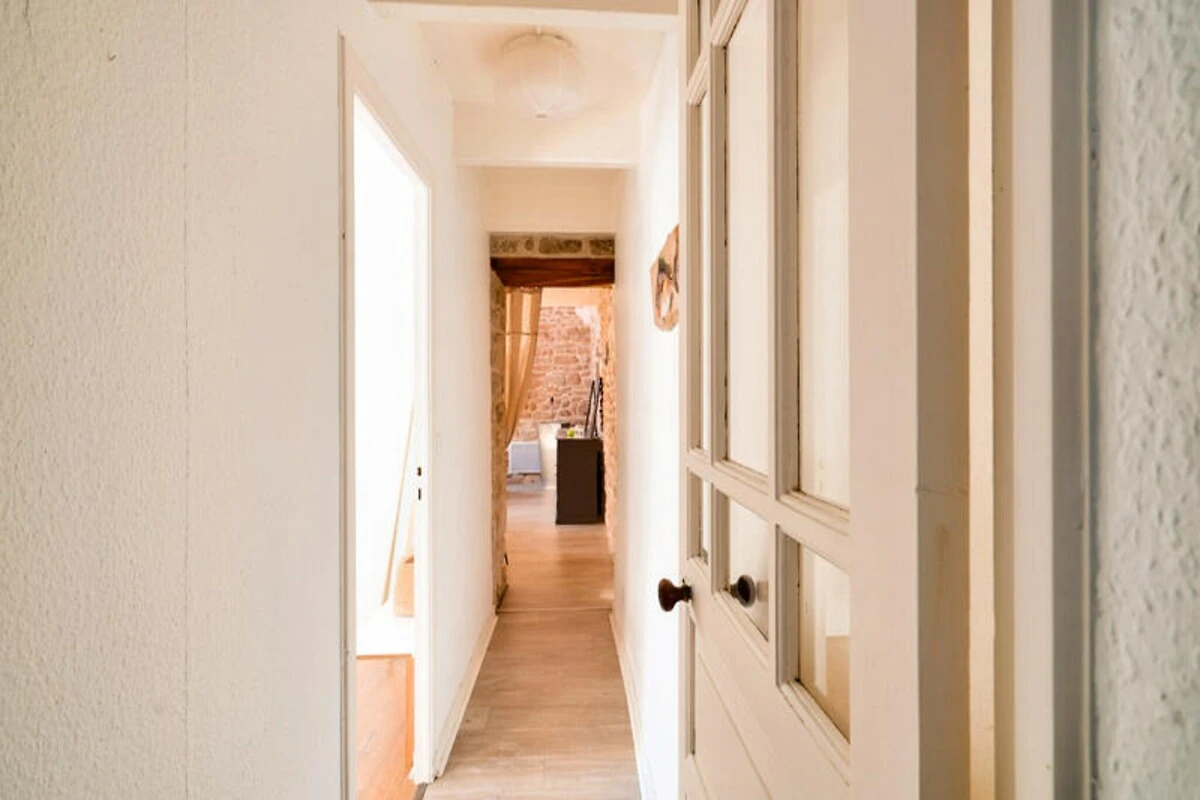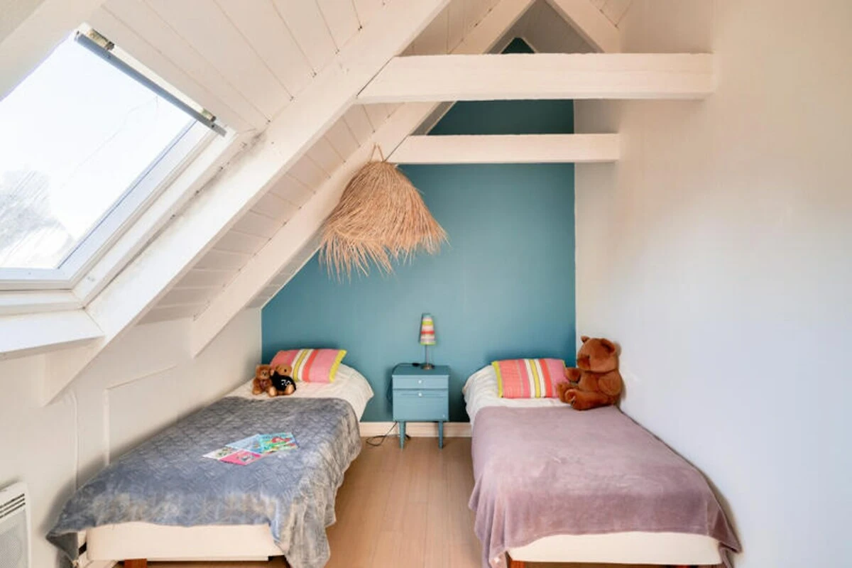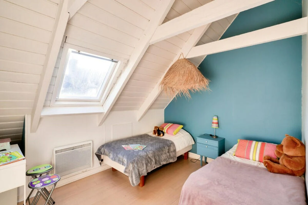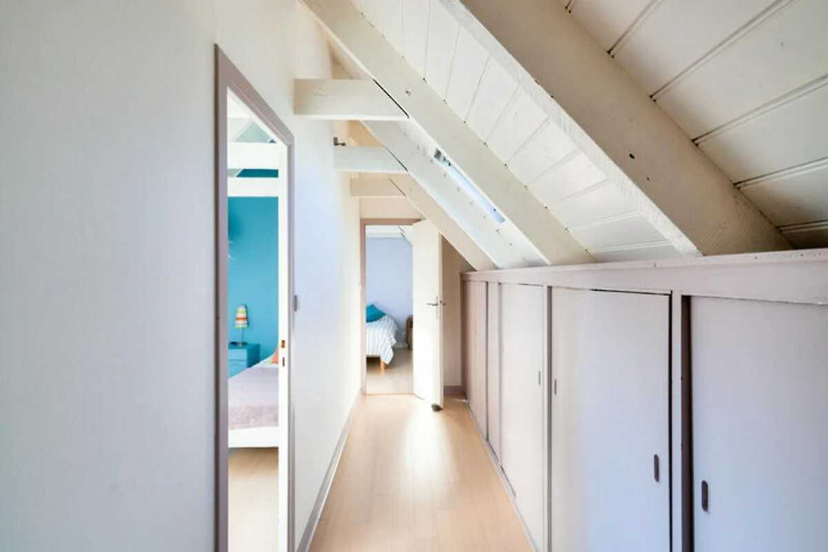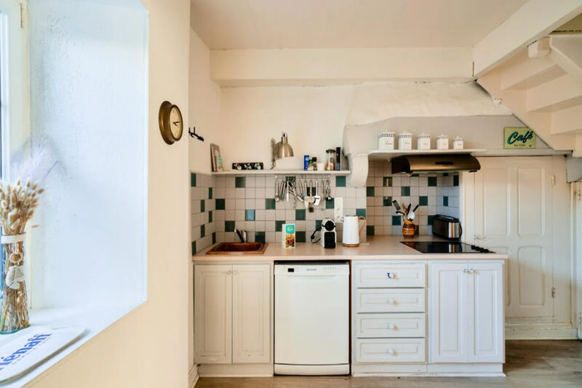 Binnen beschikt de woning over een gezellige woonkamer met stenen muren en een houtkachel, wat een heerlijke plek is voor koude avonden. De aparte woonkeuken is volledig uitgerust met moderne apparatuur, waaronder inductiekookplaten, een Nespresso-apparaat en een grote tafel, perfect om samen met uw dierbaren te eten. Een mezzanine boven de woonkamer biedt een rustige plek om te lezen of te werken. Het huis biedt plaats aan maximaal vijf gasten, verdeeld over drie slaapkamers: een kamer op de begane grond met een op de kust geïnspireerde inrichting en een kingsize bed, een lavendelkleurige oase op de bovenverdieping met een kingsize bed en een vrolijke kamer met twee eenpersoonsbedden, ideaal voor kinderen.