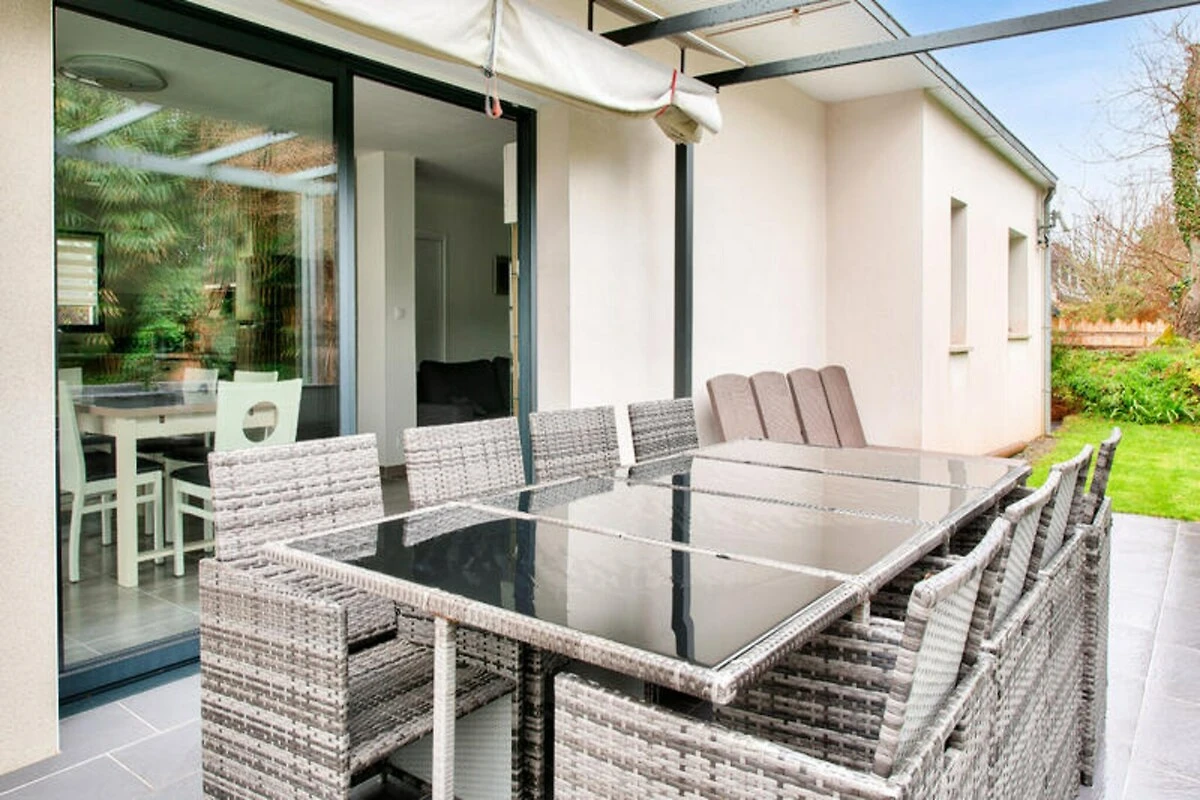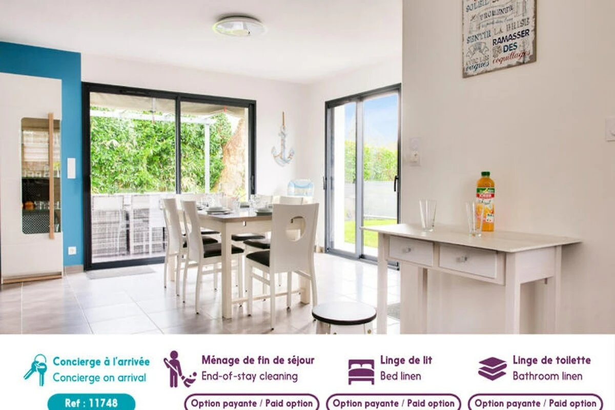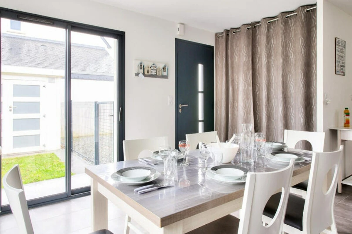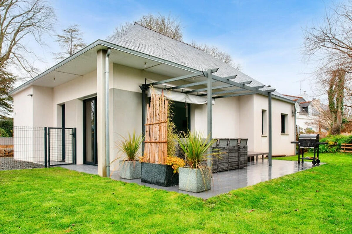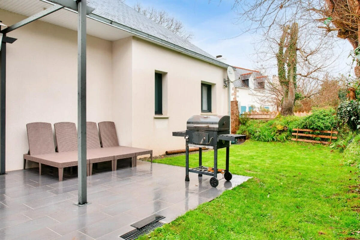 Ervaar de serene schoonheid van de Finistèrekust vanuit dit charmante gelijkvloerse huis in de rustige wijk Beg Meil in Fouesnant. Gelegen in een rustige woonwijk, is dit huis perfect voor gezinnen die op zoek zijn naar een ontspannen vakantie aan zee. Stelt u zich eens voor dat u geniet van lange zomeravonden in de weelderige tuin, buiten eet op het ruime terras of geniet van een uitgebreid ontbijt voordat u naar de nabijgelegen zandstranden gaat. Met het strand van Kerambigorn en het charmante dorpje Beg Meil op slechts een korte loopafstand, biedt deze locatie de perfecte mix van kustcharme en gemak. Avonturiers kunnen Concarneau per boot verkennen of de prachtige Glénan-eilanden bezoeken.