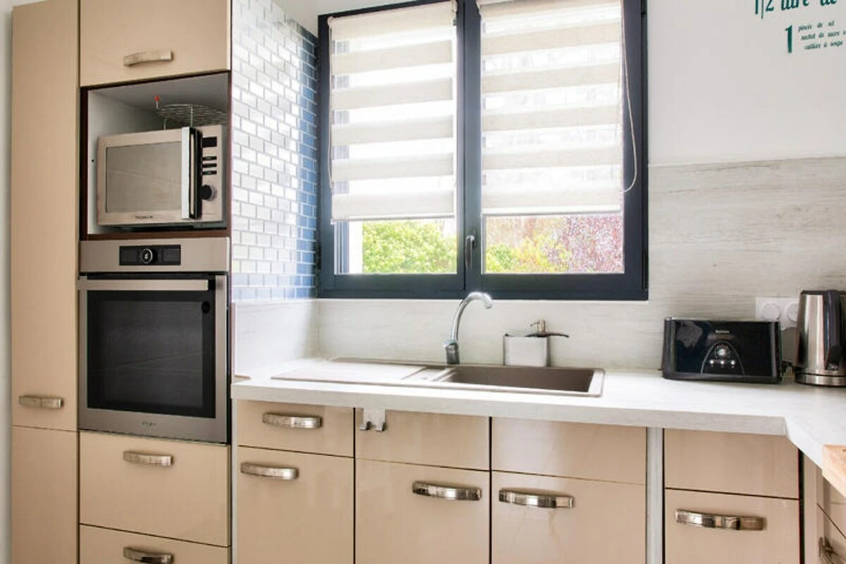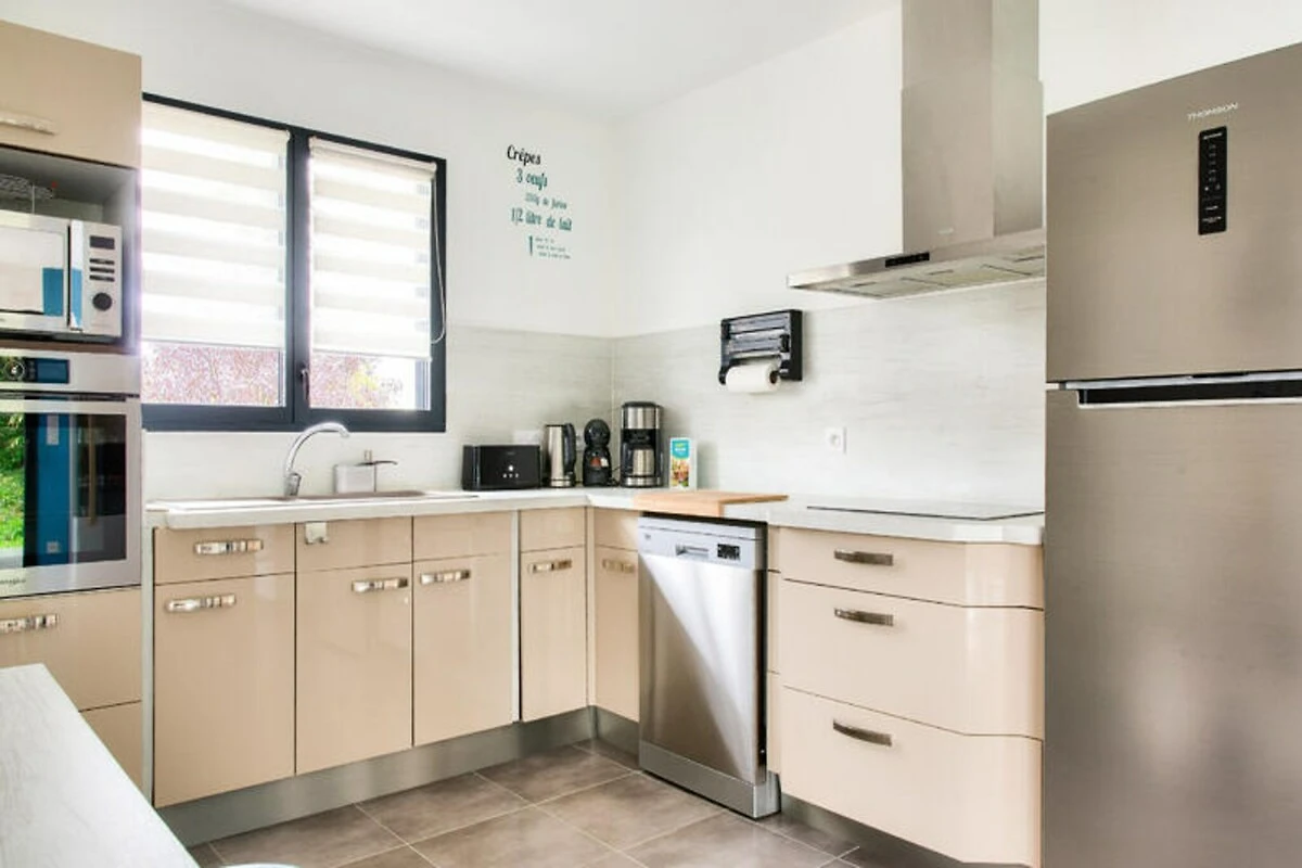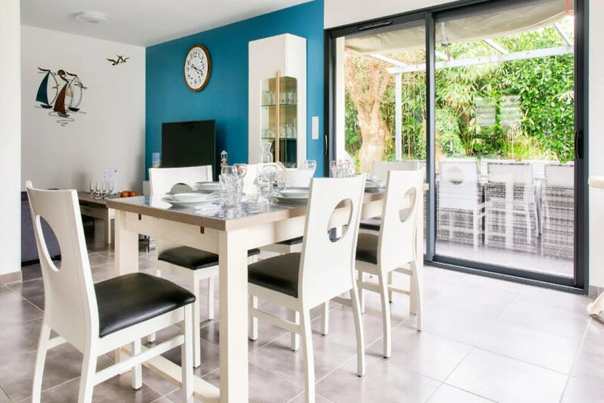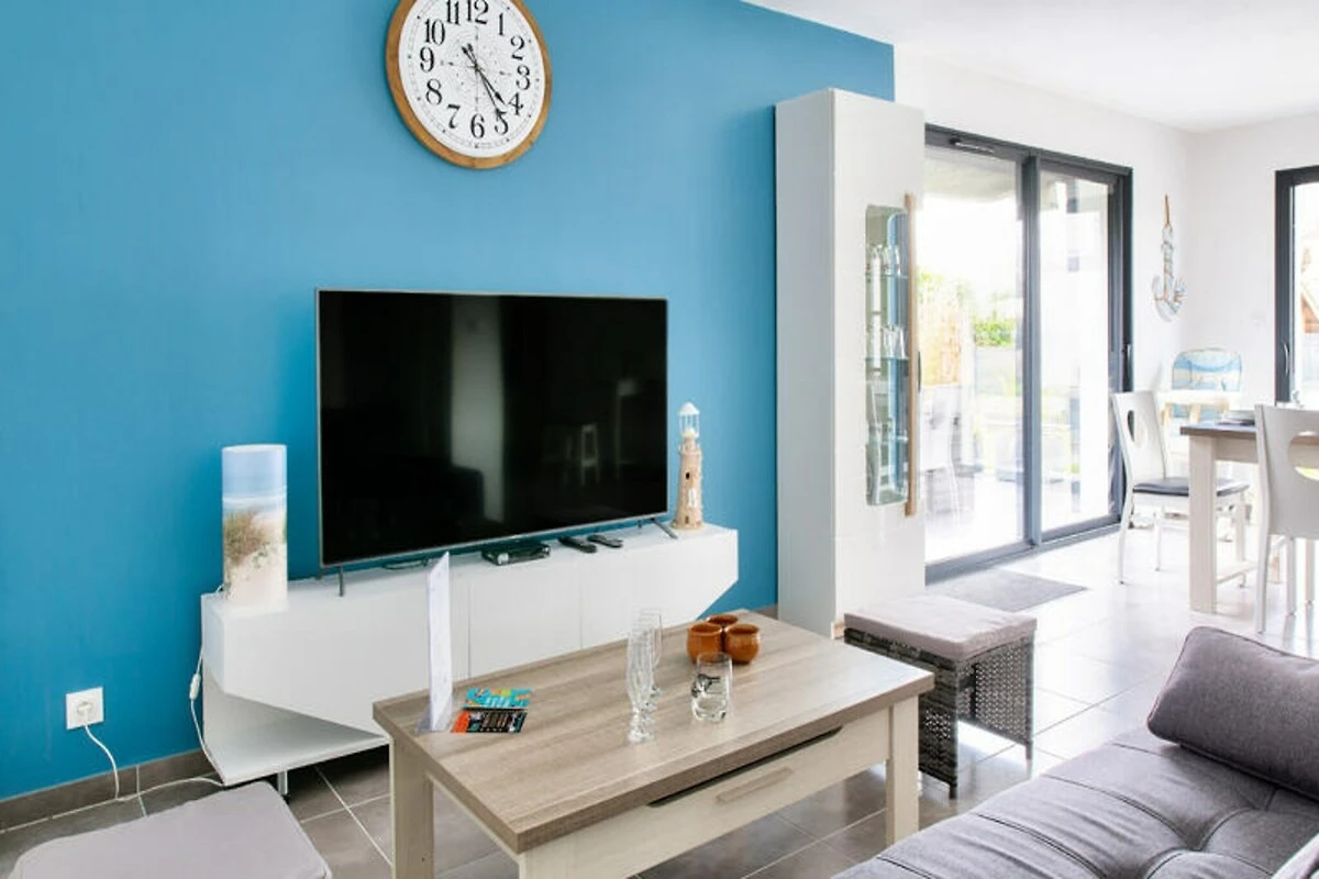 Binnen is het huis licht en gastvrij, met een modern, minimalistisch design dat comfort uitstraalt. De open keuken is volledig uitgerust met inductiekookplaten, een koelkast, vriezer, magnetron, broodrooster, waterkoker en filterkoffiezetapparaat, waardoor u gemakkelijk heerlijke maaltijden kunt bereiden. De keuken loopt naadloos over in de eetkamer, waar een grote tafel uitnodigt tot gezellige familiebijeenkomsten. De gezellige woonkamer, versierd met een rustgevende blauwe accentmuur, is perfect voor koelere avonden met tv kijken, bordspellen spelen of gewoon ontspannen met uw dierbaren.
