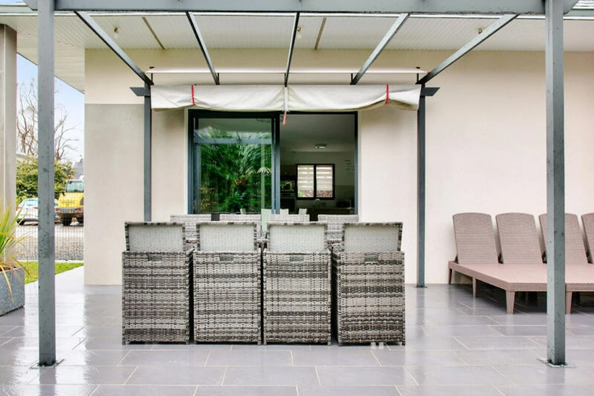 Het huis biedt comfortabel plaats aan maximaal acht gasten, verdeeld over drie zorgvuldig ontworpen slaapkamers. De master suite beschikt over een queensize bed, ideaal voor stellen, terwijl de tweede slaapkamer een tweepersoonsbed heeft en rolstoeltoegankelijk is. De derde slaapkamer is perfect voor kinderen, met een stapelbed, tweepersoonsbed en kinderbedje. Extra voorzieningen zijn onder andere rolstoeltoegankelijkheid, een wasmachine, kinderstoel, babybadje en twee privéparkeerplaatsen.