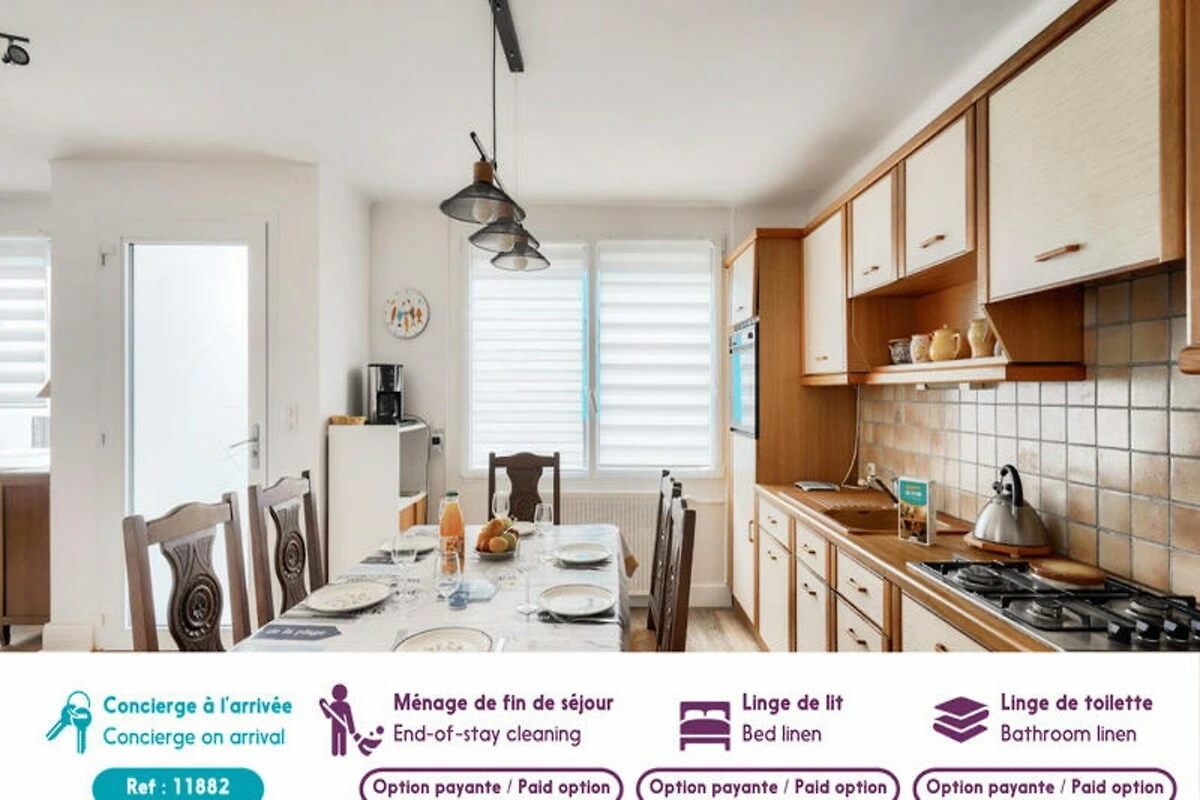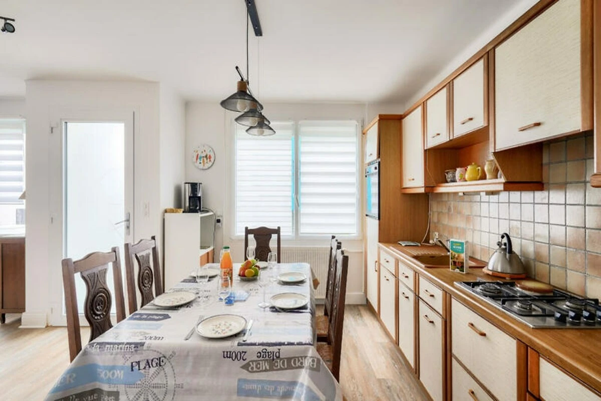 Het huis zelf is een oase van comfort en rustieke charme. Aan de voorzijde vormt een houten terras met tuinmeubelen en een barbecue de ideale setting voor onvergetelijke familiediners onder de blote hemel. Binnen straalt de woonkamer warmte uit en nodigt uit tot samenkomen voor bordspellen, aperitieven of een gezellige filmavond. De eetkamer, versierd met antieke Bretonse meubels, geeft een nostalgisch tintje, terwijl de volledig uitgeruste keuken, compleet met een grote houten tafel, perfect is om samen stevige maaltijden te bereiden en te genieten. Boven vindt u een prachtig gerenoveerde badkamer met douche en een traditionele badkamer met een groot bad, ideaal om te ontspannen na een dag vol ontdekkingen.