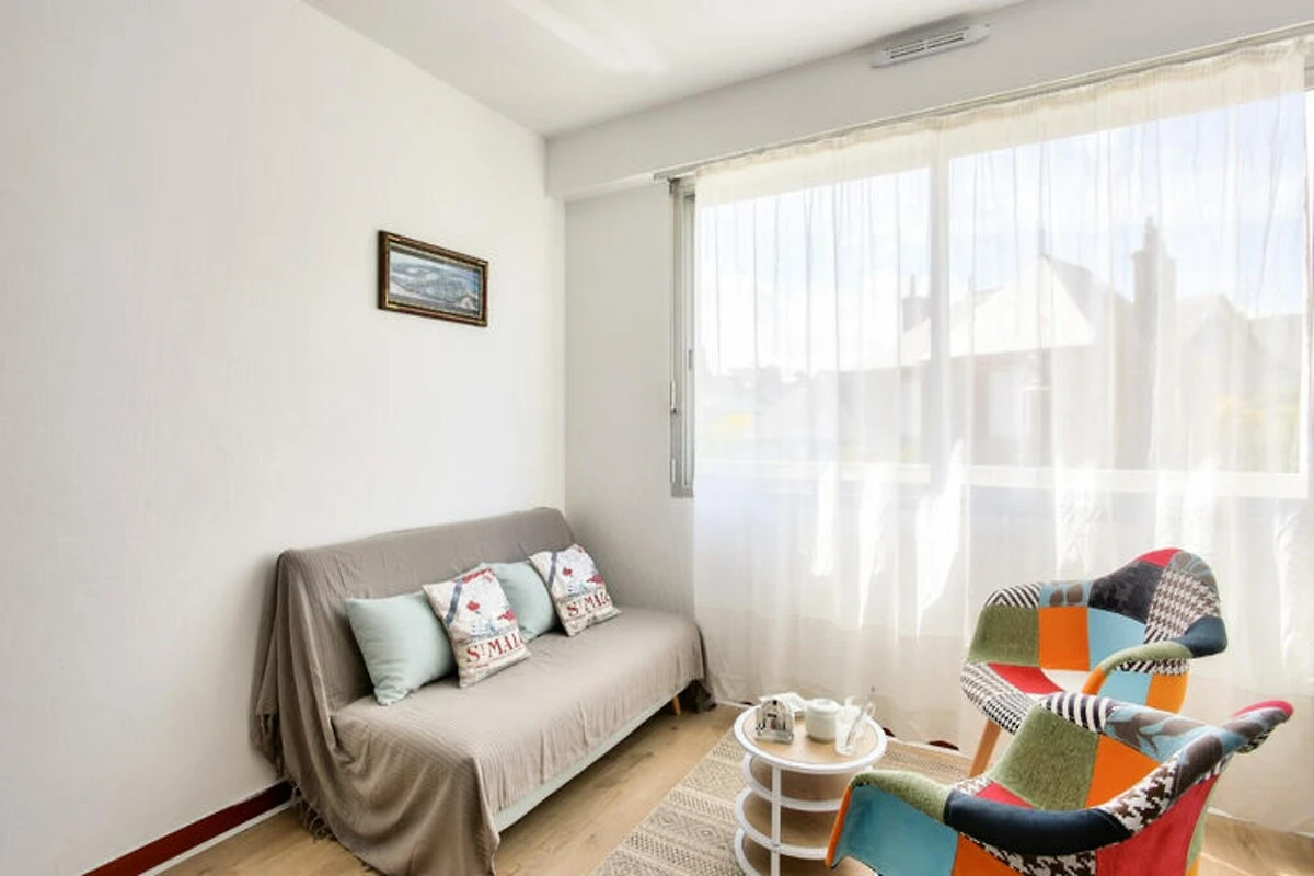 In het hart van het charmante kustplaatsje Dinard nodigt dit heerlijke appartement op de eerste verdieping u uit voor een ontspannen, autovrije vakantie. Op slechts 700 meter van het rustige strand van Prieuré en op 900 meter van het levendige strand van Écluse, is deze accommodatie perfect gelegen om de pittoreske kustlijn en het bruisende lokale leven te verkennen. Wandel naar het nabijgelegen marktplein, waar u kunt genieten van de bezienswaardigheden en smaken van verse lokale producten en ambachtelijke producten, of geniet van een kopje koffie in een van de gezellige cafés. Binnen biedt het appartement een warme en uitnodigende sfeer, ideaal voor gezinnen of kleine groepen tot vier personen. De woon- en eetkamer is zorgvuldig ontworpen, met een comfortabele bank en twee kleurrijke fauteuils die de perfecte plek vormen om te ontspannen met een boek of uw favoriete serie. De eetruimte sluit naadloos aan op de volledig uitgeruste keuken, waar u alles vindt wat u nodig heeft om heerlijke maaltijden te bereiden, van een inductiekookplaat en oven tot een Senseo-koffiezetapparaat en broodrooster. \n\nDe slaapgelegenheid bestaat uit twee comfortabele slaapkamers: één met een tweepersoonsbed en de andere met twee eenpersoonsbedden, voor een rustgevende nachtrust na dagen vol avontuur. De badkamer, ingericht in rustgevende groene tinten, beschikt over een apart toilet en een föhn voor extra gemak. \n\nBuiten het appartement wachten de hoogtepunten van Dinard op u. Verken de beroemde wandelroute GR34 of de betoverende Promenade du Clair de Lune voor een adembenemend uitzicht over de kust. Voor strandliefhebbers biedt Écluse Beach een uniek zoutwaterzwembad, terwijl watersporters zich kunnen uitleven in diverse activiteiten. Golfers zullen de nabijgelegen golfbaan van Dinard waarderen, op slechts 7 km afstand. Met zijn idyllische locatie en moderne comfort is dit appartement uw toegangspoort tot het beste van de Bretonse kust.