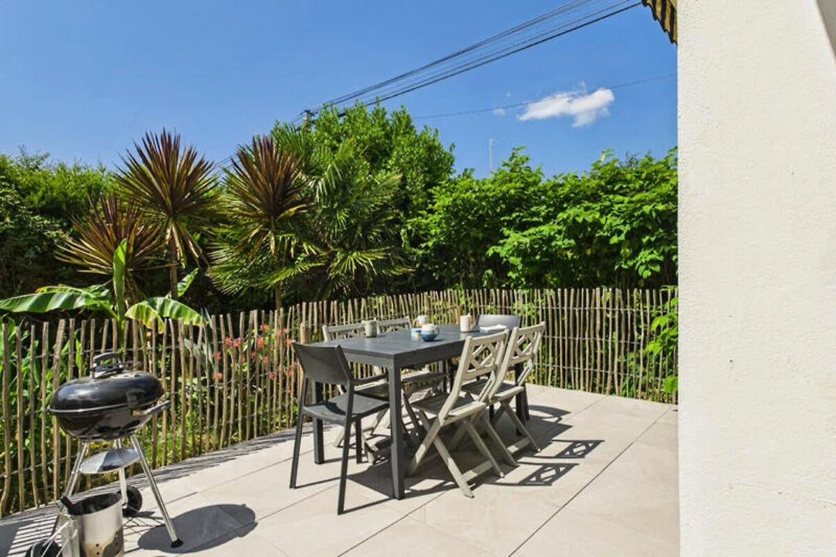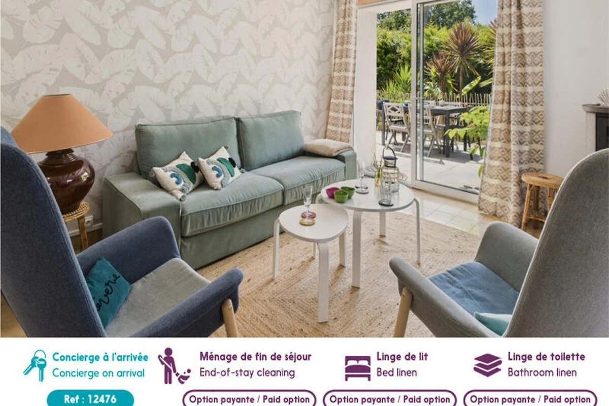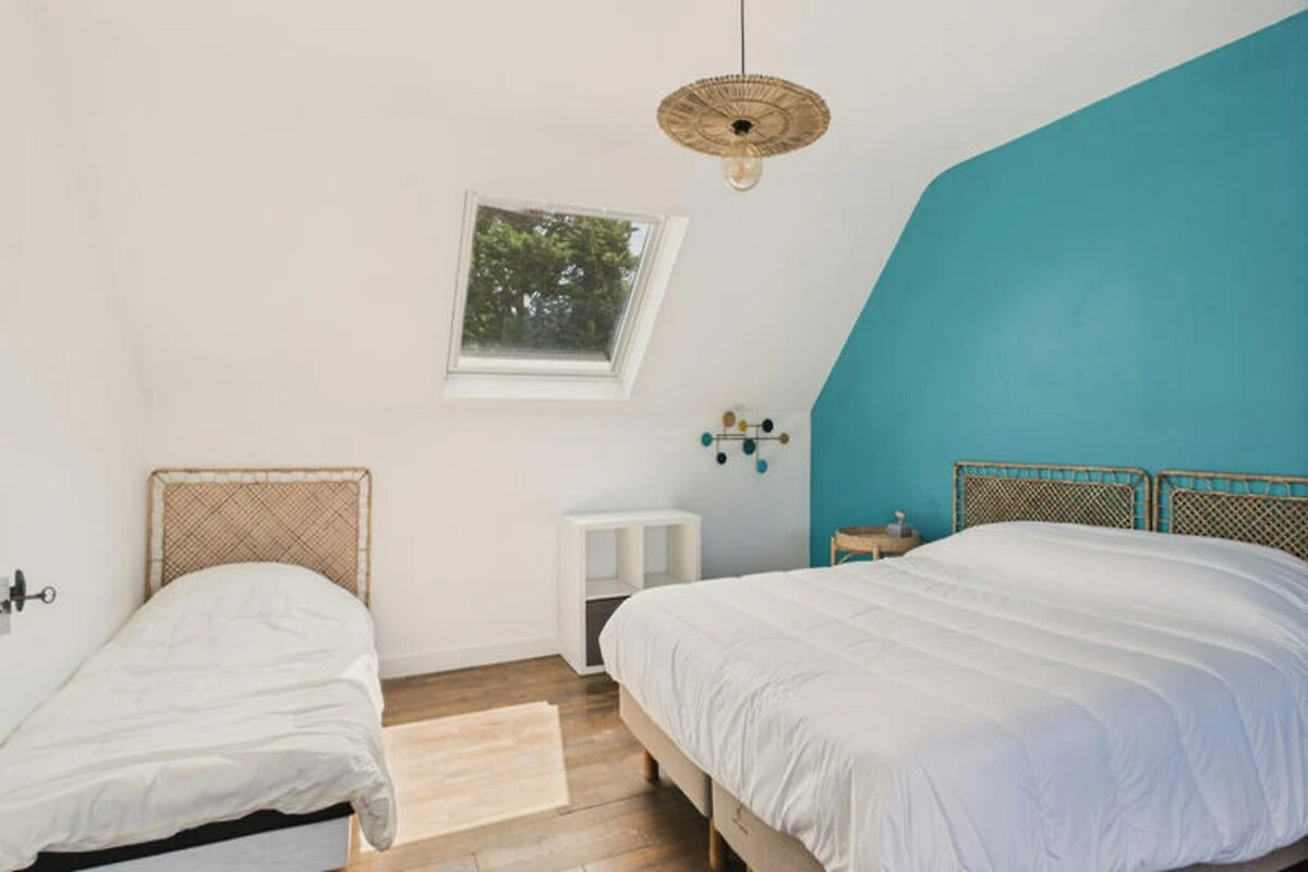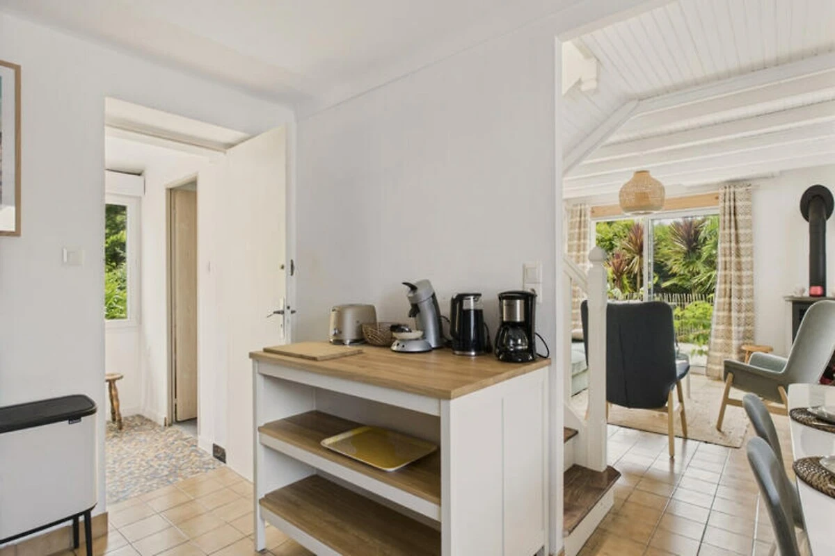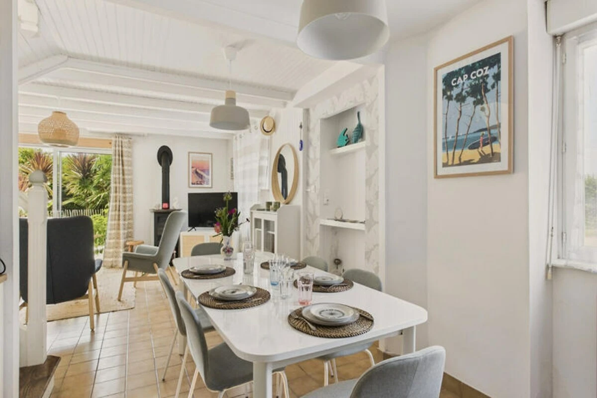 Aan de serene kust van Zuid-Finistère nodigt dit charmante vakantiehuis in Fouesnant u uit om de perfecte mix van comfort en natuur te ervaren. Gelegen tussen de landtong van Mousterlin en het stadscentrum, biedt het een oase van rust in een rustige buurt. Stelt u zich eens voor: wakker worden met het geluid van vogelgezang, genieten van een ontbijt op het zonnige terras en een dag vol kustavonturen of rustige ontspanning in de weelderige tuin plannen. Of u nu op zoek bent naar een familiemoment of een romantisch uitje, deze woning is uw toegangspoort tot de schatten van Bretagne. Binnen vindt u een ruime woonkamer van 40 m² met openslaande deuren naar het terras en de tuin, waardoor binnen en buiten naadloos met elkaar verbonden zijn. De moderne open keuken is volledig uitgerust met alles wat u nodig heeft, van een koelkast en oven tot een Senseo-koffiezetapparaat en broodrooster, waardoor het bereiden van maaltijden een genot is. Boven wachten twee knusse slaapkamers: één met een queensize bed en een eenpersoonsbed voor een kind, en de andere met een queensize bed, beide met voldoende opbergruimte. Twee badkamers met douche en föhn zorgen voor gemak voor alle gasten. Extra voorzieningen zijn onder andere een wasmachine, wifi en parkeergelegenheid voor twee auto's. Op slechts 3 km afstand lonken de ongerepte stranden van Cleut Rouz en Bot-Conan met mogelijkheden om te zwemmen, watersporten te beoefenen en mooie wandelingen te maken. Verken de nabijgelegen haven van Beg-Meil voor excursies naar de prachtige Glénan-eilanden of geniet van verse visgerechten in lokale restaurants. Golfliefhebbers zullen de golfbaan Bluegreen de l'Odet zeker waarderen, terwijl gezinnen kunnen genieten van het nabijgelegen pretpark en de wakeboardfaciliteiten. Met supermarkten, restaurants en culturele bezienswaardigheden binnen handbereik, is alles wat u nodig heeft binnen handbereik. Of u nu houdt van de ongerepte landschappen van Bretagne, de turquoise baaien of de levendige sfeer van de kust, dit vakantiehuis biedt een verjongende ontsnapping. Laat de schoonheid van Fouesnant en omgeving onvergetelijke herinneringen creëren voor u en uw dierbaren.