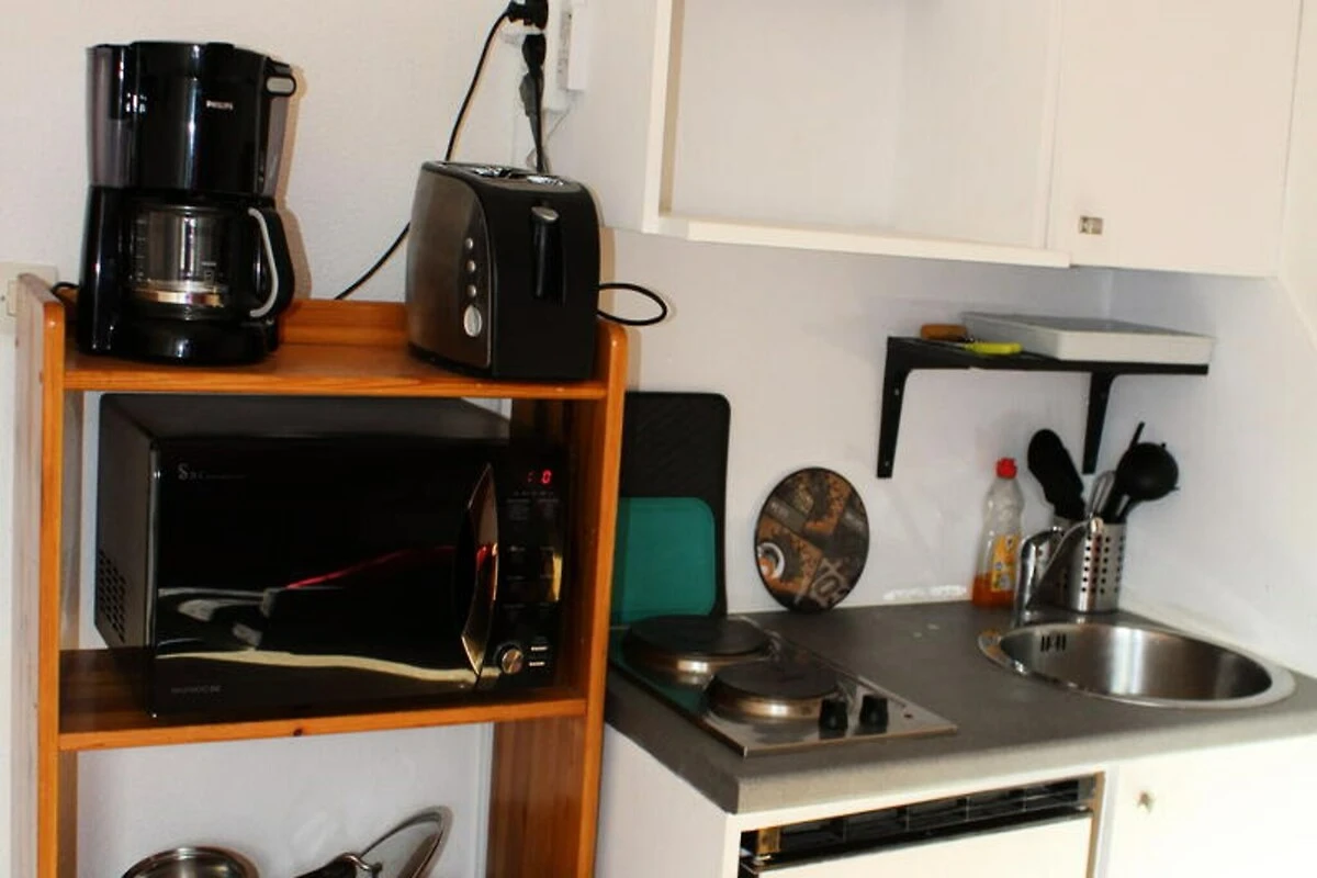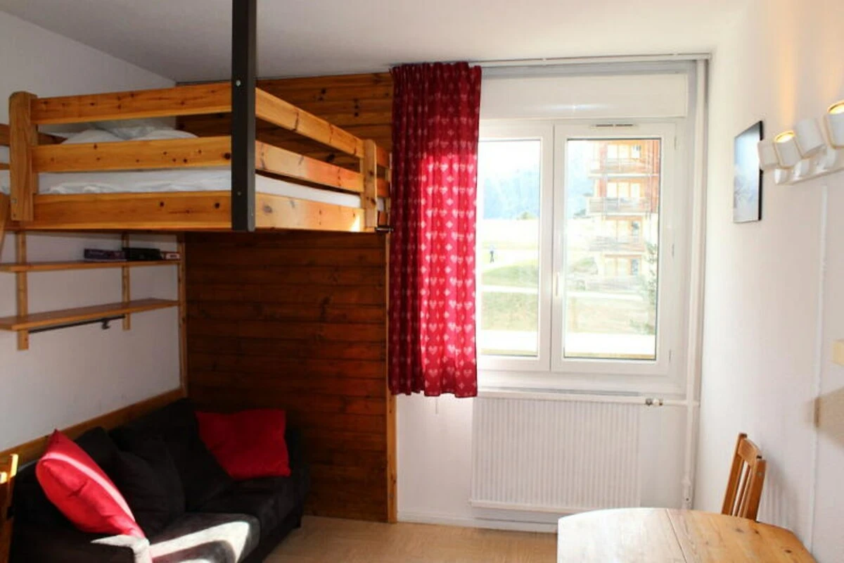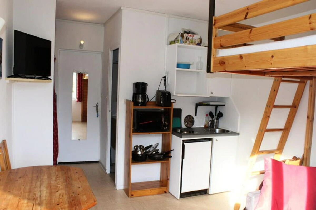 De studio van 17 m² is zorgvuldig ontworpen voor maximaal comfort en functionaliteit. De woonkamer is voorzien van een mezzanine met tweepersoonsbed en een vaste bank, wat een knusse maar praktische ruimte creëert om te ontspannen. De volledig uitgeruste kitchenette is voorzien van een oven, een kookplaat en een koffiezetapparaat, perfect voor het bereiden van maaltijden na een dag op de piste. Een eigen badkamer met een douche en moderne voorzieningen zoals een tv en wifi zorgen voor een comfortabel verblijf. Hoewel de studio geen balkon heeft, bieden de ramen met uitzicht op de vallei een adembenemend uitzicht dat de buitenlucht naar binnen brengt.