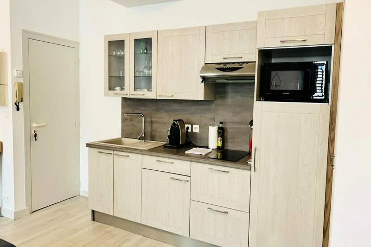 Stap binnen en ontdek een zorgvuldig ontworpen ruimte die moderne voorzieningen combineert met tijdloze elegantie. De woonkamer loopt naadloos over in de eet- en keukenruimte, wat een warme en uitnodigende sfeer creëert. De volledig uitgeruste keuken is van alle gemakken voorzien, van een koelkast en oven tot een Nespresso-apparaat en waterkoker. De aparte slaapkamer beschikt over een comfortabel tweepersoonsbed, terwijl de slaapbank in de woonkamer extra slaapruimte biedt. De badkamer is voorzien van een bad, wastafel en toilet, voor een ontspannen einde van de dag. Een pantry met een vaatwasser, wasmachine en droger draagt bij aan de praktische kant van het appartement.