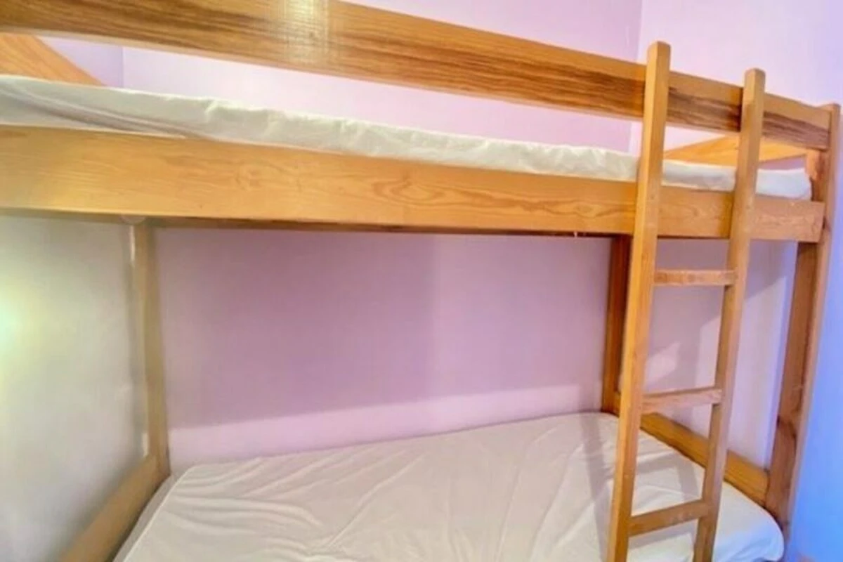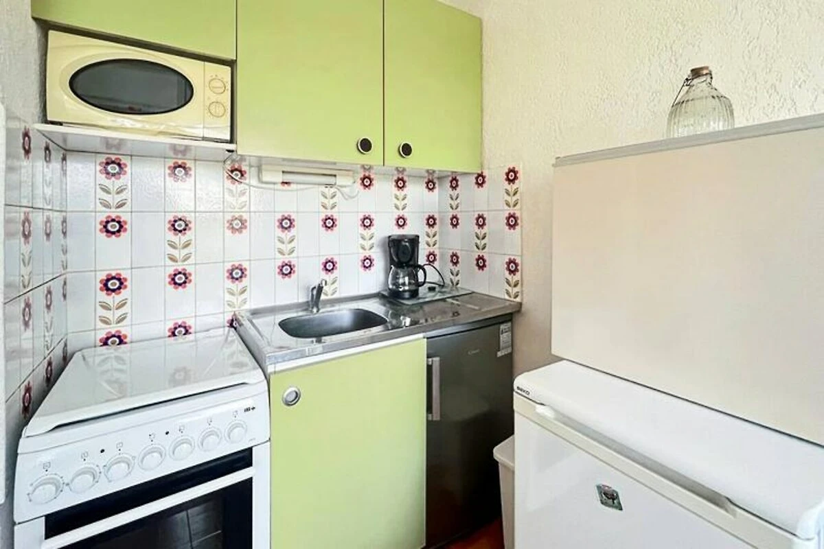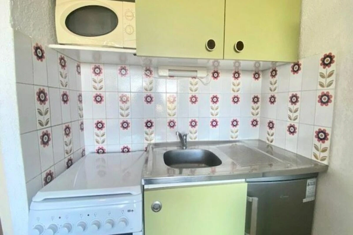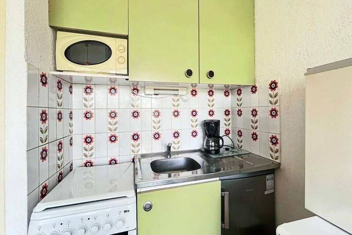 Binnen biedt de studio comfortabel plaats aan maximaal zes gasten, met een tweepersoonsbed, een stapelbed en een slaapbank in de woonkamer. De kitchenette is volledig uitgerust met een fornuis, oven, magnetron en een klassiek koffiezetapparaat, waardoor je gemakkelijk maaltijden kunt bereiden na een dag verkennen. De badkamer is voorzien van een douche en bidet, zodat je van alle gemakken bent voorzien voor een comfortabel verblijf. Met zijn praktische indeling en uitnodigende sfeer is deze studio een echt thuis weg van huis.