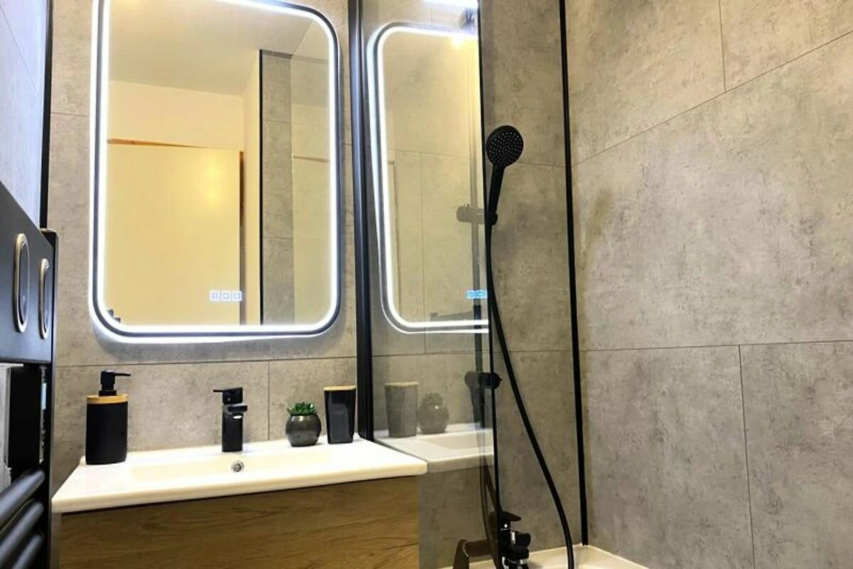 Dit appartement met een oppervlakte van 40 m² op de begane grond biedt comfortabel plaats aan maximaal zes gasten. De woonkamer is voorzien van twee eenpersoonsbedden, terwijl de knusse slaapkamer een tweepersoonsbed heeft. Een slaapnis met stapelbedden biedt extra ruimte, perfect voor gezinnen of groepen vrienden. De volledig uitgeruste keuken, compleet met een elektrische kookplaat, combi-magnetron, koffiezetapparaat, vaatwasser en koelkast, zorgt ervoor dat u na een dag vol ontdekkingen stevige maaltijden kunt bereiden. Twee moderne badkamers, waarvan één en suite, en een apart toilet dragen bij aan het gemak en comfort van deze charmante woning.