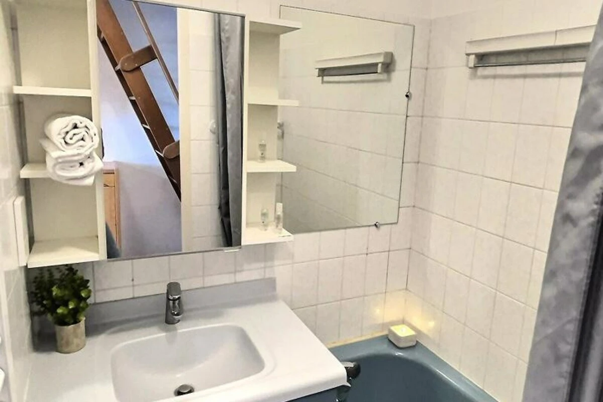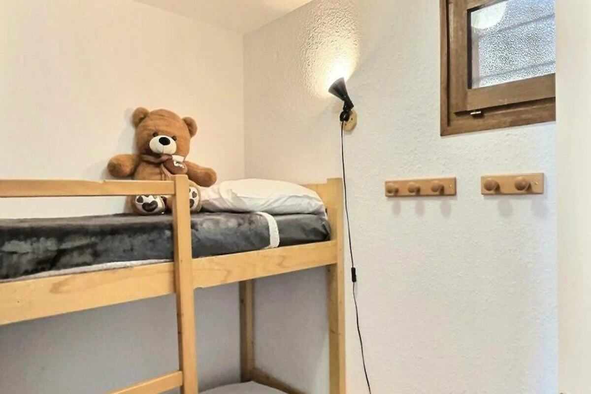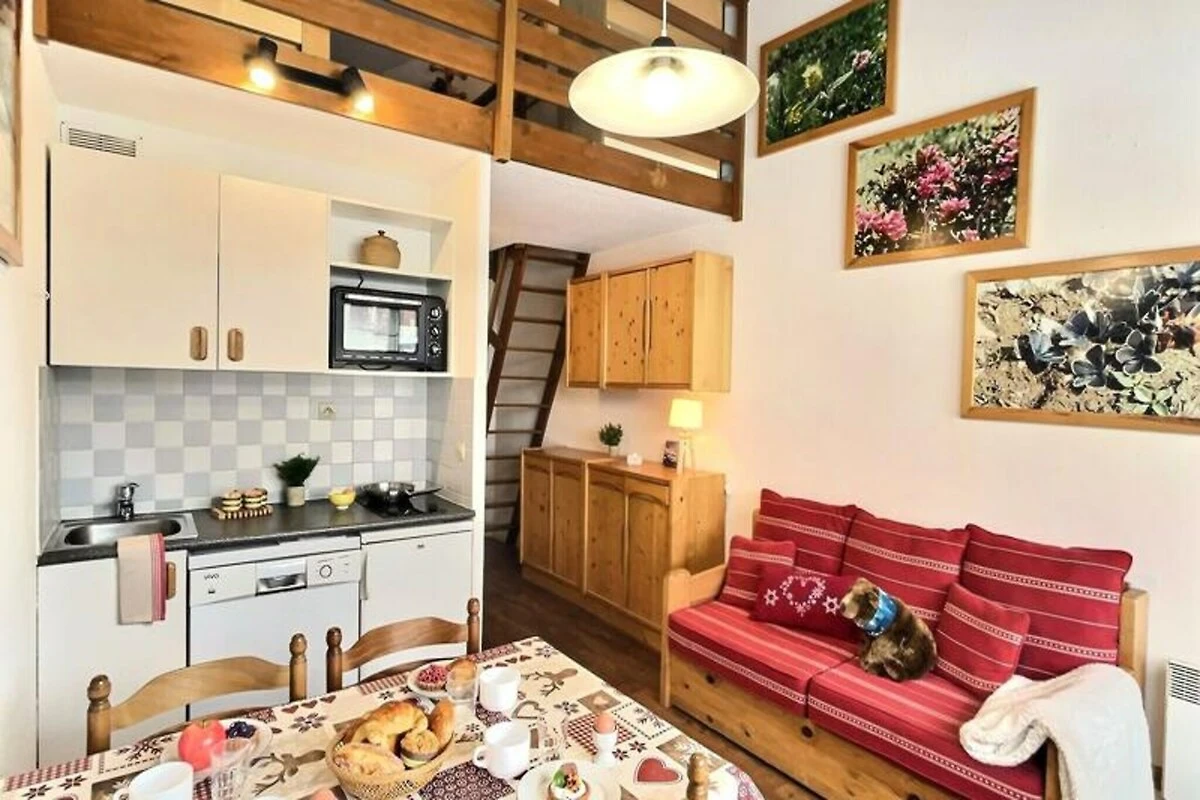 De studio van 35 m² is zorgvuldig ontworpen en biedt plaats aan maximaal vijf gasten. De slaapgelegenheid bestaat uit een hut met twee stapelbedden (let op: het bovenste stapelbed is niet geschikt voor kinderen jonger dan zes jaar) en een mezzanine met drie eenpersoonsbedden, wat flexibiliteit en comfort biedt voor gezinnen of kleine groepen. De volledig uitgeruste keuken is voorzien van twee elektrische kookplaten, een oven, een koelkast en een vaatwasser, waardoor u na een dag vol avontuur gemakkelijk stevige maaltijden kunt bereiden. Een flatscreen-tv in de woonkamer en een skiberging dragen bij aan het gemak, terwijl de badkamer met bad en apart toilet zorgt voor een ontspannen verblijf.