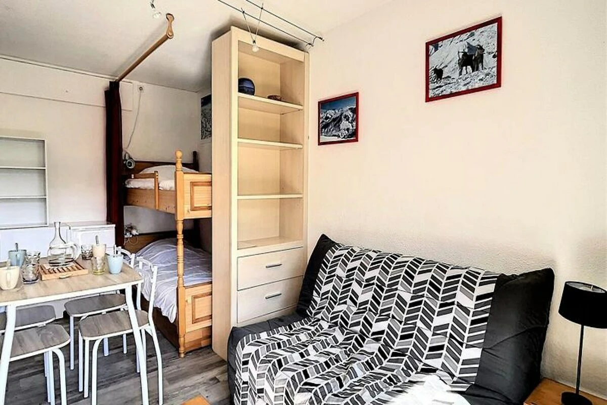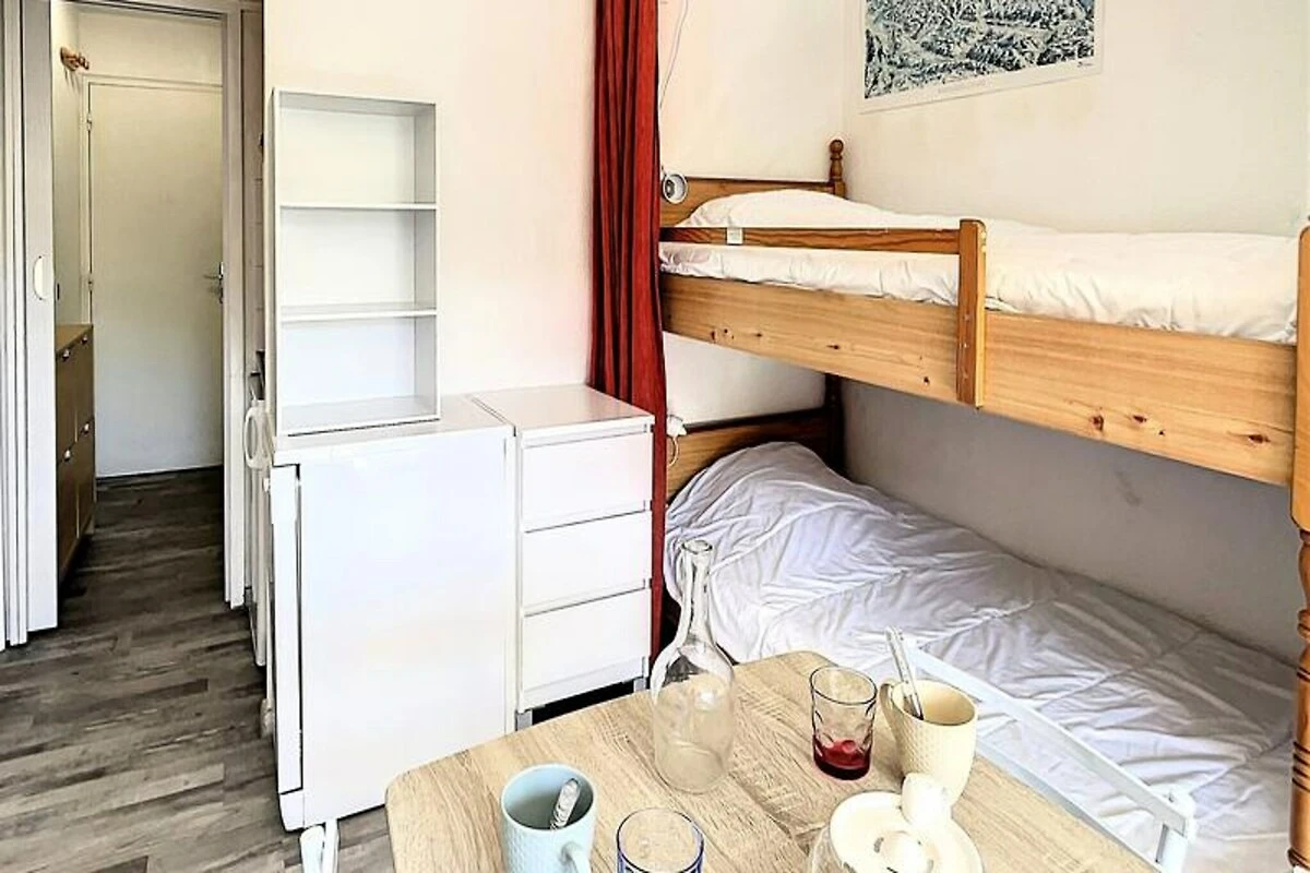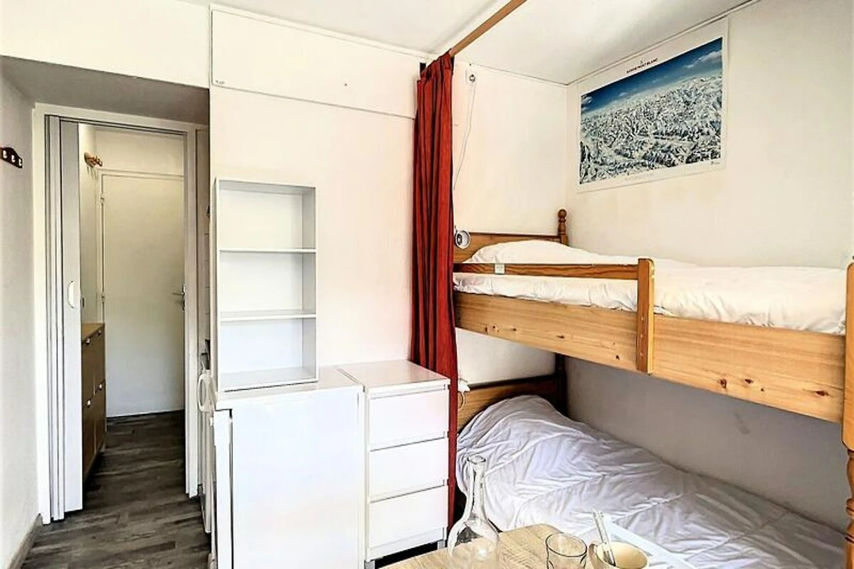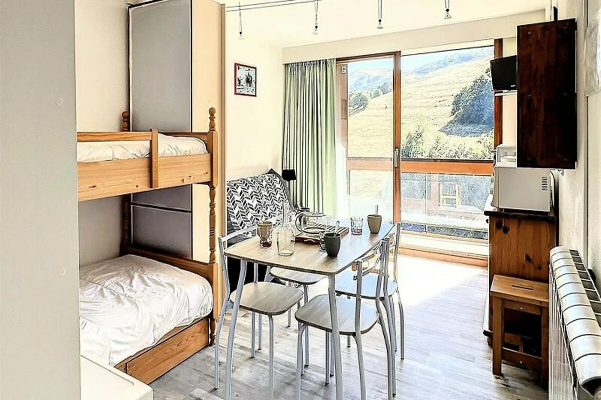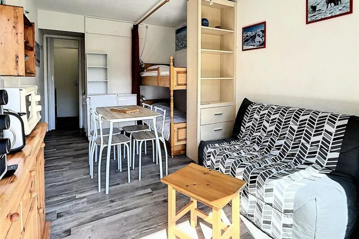 Binnen is de studio van 22 m² zorgvuldig ingericht en biedt plaats aan maximaal vier gasten. De woonkamer is voorzien van een comfortabele tweepersoons slaapbank en twee stapelbedden, gescheiden door een gordijn voor extra privacy. Een compacte maar volledig uitgeruste kitchenette nodigt je uit om stevige maaltijden te bereiden na een dag op de piste, compleet met elektrische kookplaten, een mini-oven, magnetron, vaatwasser en koffiezetapparaat. Moderne voorzieningen zoals een flatscreen-tv en gratis wifi zorgen voor een ontspannen en verbonden verblijf, terwijl het verwarmde zwembad een vleugje luxe toevoegt aan je Alpenavontuur. Stap naar buiten en u vindt alles wat u nodig heeft binnen handbereik. De ESF-skischool ligt op slechts 200 meter afstand, waardoor het een ideale keuze is voor gezinnen met jonge skiërs. Een supermarkt, delicatessenwinkel en zelfs een kinderdagverblijf zijn allemaal gunstig gelegen in de buurt, waardoor uw verblijf even ontspannen als aangenaam is.