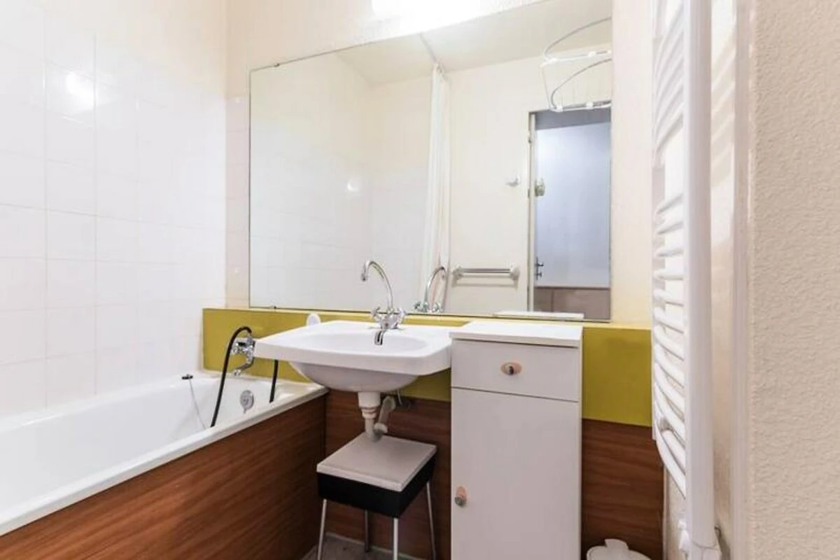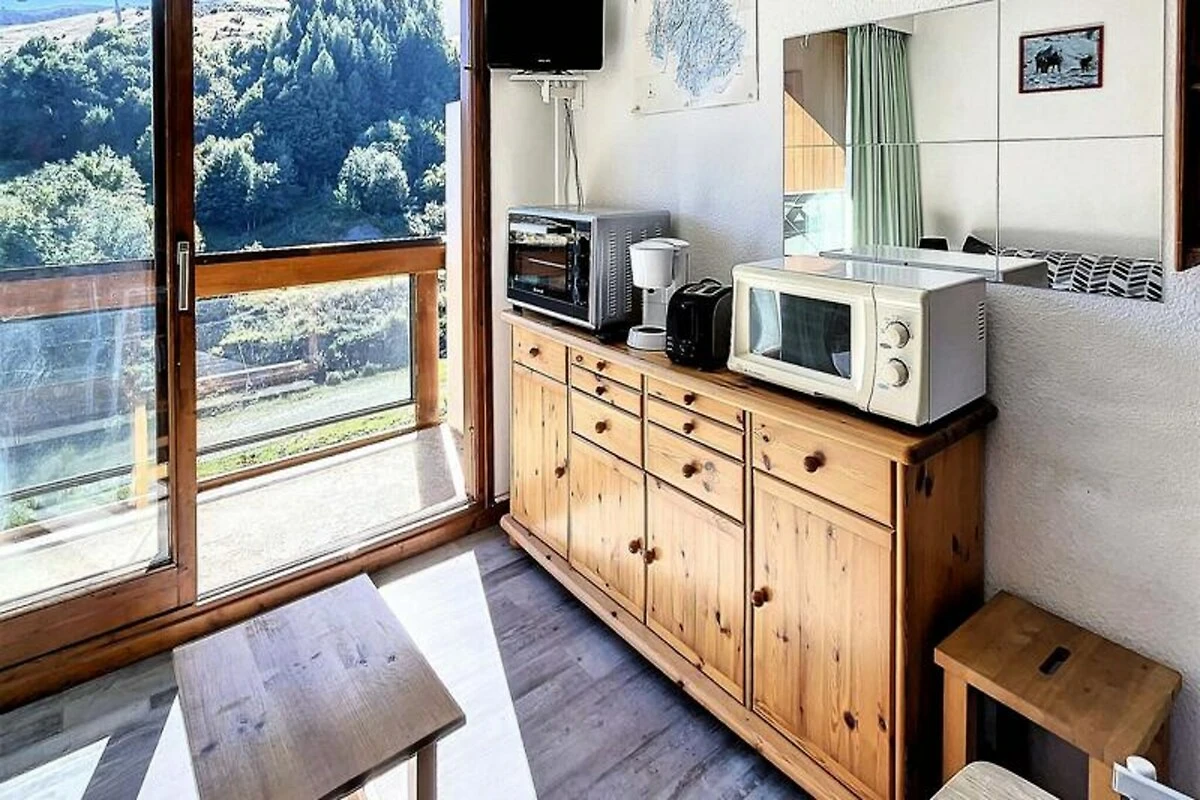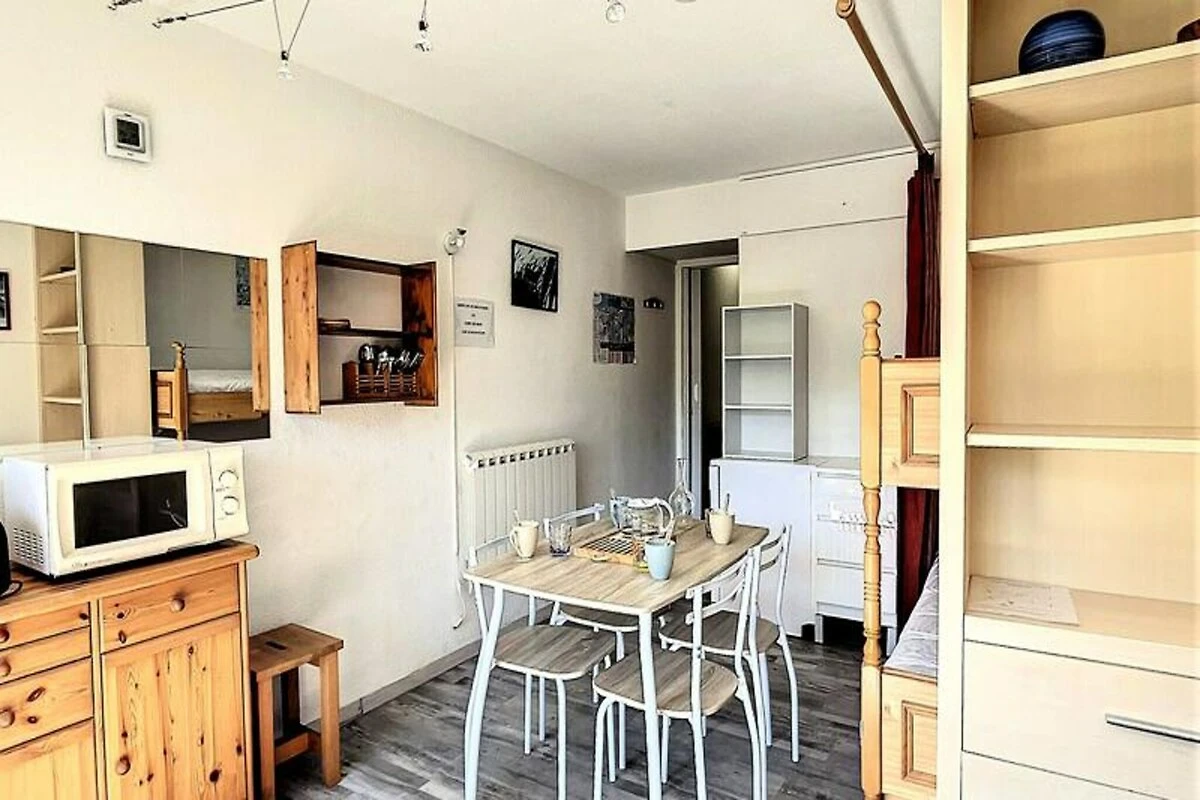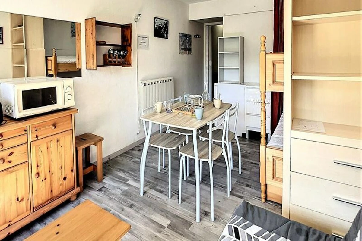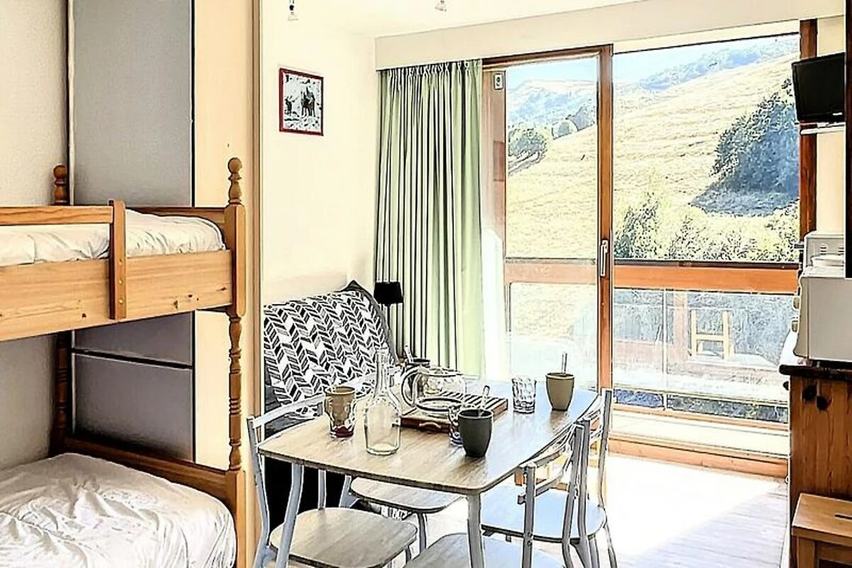 Binnen is de studio van 22 m² zorgvuldig ingericht en biedt plaats aan maximaal vier gasten. De woonkamer is voorzien van een comfortabele tweepersoons slaapbank en twee stapelbedden, gescheiden door een gordijn voor extra privacy. Een compacte maar volledig uitgeruste kitchenette nodigt je uit om stevige maaltijden te bereiden na een dag op de piste, compleet met elektrische kookplaten, een mini-oven, magnetron, vaatwasser en koffiezetapparaat. Moderne voorzieningen zoals een flatscreen-tv en gratis wifi zorgen voor een ontspannen en verbonden verblijf, terwijl het verwarmde zwembad een vleugje luxe toevoegt aan je Alpenavontuur. Stap naar buiten en u vindt alles wat u nodig heeft binnen handbereik. De ESF-skischool ligt op slechts 200 meter afstand, waardoor het een ideale keuze is voor gezinnen met jonge skiërs. Een supermarkt, delicatessenwinkel en zelfs een kinderdagverblijf zijn allemaal gunstig gelegen in de buurt, waardoor uw verblijf even ontspannen als aangenaam is.