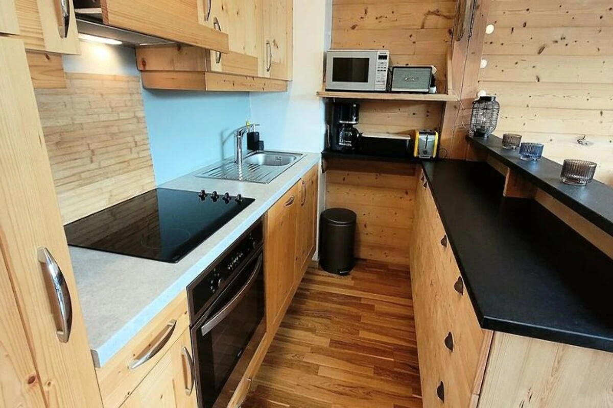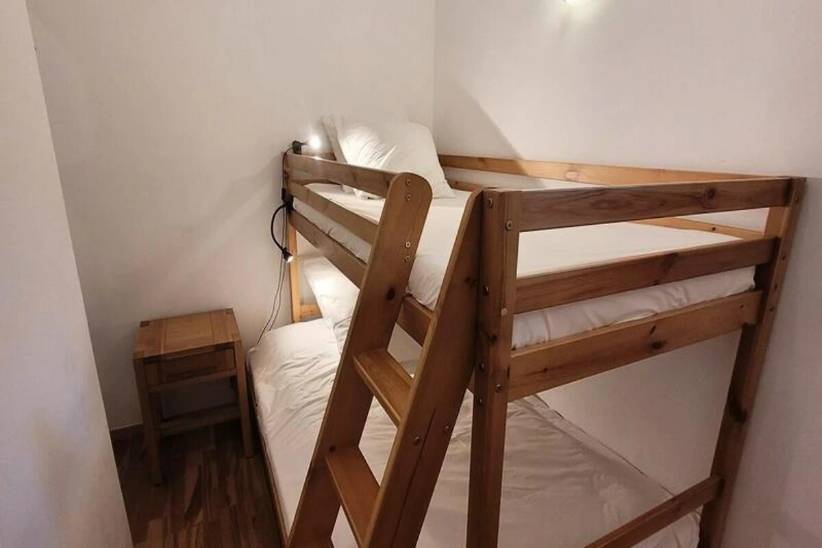 Stap binnen en ontdek een zorgvuldig ontworpen ruimte die rustieke charme combineert met modern comfort. De open woonkamer heeft hoge plafonds, een volledig uitgeruste keuken en een eetgedeelte dat naadloos overgaat in de woonkamer, die uitkomt op een eigen balkon. De hoofdslaapkamer beschikt over een luxe tweepersoonsbed en een ruime inloopkast, terwijl het slaapgedeelte in hutstijl met stapelbedden een leuke en praktische oplossing biedt voor kinderen of extra gasten. De badkamer is goed uitgerust met een verwarmd handdoekenrek en moderne voorzieningen, voor een ontspannende ervaring na een dag op de piste.
