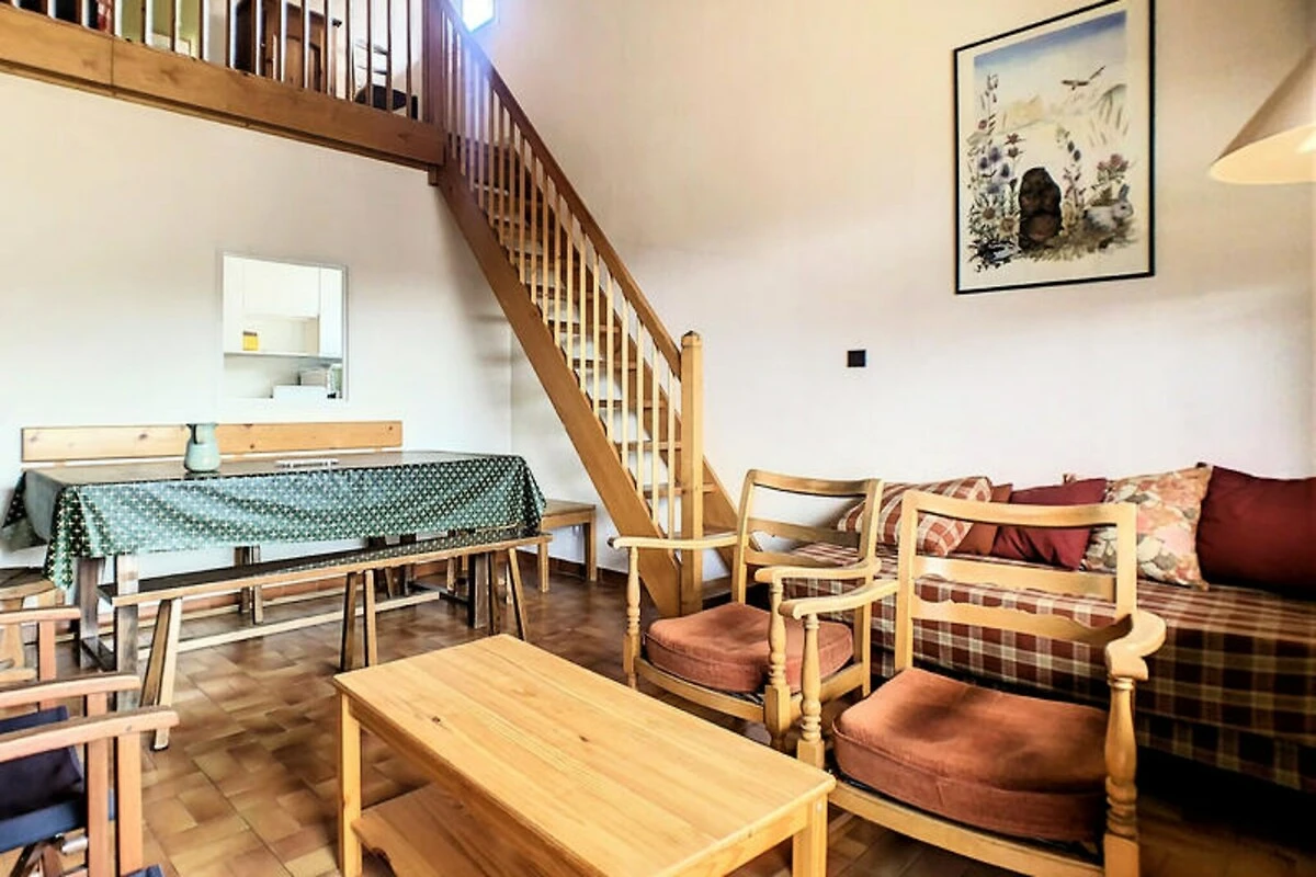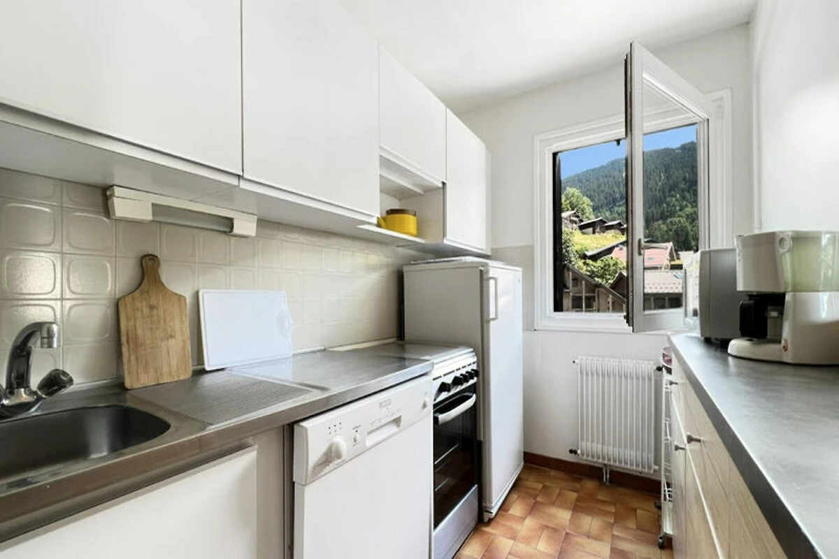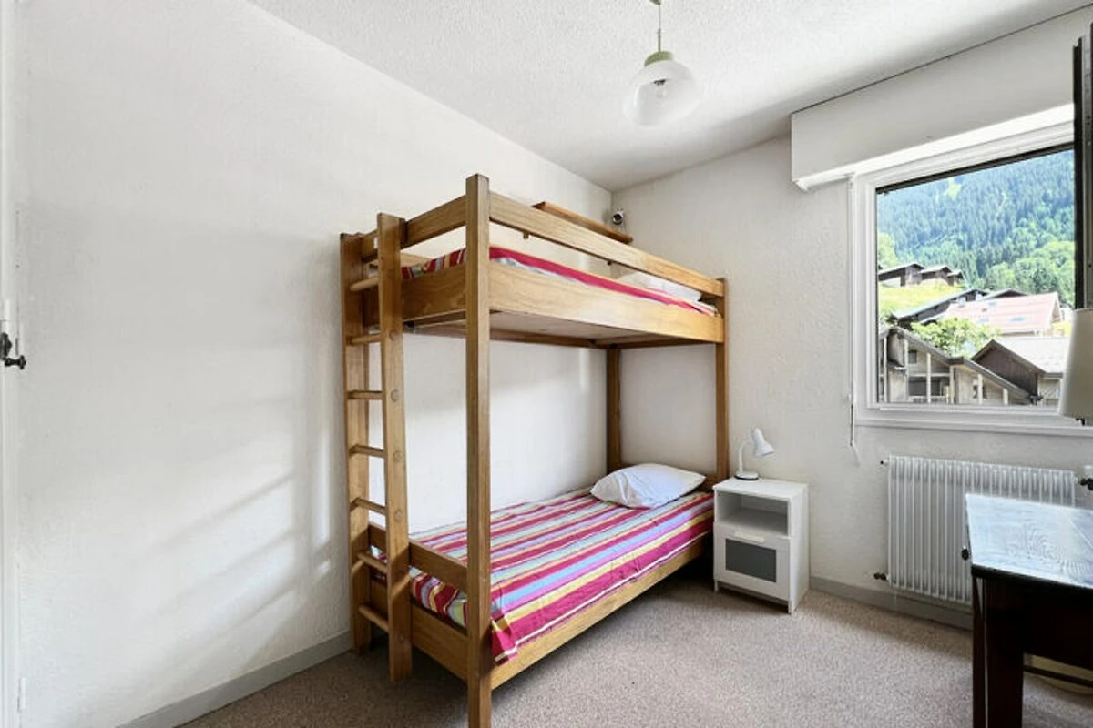 Dit appartement van 68 m² ligt op de 4e verdieping van de residentie met lift en biedt vijf aparte slaapgedeeltes voor 8 personen. Het beschikt over drie aparte slaapkamers (slaapkamer 1 en 2: stapelbedden, slaapkamer 3: tweepersoonsbed), een mezzanine (eenpersoonsbed), een woonkamer (eenpersoons slaapbank), een kitchenette, een badkamer, een apart toilet en een doucheruimte op de bovenverdieping. Het balkon op het zuiden biedt een prachtig uitzicht op het dorp en de skipiste van Timalets.