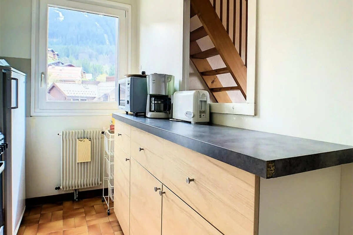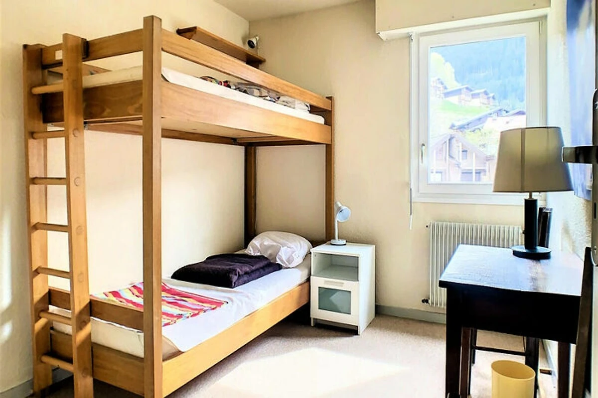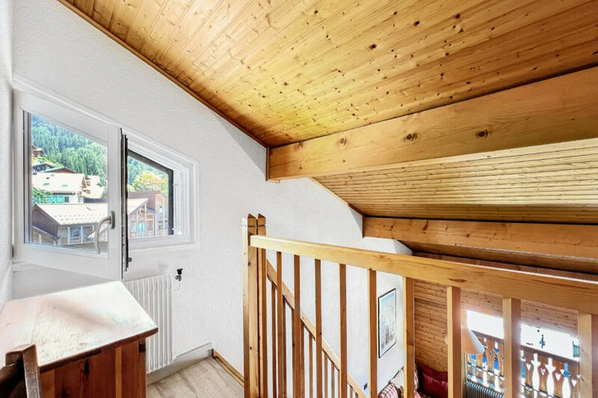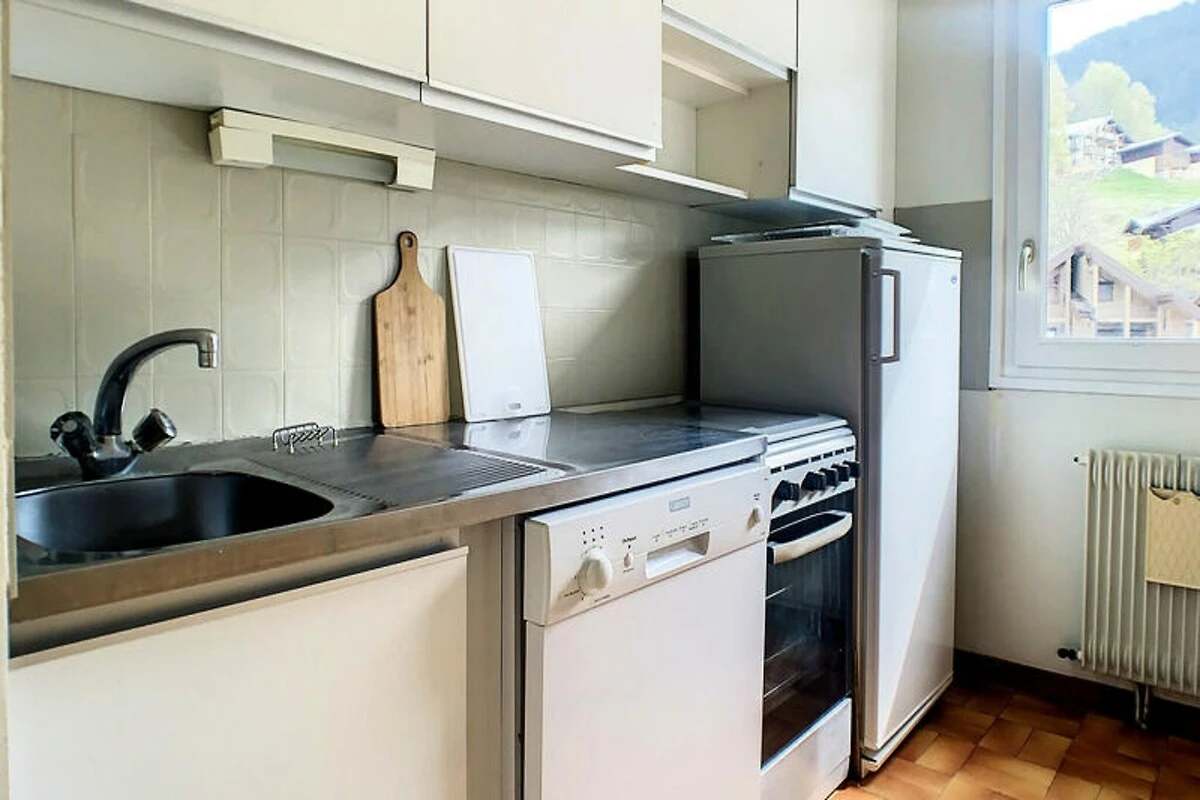 Dit appartement van 68 m² ligt op de 4e verdieping van de residentie met lift en biedt vijf aparte slaapgedeeltes voor 8 personen. Het beschikt over drie aparte slaapkamers (slaapkamer 1 en 2: stapelbedden, slaapkamer 3: tweepersoonsbed), een mezzanine (eenpersoonsbed), een woonkamer (eenpersoons slaapbank), een kitchenette, een badkamer, een apart toilet en een doucheruimte op de bovenverdieping. Het balkon op het zuiden biedt een prachtig uitzicht op het dorp en de skipiste van Timalets.