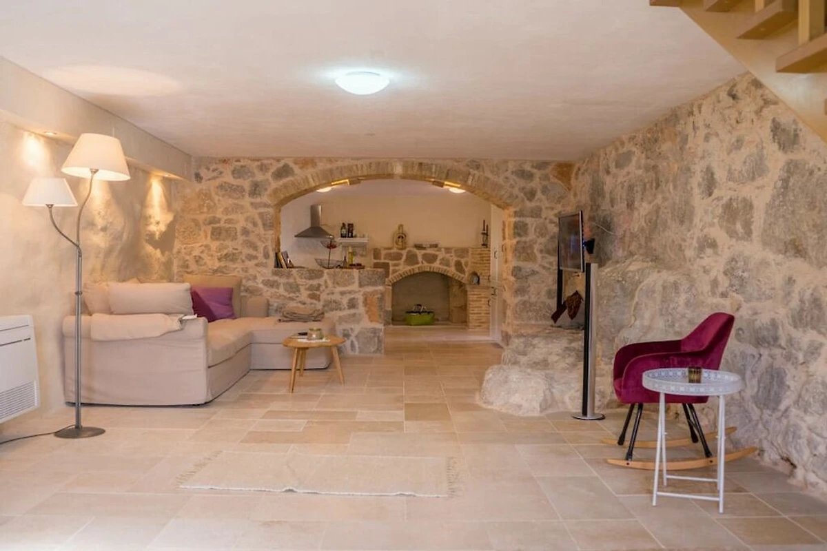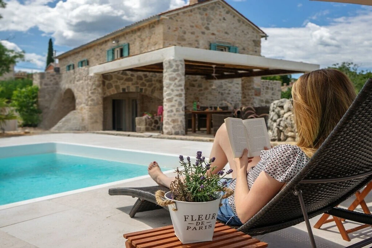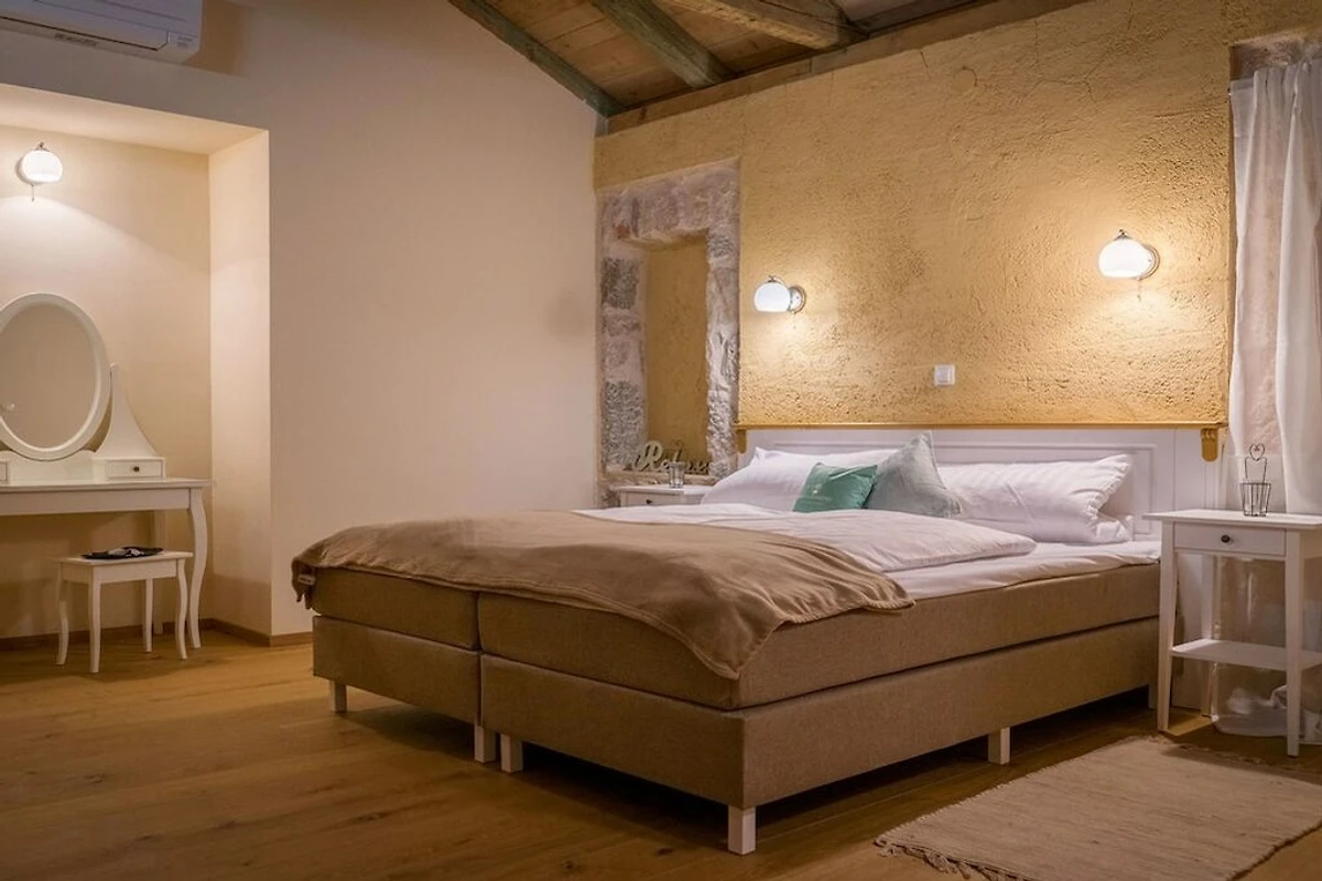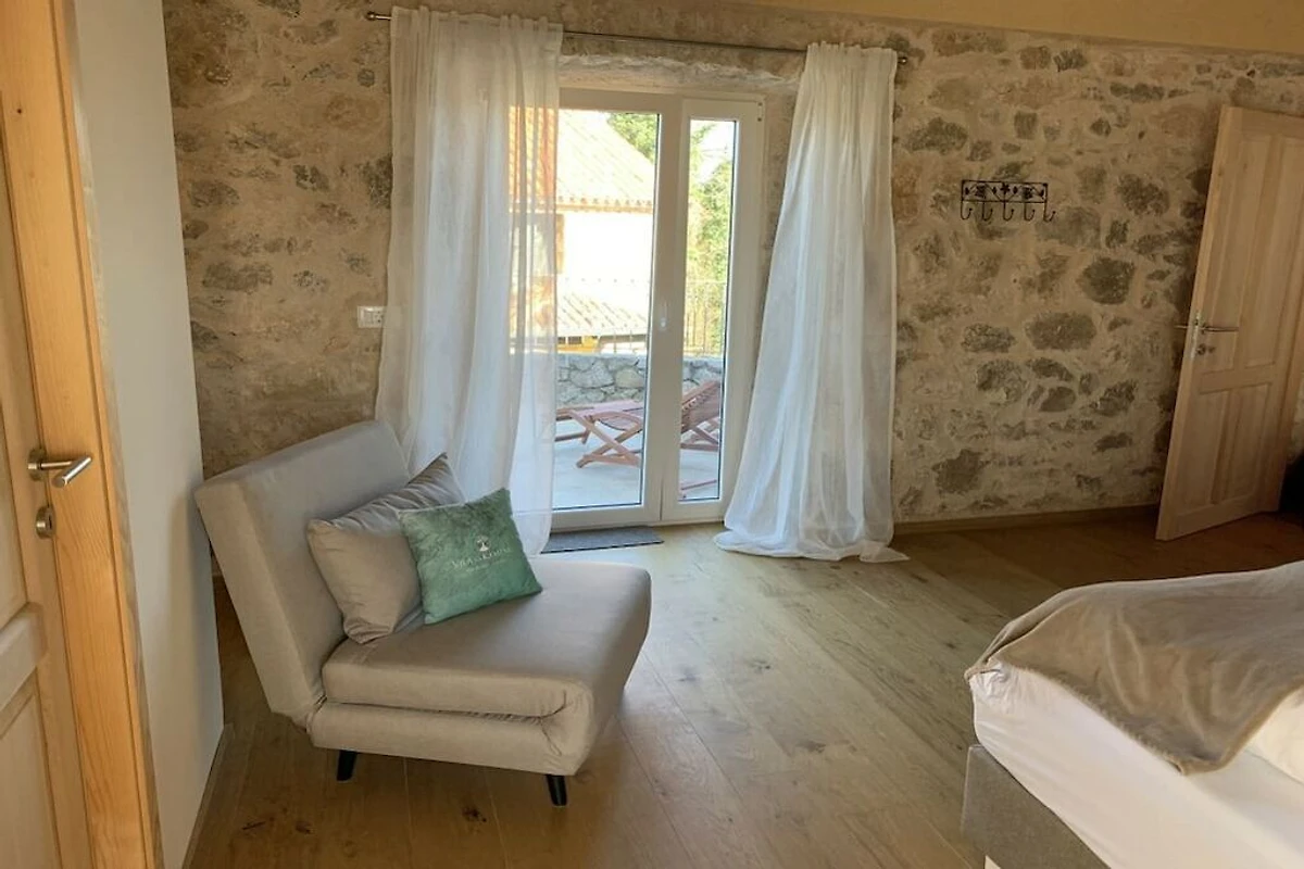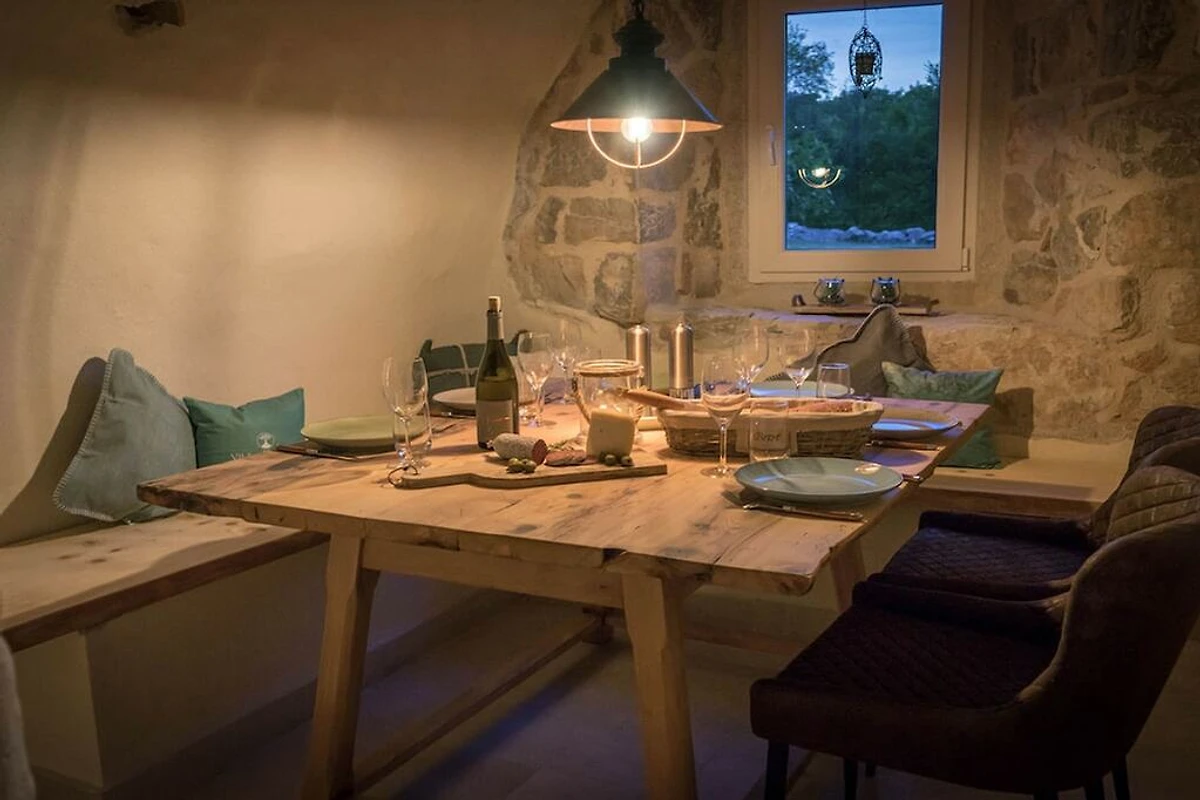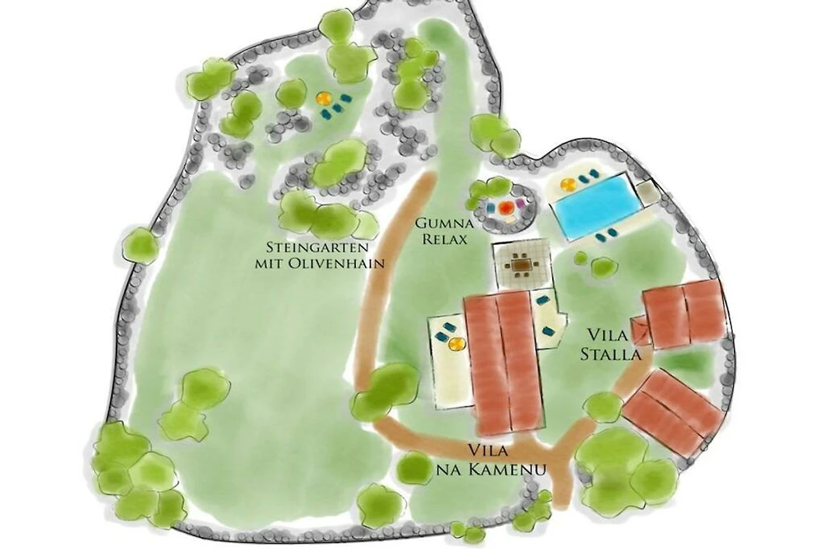Het vakantiehuis Vila na Kamenu heeft een woonoppervlakte van 144 m² en beschikt over 3 slaapkamers (tweepersoonskamers), 3 badkamers, 1 woonkamer met slaapbank, 1 volledig uitgeruste keuken met eetkamer, 2 terrassen op de bovenverdieping en een ruim buitengedeelte met overdekte pergola, Weber barbecue, Relax-Gumna (oude dorsvloer) en een verwarmd zwembad (mei-half oktober) voor maximaal 8 personen.