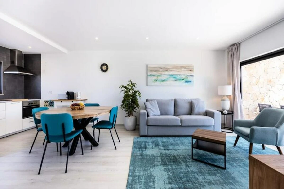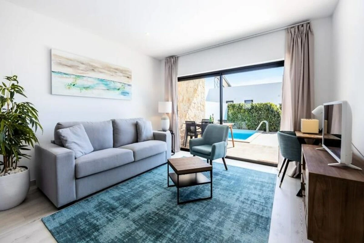 Stap binnen en ontdek een lichte en uitnodigende leefruimte met uitzicht op de weelderige tuin en het zwembad. De woonkamer is zorgvuldig ontworpen met een comfortabele bank, satelliettelevisie en een eethoek voor vier personen, waardoor een gezellige sfeer ontstaat om te ontspannen na een dag vol ontdekkingen. De open keuken is volledig uitgerust met moderne apparatuur, waaronder een keramische kookplaat, magnetron, oven, koelkast/vriezer en vaatwasser, zodat u alles heeft wat u nodig heeft om heerlijke maaltijden te bereiden.