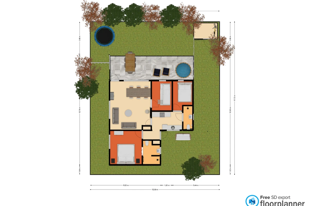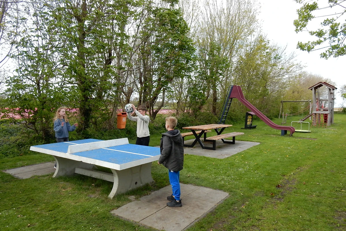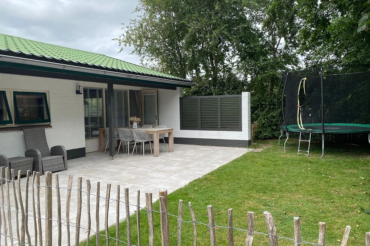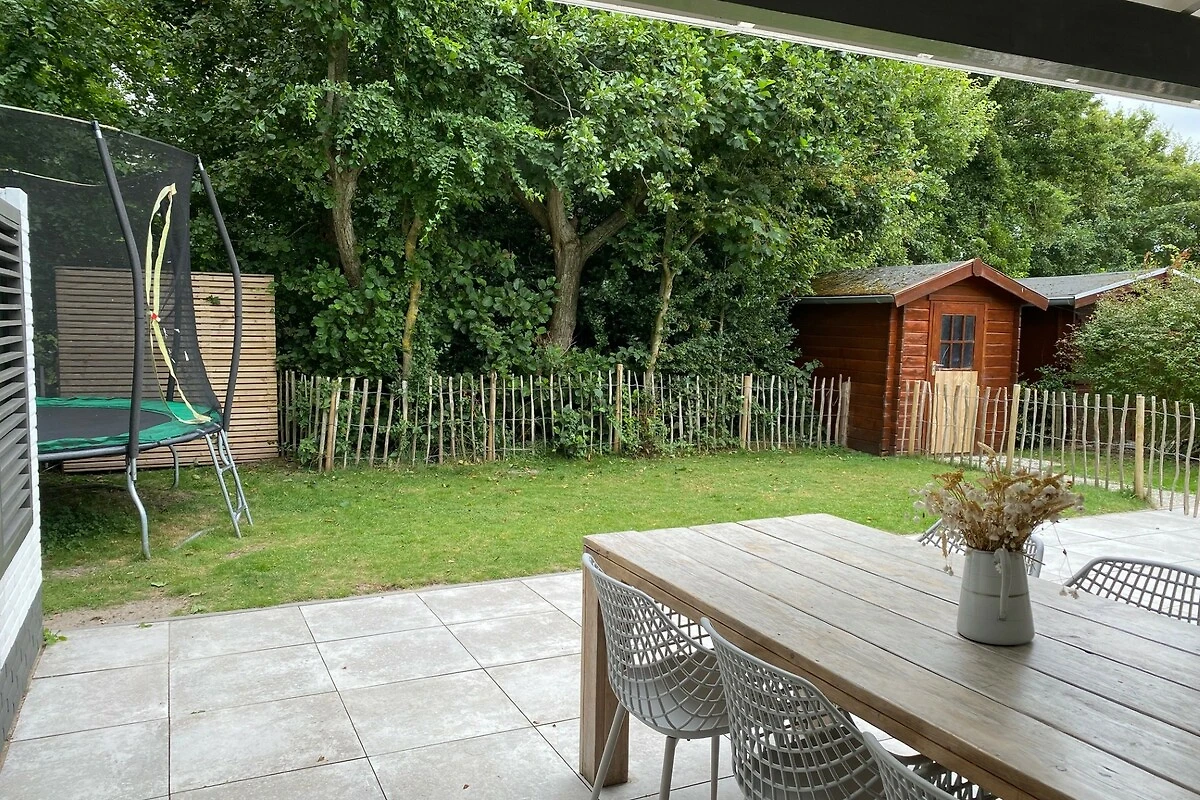 Er is een gedeeltelijk overdekt terras met uitgebreide tuinset en een grote trampoline voor de kinderen.