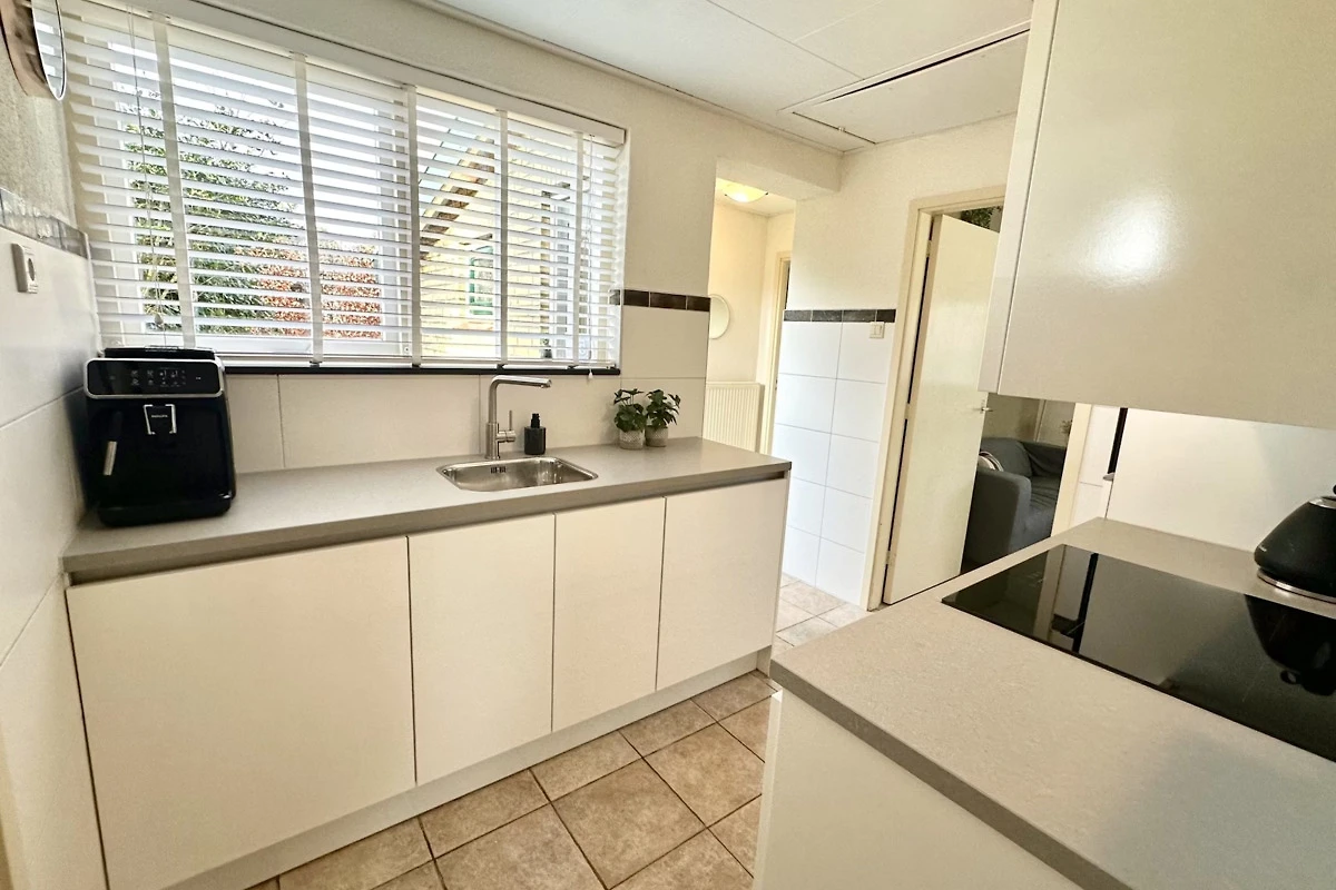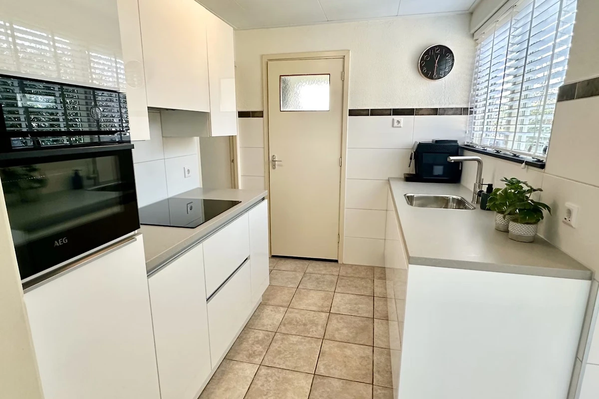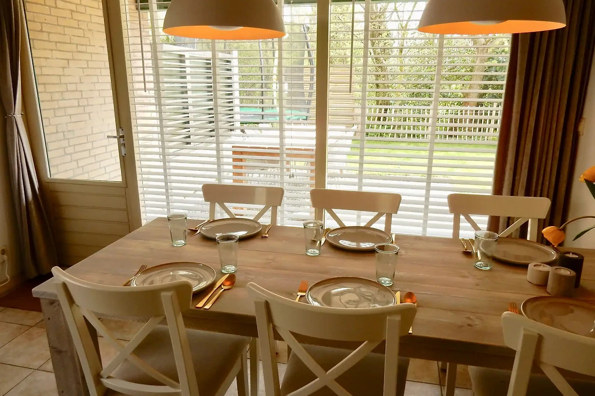 Gezellige woonkamer met houten jaloezieën en uitzicht op de tuin, CV, digitale TV, heerlijke zithoek en gratis WIFI. Moderne keuken met vaatwasser, combi magnetron, koelkast met vriesvak, inductiekookplaat bonen koffiemachine.