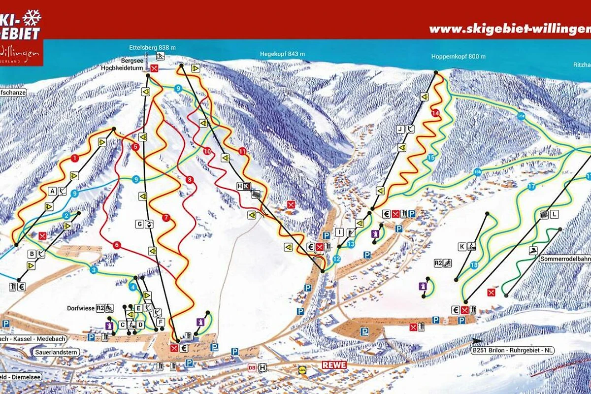 Zomerse strandbaden aan de Diemelsee; voor wandelaars is Willingen met Europa’s grootste hoogheide en acht 800-meter toppen het eerste adres in het Sauerland. Ettelsberg-Hochheideturm – het hoogste uitkijkpunt in Noordwest-Duitsland. Bikepark met wereldbeker-downhillparcours. Een van de top 5 middelgebergte-skigebieden met 15 km panoramapistes, moderne 8-persoons gondelbaan + 11 liften, 6 km verlichte pistes, >90 sneeuwkanonnen, 70 km loipes, EWF-biathlonarena met besneeuwde 2 km verlichte loipe. Niet alleen de après-ski is legendarisch, het is hier het hele jaar door 'Saturday-Night-Fever'. Siggis Ettelsberghütte is cult. Hoogtepunt is het wereldbeker skispringen op de grootste skischans ter wereld!