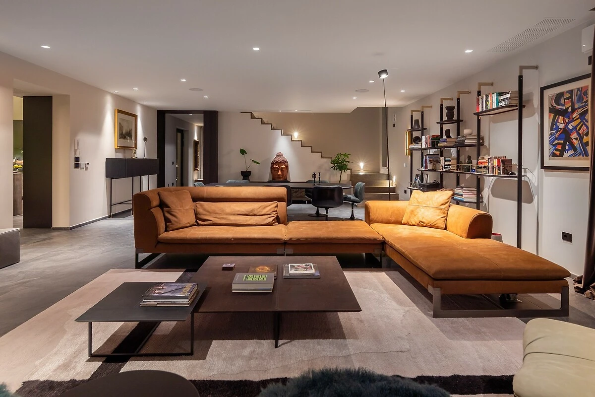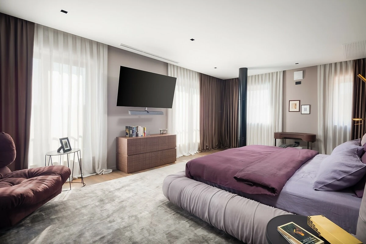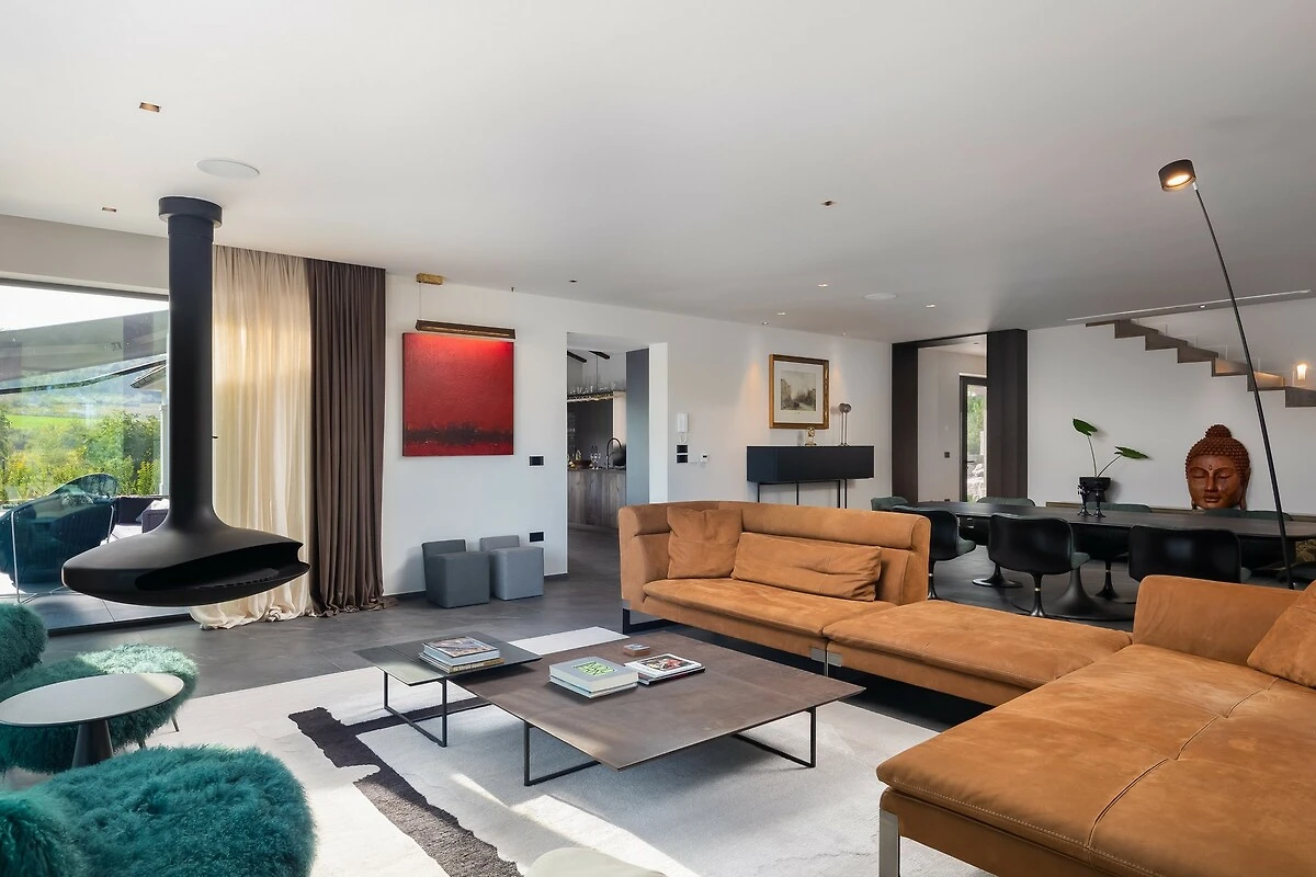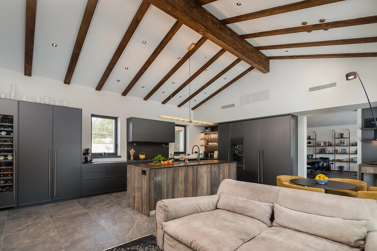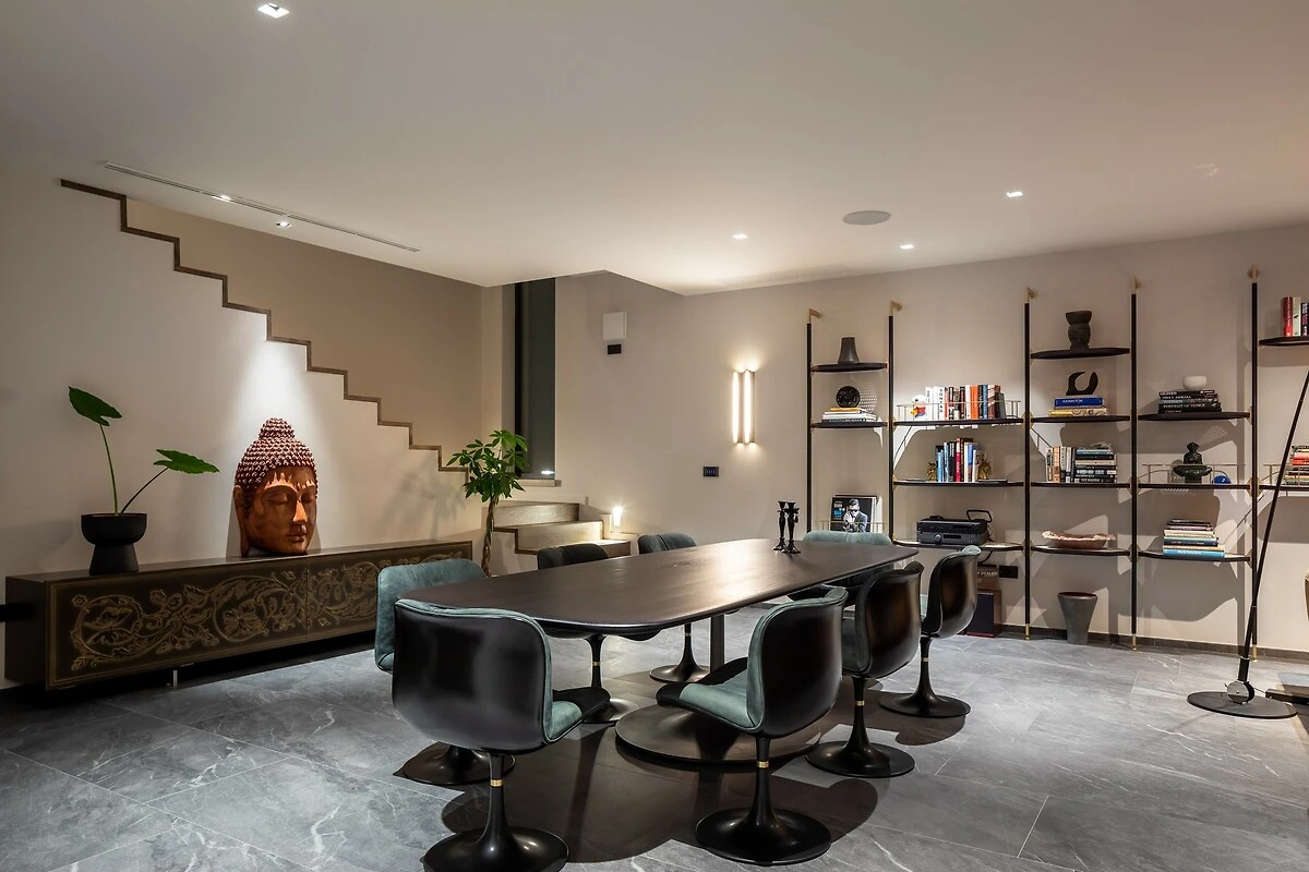 De villa strekt zich uit over ongeveer 500 m² luxe binnenruimte, die een perfecte combinatie van moderne en traditionele elementen vormt. Het interieur kenmerkt zich door elegantie, licht en ruimtelijkheid. Bij het betreden van de villa wordt u verwelkomd door een ruime woonkamer met grote, comfortabele sofa’s en stijlvolle decoratie. Grote panoramavensters verbinden het interieur met het buitenterras en bieden een prachtig uitzicht op de natuur.