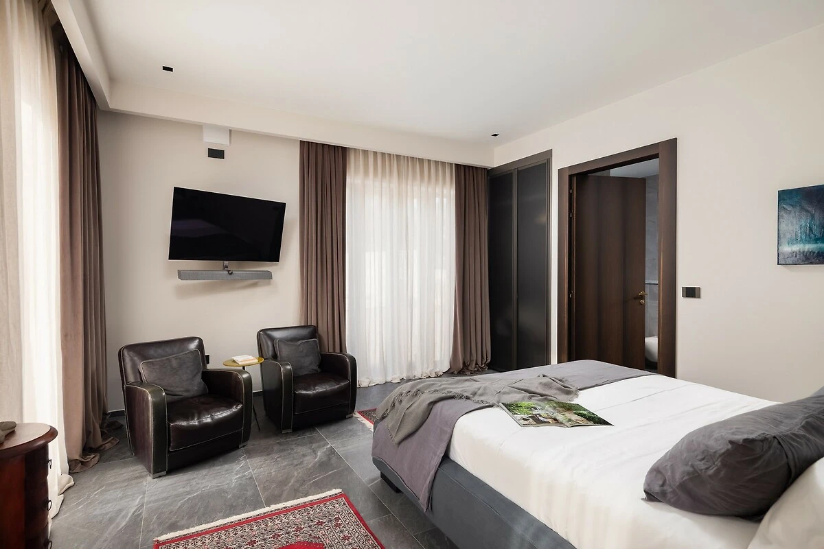 Op de begane grond bevindt zich een ruime slaapkamer met tweepersoonsbed, televisie, airconditioning en kledingkast, evenals een eigen badkamer voor extra comfort. Op de eerste verdieping bevinden zich drie verdere ruime slaapkamers, elk met tweepersoonsbed, televisie, airconditioning, kledingkast en eigen badkamer, waardoor maximaal comfort voor maximaal acht gasten wordt gegarandeerd. In totaal beschikt de villa over vijf badkamers en een extra gastentoilet. De inrichting van de slaapkamers combineert verfijnd modern design met Istrische traditionele elementen, wat een ontspannen en elegante sfeer creëert.