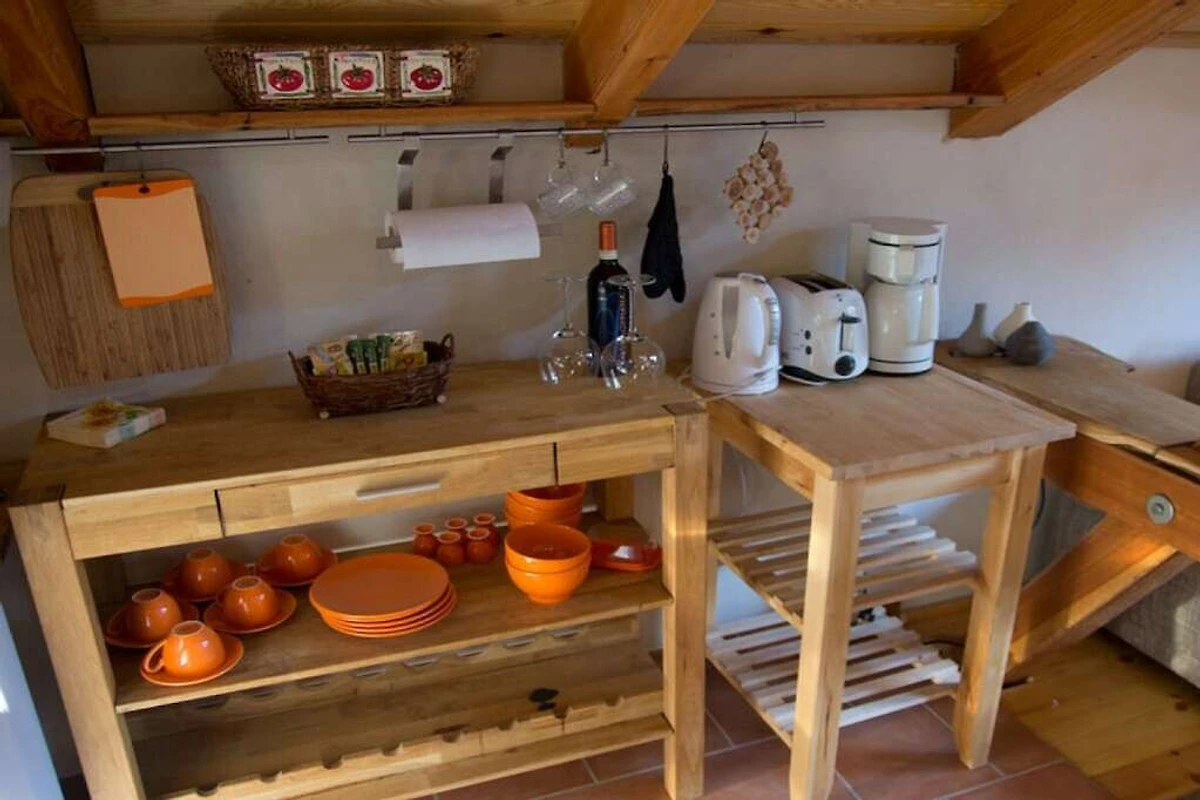 , , open keuken(, kitchenette, kachel, waterkoker, broodrooster, broodrooster, fornuis, koffiezetapparaat, koelkast, vriezer), woon/slaapkamer(, 1-pers. slaapbank, TV, TV, open haard, radio), slaapkamer(1-pers. bed, 2-pers. bed), badkamer(toilet, douche), Internettoegang, Internettoegang, ledikant, balkon(tuinmeubilair), parking