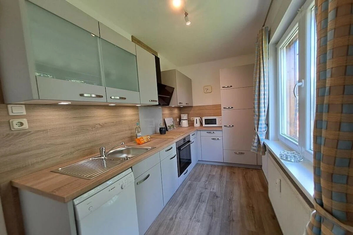 Ons gezellige vakantieappartement voor 2-5 personen bevindt zich op de begane grond. De woon-/eetkamer is voorzien van een tegelkachel, smart-tv en radio. Gratis wifi is beschikbaar.