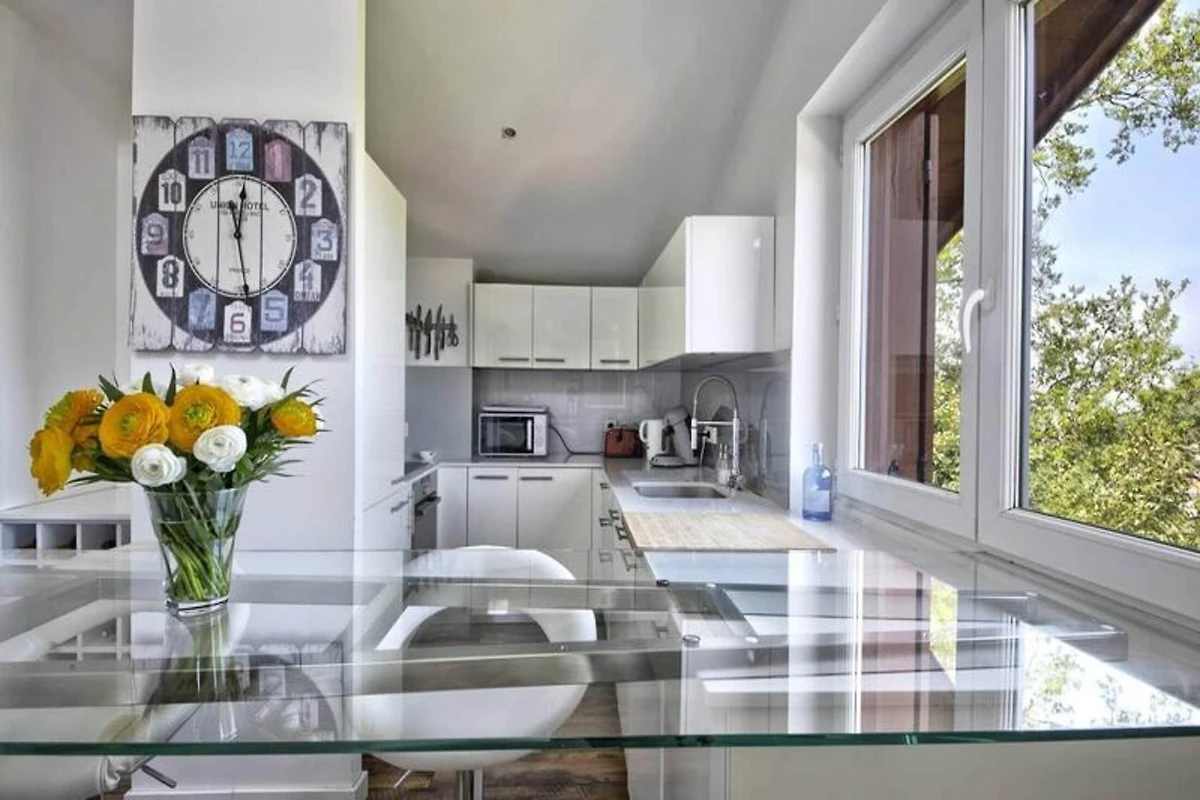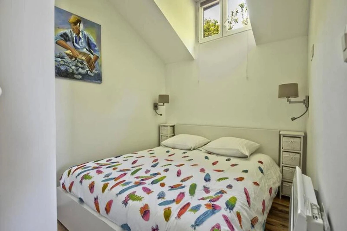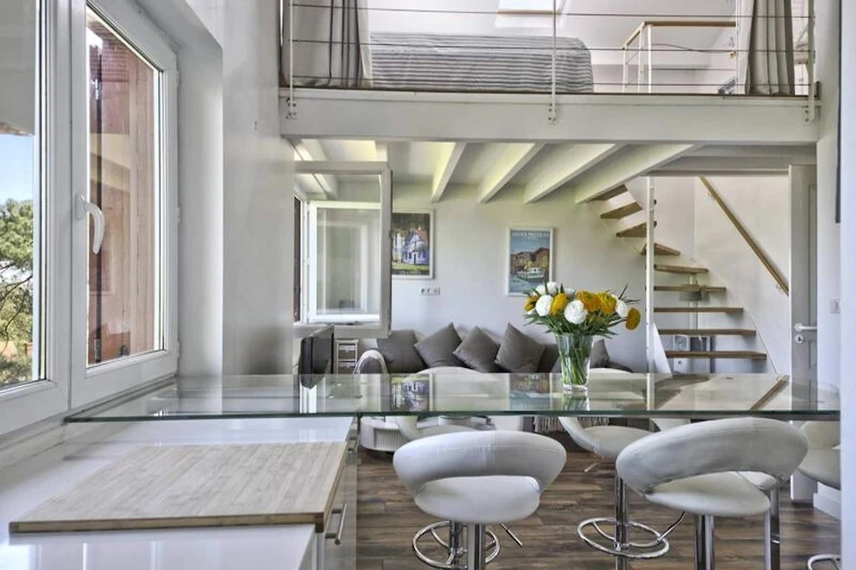 Dit lichte appartement van 60 m² ligt in het hart van de charmante winterstad Arcachon en biedt een prachtig uitzicht op het bekken van Arcachon. Het ligt op slechts 500 meter van het rustige strand Croix des Marins. Het appartement ligt op de tweede en bovenste verdieping van een villa en biedt comfortabel plaats aan maximaal 4 personen, met een grote slaapkamer en een mezzanine. Binnen beschikt de woonkamer over grote ramen die een adembenemend panoramisch uitzicht bieden, terwijl de moderne keuken goed is uitgerust met alle essentiële apparatuur, waaronder een vaatwasser, oven, inductiekookplaat en wasmachine. Een multifunctionele cabineruimte is perfect voor extra opslagruimte of het plaatsen van een babybedje, en een aparte gang leidt naar de badkamer en een toilet met een vermaler.