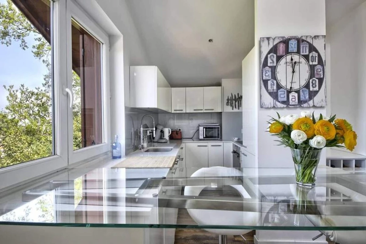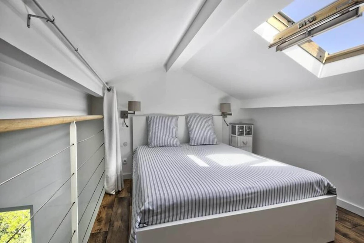 De hoofdslaapkamer, die op het westen ligt, is voorzien van een tweepersoonsbed en voldoende opbergruimte, terwijl de mezzanine een extra tweepersoonsbed biedt en voldoende opbergruimte, verlicht door Velux-ramen. Het appartement heeft ook natuurlijk licht dat binnenvalt via de ramen in de badkamer en de keuken, waardoor er overal een verfrissende sfeer ontstaat.