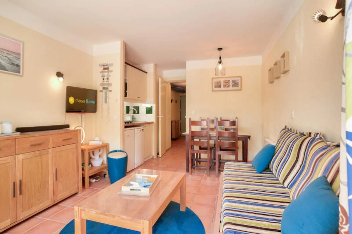 Dit charmante appartement ligt in de buurt van fijne zandstranden en is geschikt voor maximaal 4 personen. Het biedt een rustig verblijf midden in de natuur. De unit beschikt over een gezellige woonkamer met een slaapbank, een slaapkamer met een tweepersoonsbed en een badkamer met ligbad. De accommodatie is huisdiervriendelijk (tegen betaling) en beschikt over een eigen parkeerplaats buiten. Gasten hebben ook toegang tot een verwarmd buitenzwembad met peuterbad, solarium en terras, beschikbaar van half juni tot half oktober.