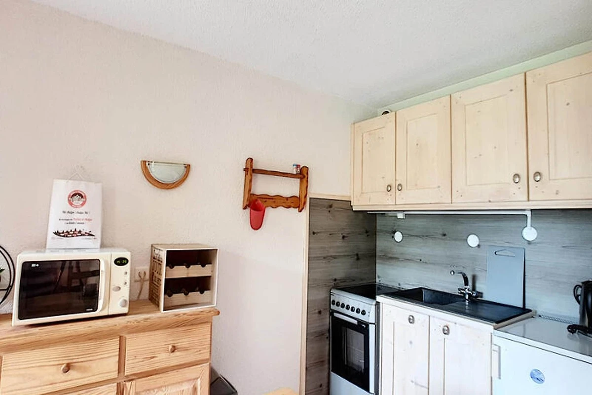 De studio is goed uitgerust met een keukengedeelte met een filterkoffiezetapparaat en een eetruimte voor vier personen. De badkamer beschikt over een douche, wastafel en toilet. Gasten hebben toegang tot een verwarmd binnenzwembad, ideaal om te ontspannen na een dag vol avontuur. Een balkon met uitzicht op het noorden op de Aulps-vallei biedt een schilderachtige plek om te ontspannen, terwijl extra voorzieningen zoals een raclettemachine, fondueset en een elektrische barbecue zorgen voor een comfortabel en aangenaam verblijf.