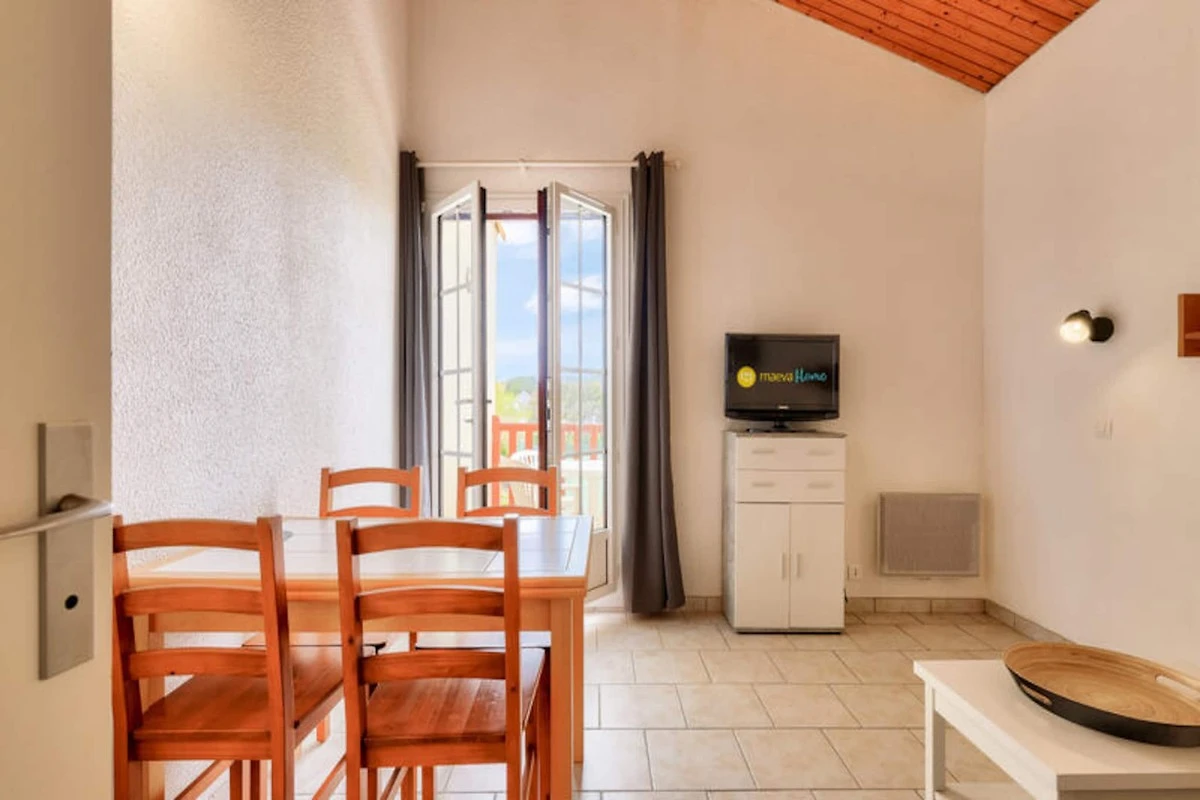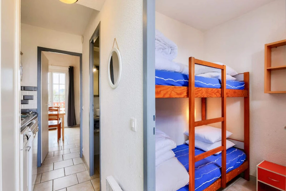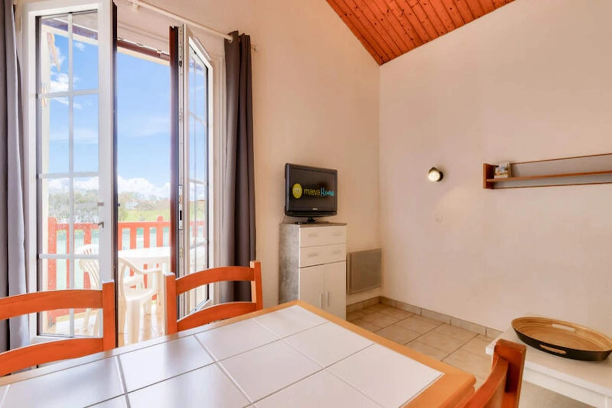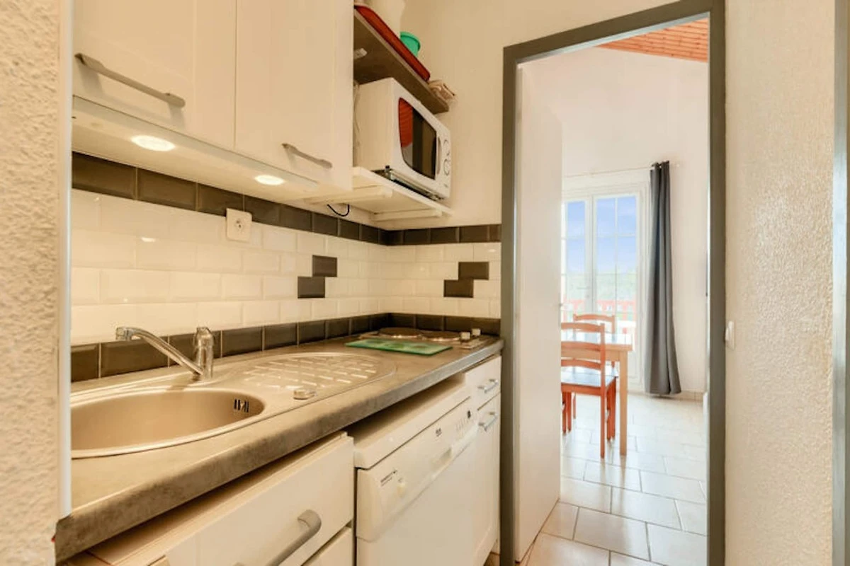 Het appartement beschikt over een volledig uitgeruste keuken waar u maaltijden kunt bereiden, en een apart toilet voor extra gemak. De residentie biedt gratis parkeergelegenheid en gasten hebben toegang tot verwarmde zwembaden en een watergebied met glijbanen en peuterbaden. Extra voorzieningen zijn onder andere Wi-Fi (tegen betaling), een televisie en diverse recreatieve mogelijkheden, zoals minigolf en tennis.