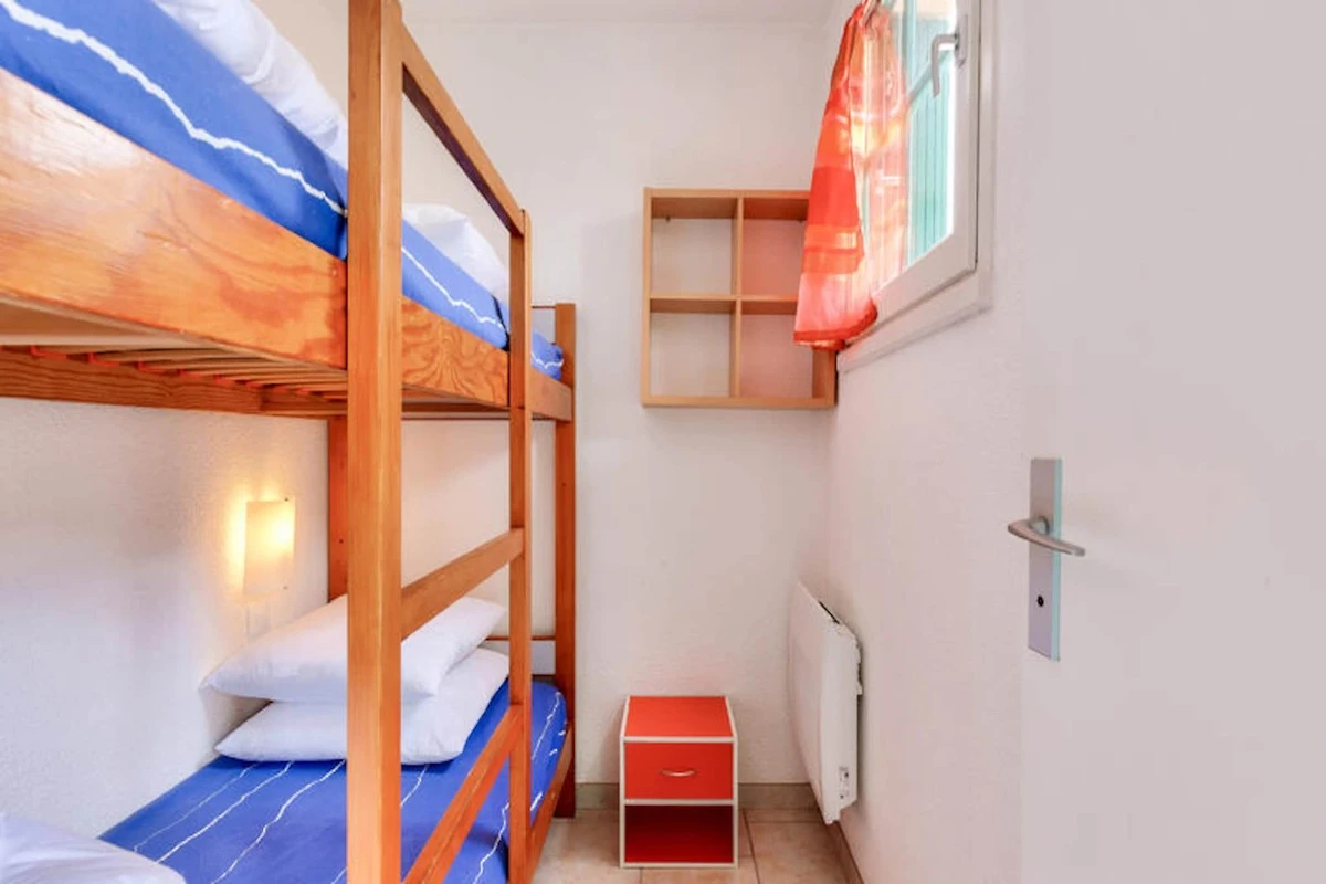 Dit charmante appartement biedt een comfortabel verblijf voor gezinnen of kleine groepen en beschikt over een woonkamer met een slaapbank, een cabinegedeelte met stapelbedden en een badkamer met een douche. De woning is geschikt voor maximaal vier personen en is uitgerust met essentiële voorzieningen zoals een televisie en een salontafel. Het balkon biedt een sereen uitzicht op de golfbaan, waardoor een rustige omgeving ontstaat om te ontspannen. In bepaalde accommodaties zijn huisdieren toegestaan. Er kunnen extra kosten van toepassing zijn. Op verzoek is er een babypakket beschikbaar. Beddengoed en handdoeken zijn beschikbaar tegen een toeslag. De eindschoonmaak is verplicht en dient bij aankomst te worden betaald.