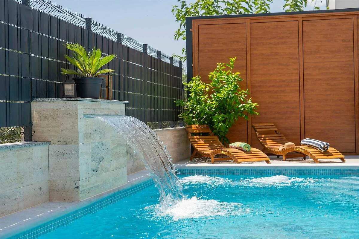Buiten werkt alles in uw voordeel. Het privézwembad met hydromassage en waterval, ligstoelen en schaduwrijke zitjes, biedt uw groep een thuisbasis tussen strandwandelingen en stadsnachten. De avonden worden doorgebracht rond de houtgestookte stenen barbecue, omringd door mediterrane planten en de warme kustlucht.