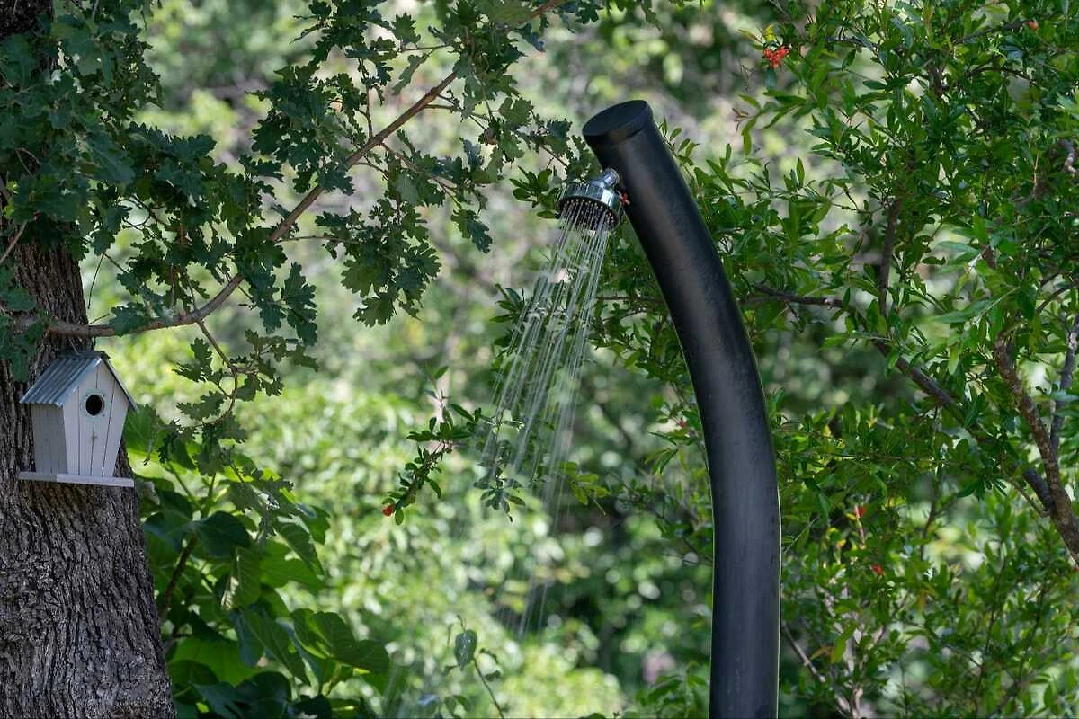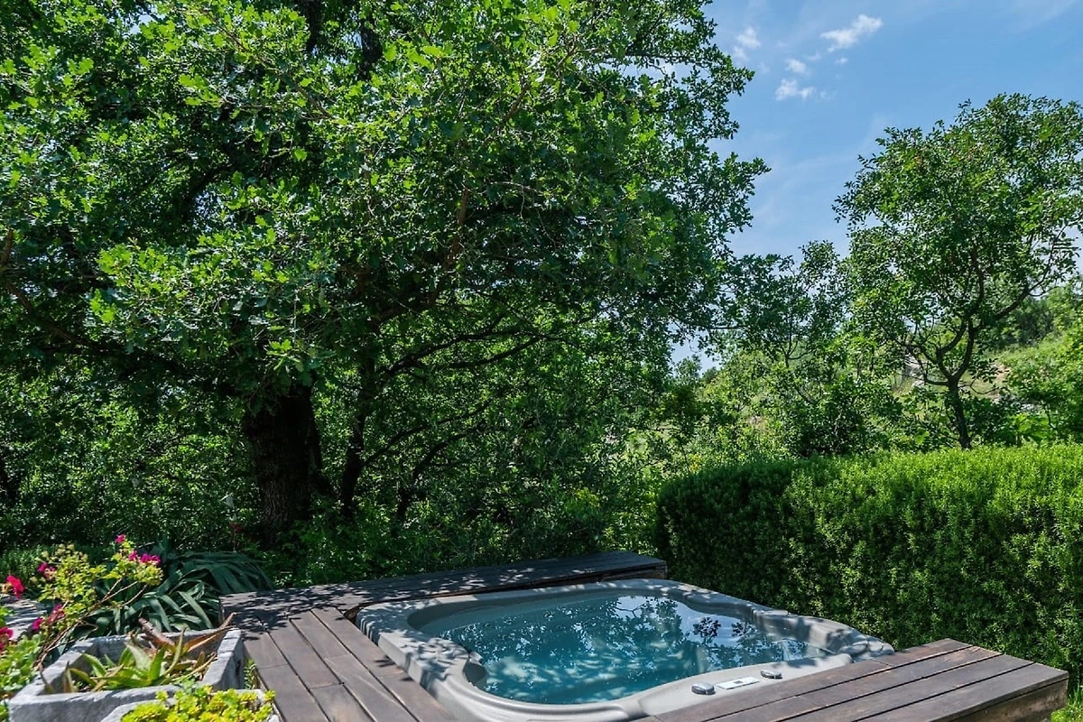 Het omheinde terras met whirlpool, ligstoelen, parasol, buitendouche, tuinmeubilair en barbecueplaats is omgeven door mediterrane vegetatie. Parkeerplaatsen zijn op het terrein beschikbaar.