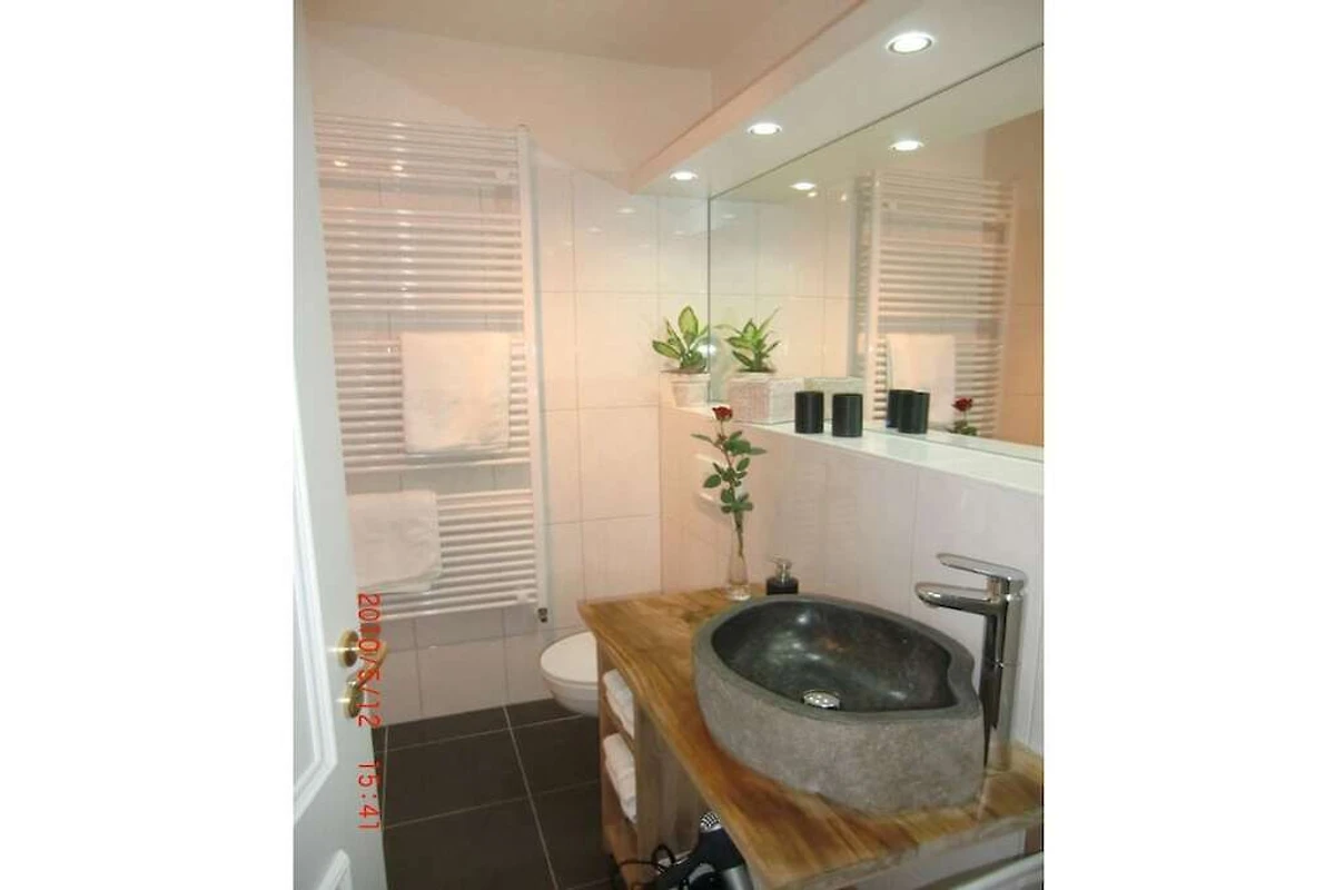 Tussenetage: (open keuken(fornuis, oven, koelkast), slaapkamer(, , 2-pers. bed, 2-pers. bed), slaapkamer(, , 2-pers. bed, 2-pers. bed), badkamer(, toilet, douche, wastafel))