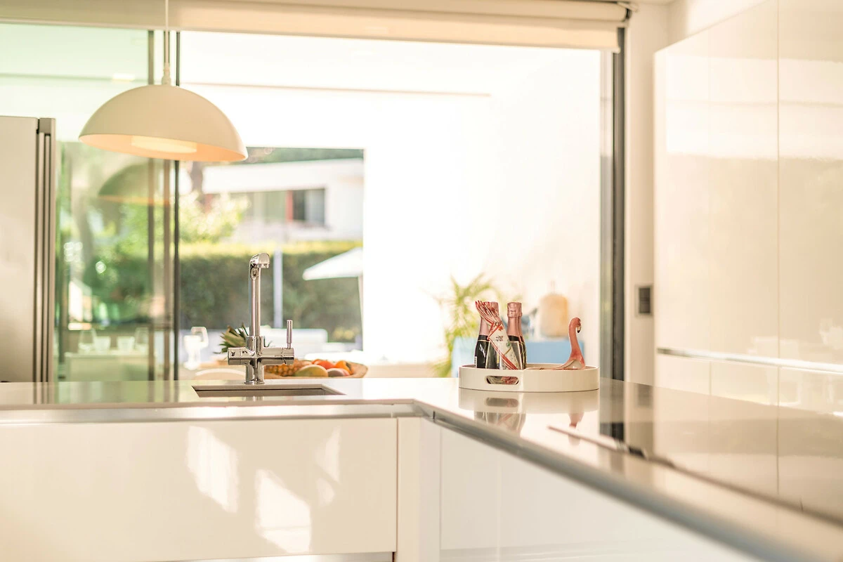 De aparte keuken, is uitgerust met koelkast, magnetron, oven, vriezer, vaatwasmachine, servies/bestek, keukengerei, koffiezetapparaat, broodrooster en waterkoker.