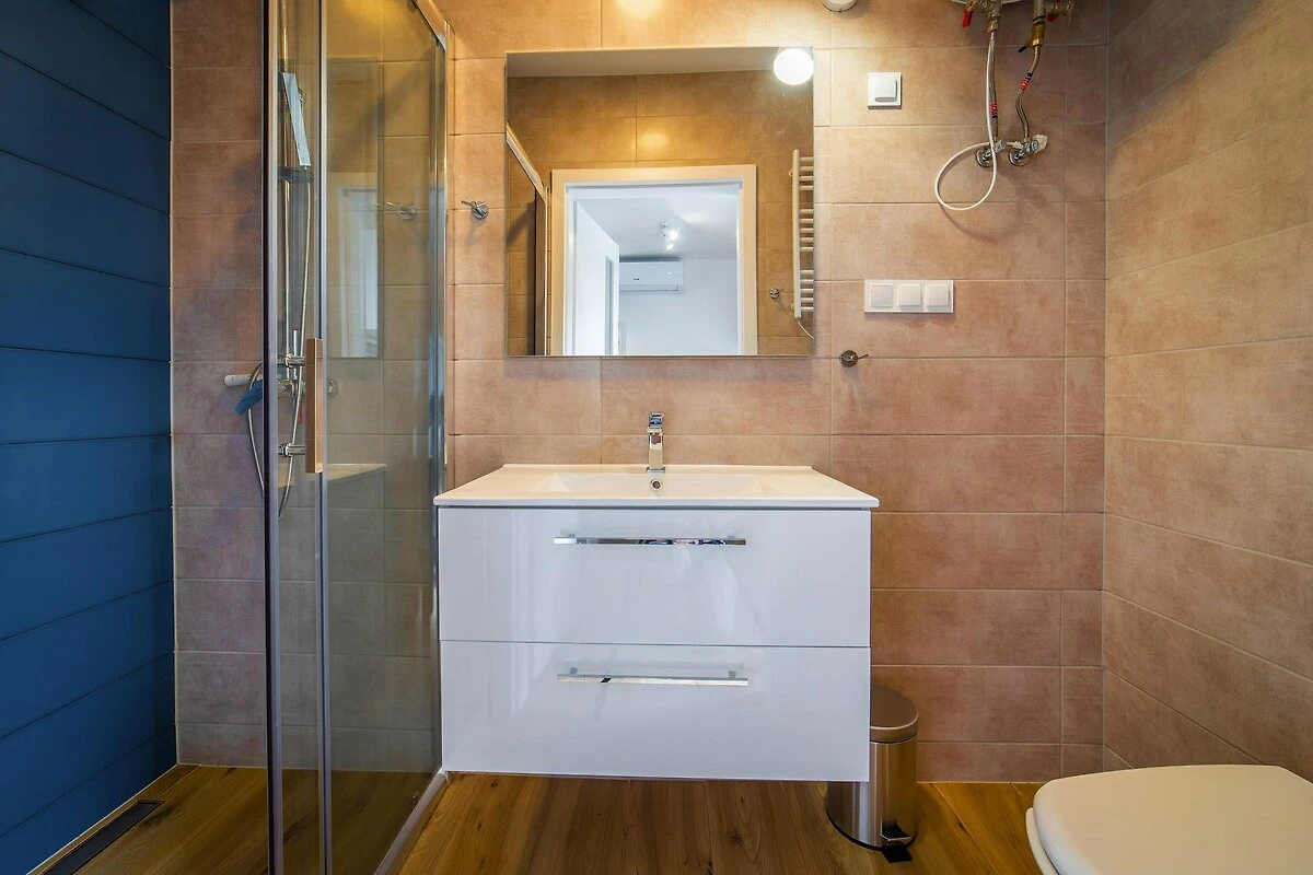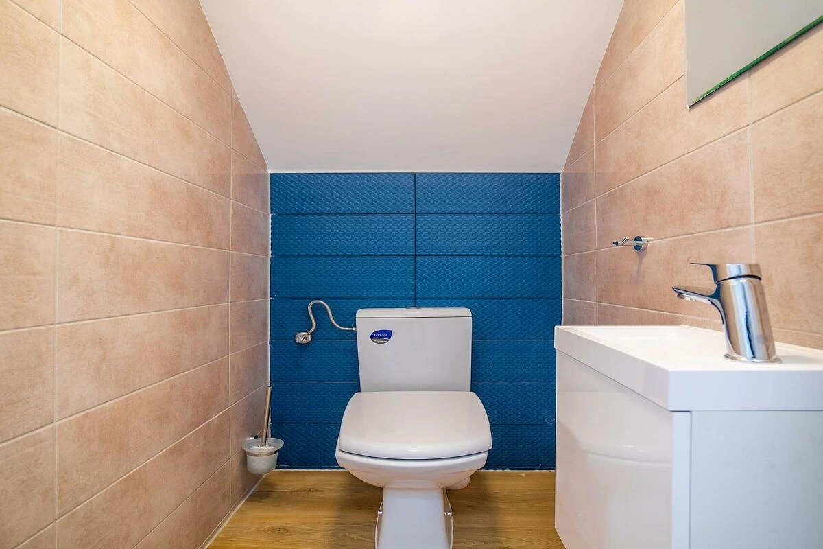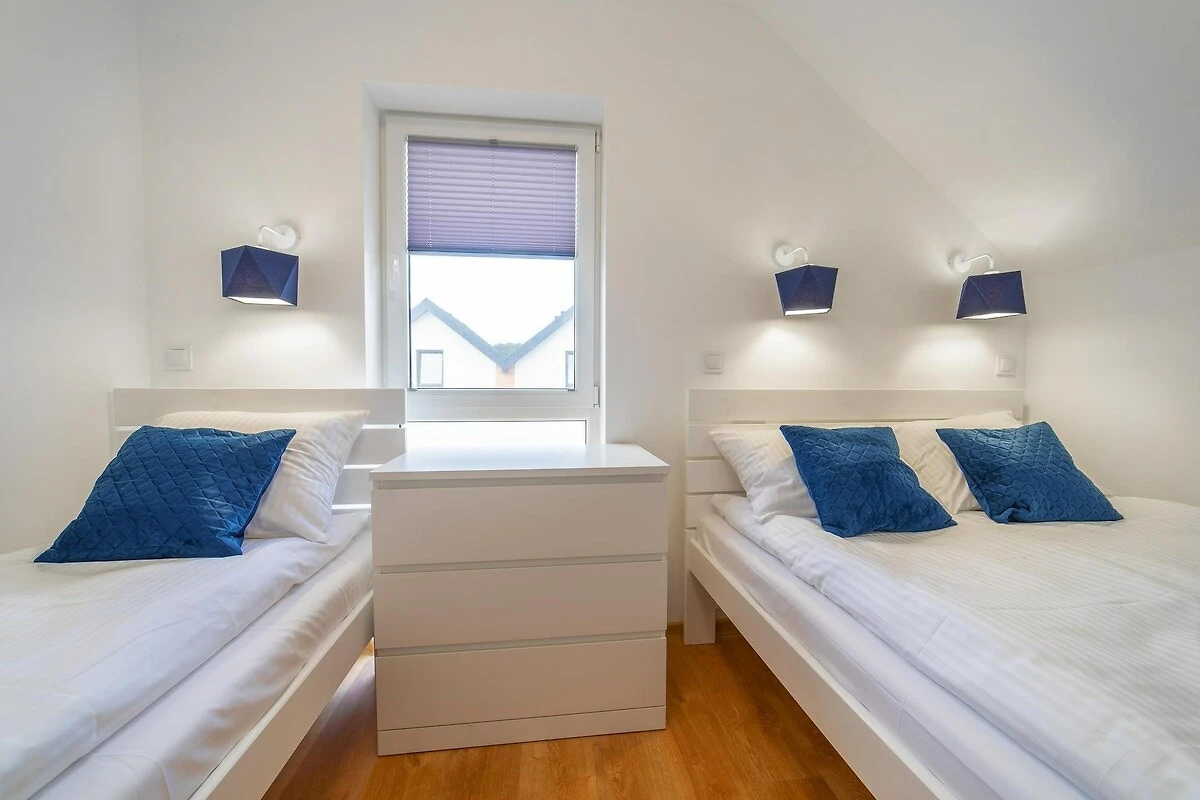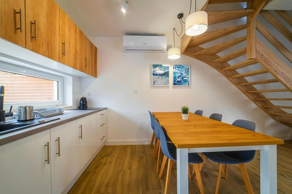 Comfortabele vakantiehuizen van twee verdiepingen met een oppervlakte van 50 m2. Elk met een terras en een eigen tuin (20 m2), voorzien van tuinmeubelen en barbecuebenodigdheden. Op de begane grond een ruime woonkamer (dubbele uitklapbare bank, TV, tafel) met een kitchenette en een badkamer met douche. Boven zijn er 2 aparte slaapkamers en een extra toilet. Er is airconditioning met koel- en verwarmingsfuncties. Draadloos internet is beschikbaar.