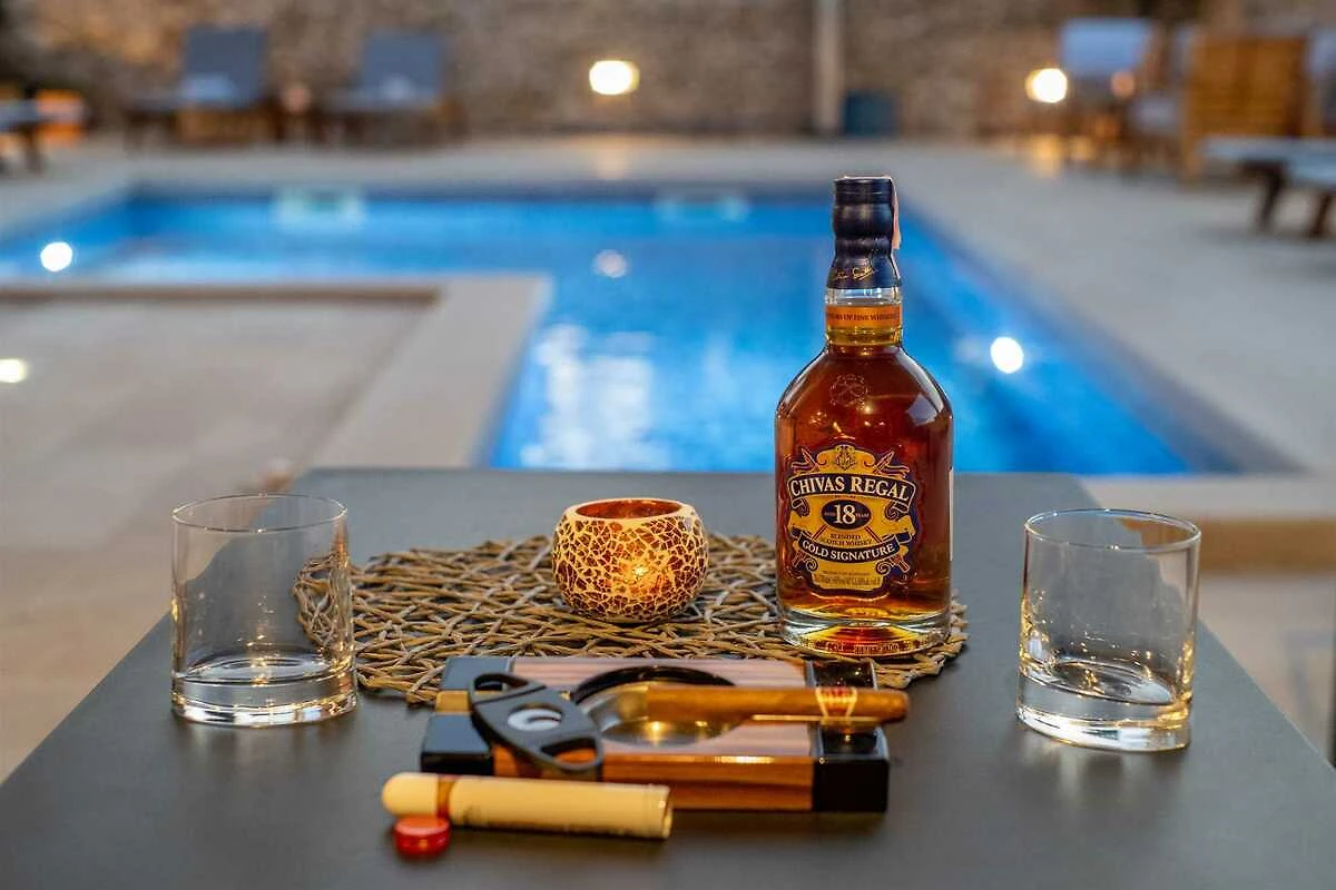De keuken is uitstekend uitgerust: koelkast met dubbele deur, magnetron, oven, vaatwasser, keramische kookplaat, koffiezetapparaat, ijsblokjesmachine, sapcentrifuge en alle andere benodigde apparaten – de uitrusting van de hele villa is overal van het hoogste niveau.