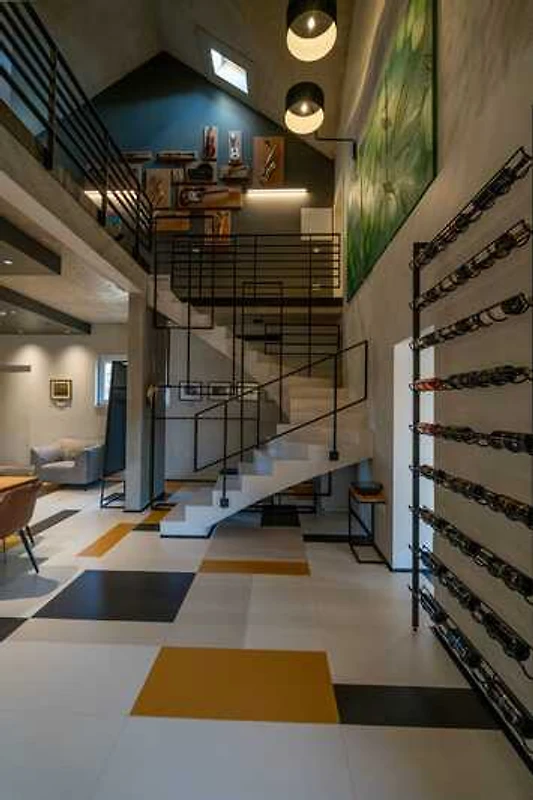 Woonkamer, kantoor en keuken liggen op slechts enkele stappen van het zwembad met zonneterras. De begane grond is via een ogenschijnlijk zwevende trap – een van onze favoriete details – verbonden met de galerij. Boven aangekomen bevindt zich een kleine salon naast een voorruimte, van waaruit een metalen trap naar een charmante kamer van 12 m² leidt. Deze bevindt zich helemaal boven onder het dak, beschikt over een dakraam, een tweepersoonsbed en een televisie en is op het westen gericht. Vanuit de voorruimte komt men bovendien in een 6 m² grote badkamer met bad.