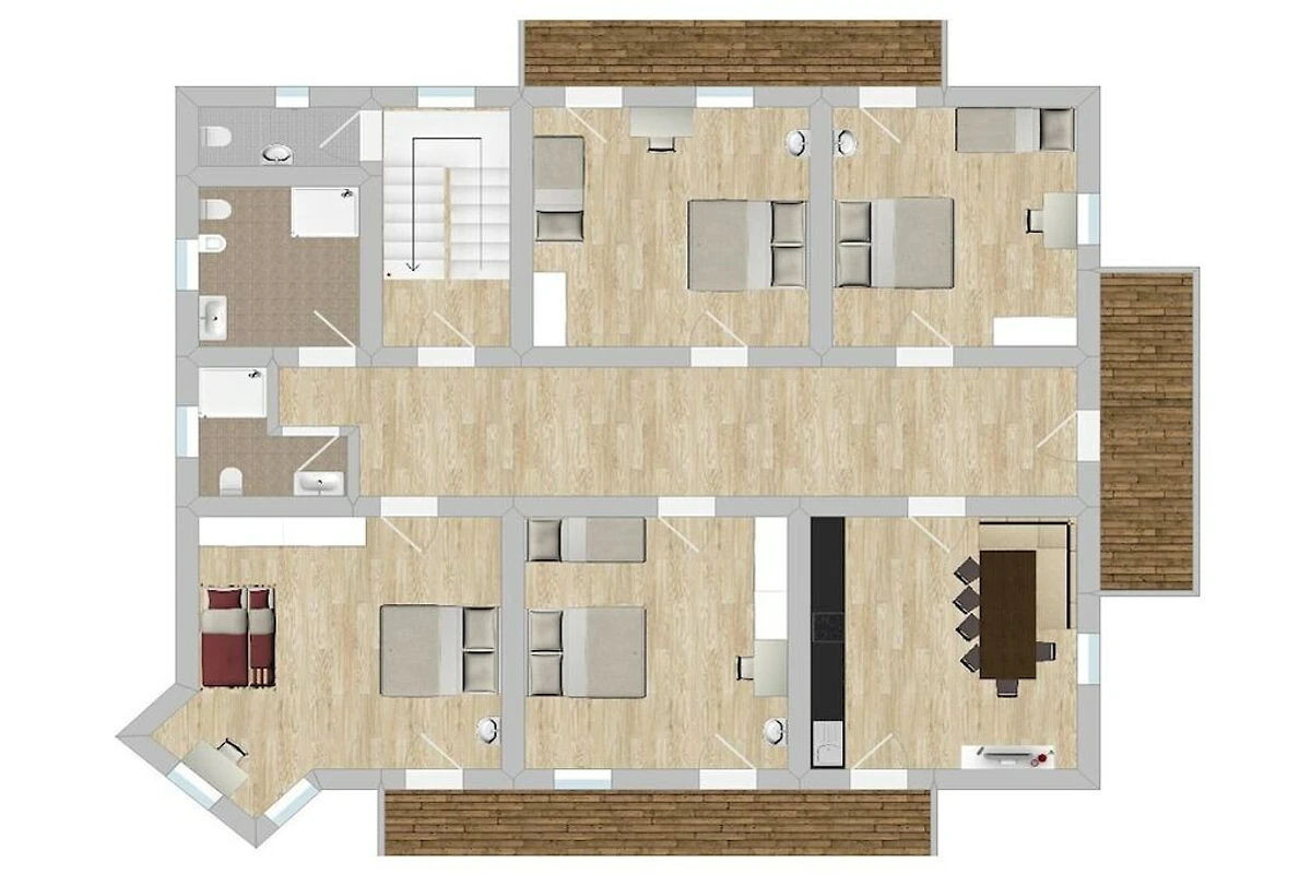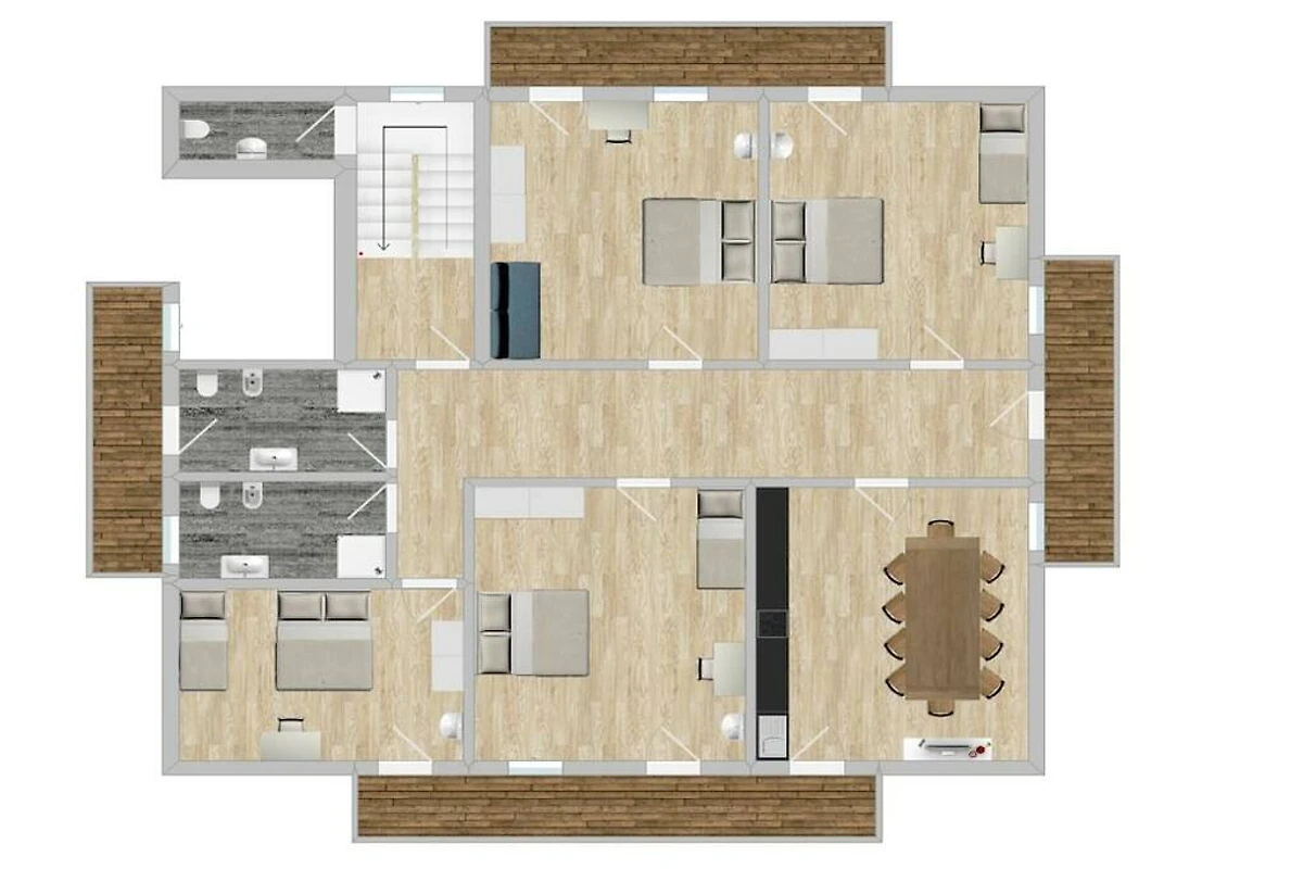 Het appartement bevindt zich op een eigen verdieping en beschikt over 5 slaapkamers, elk met een eigen wastafel. De grote woonkeuken biedt een comfortabele ruimte om gezellig samen te zijn. Geniet van het zonnige balkon met uitzicht op Kronplatz!